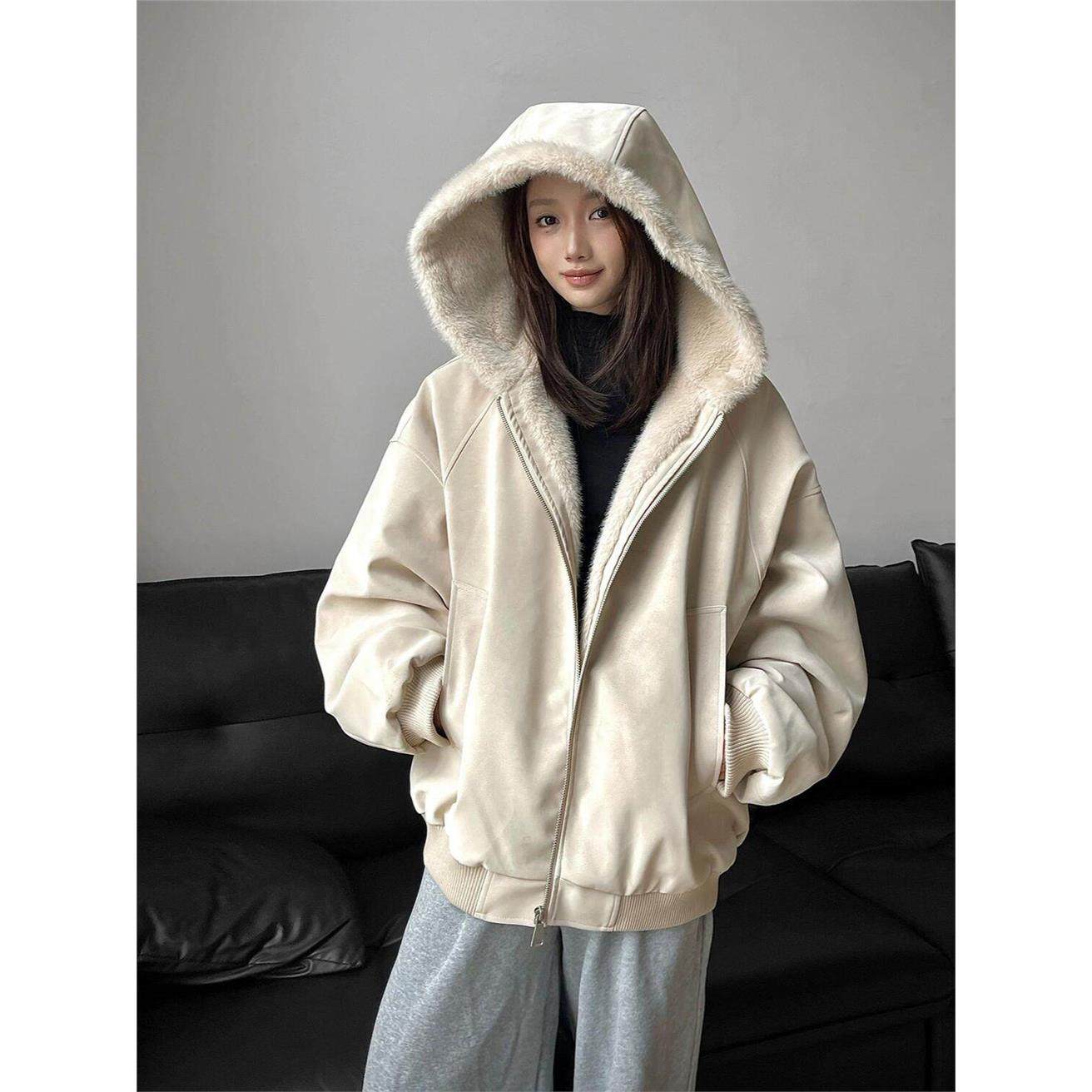 美式连帽座山雕皮衣外套棉服男女款冬季加绒加厚保暖毛领棉衣夹克