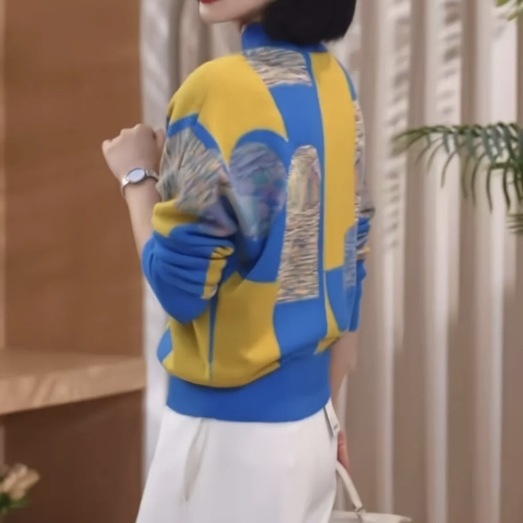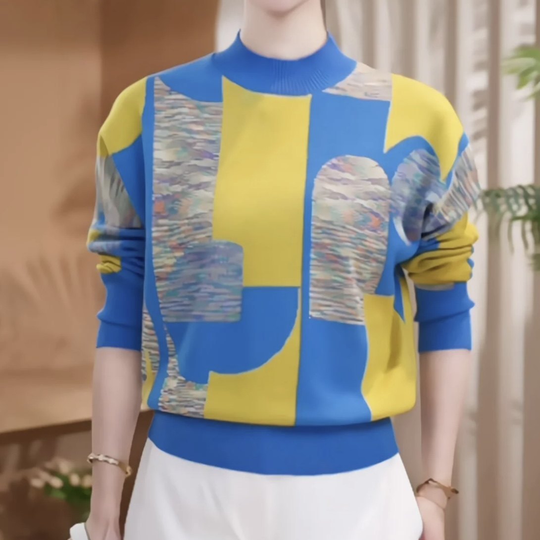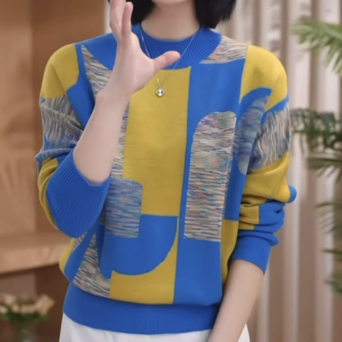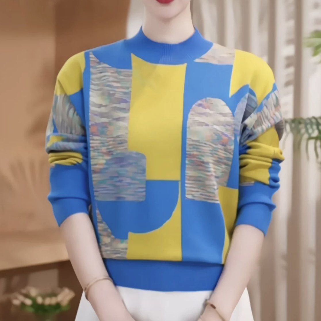 春季百搭拼色休闲洋气高档减龄针织衫圆领妈妈潮流显瘦外搭毛衣女