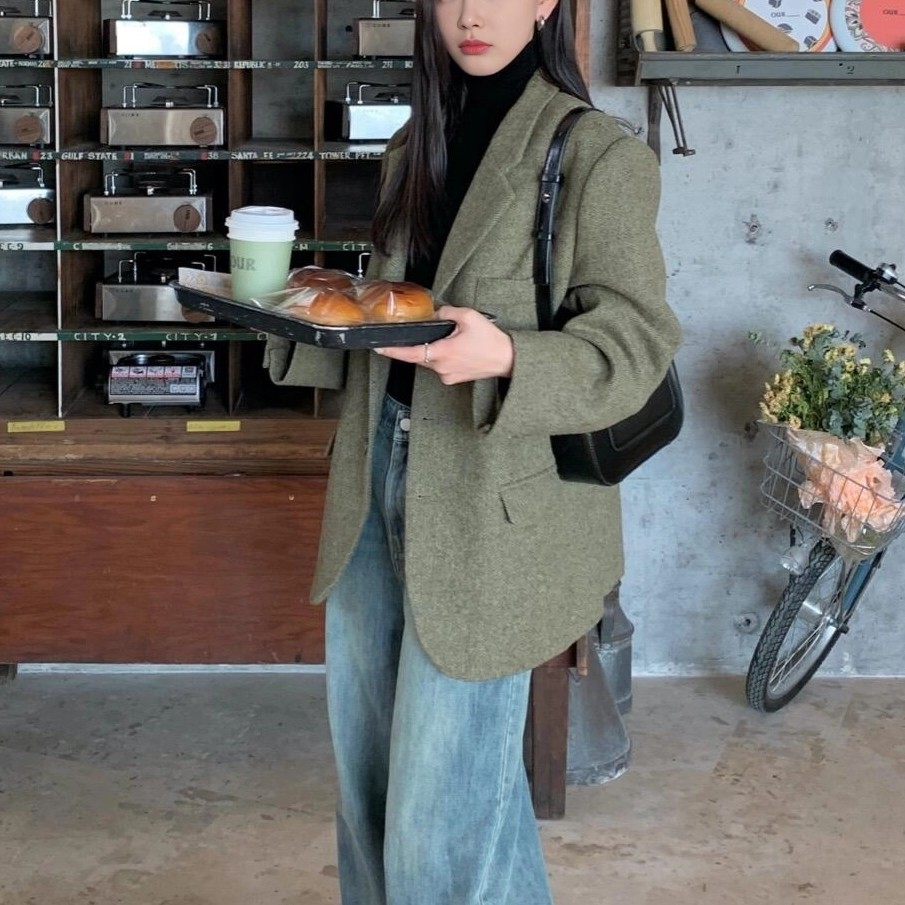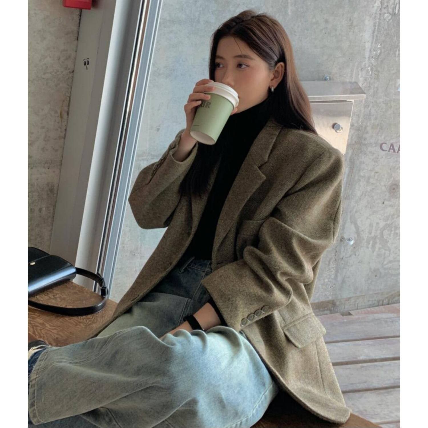 韩版人字纹羊毛呢夹棉小西装外套女2025秋冬季复古休闲高级西服