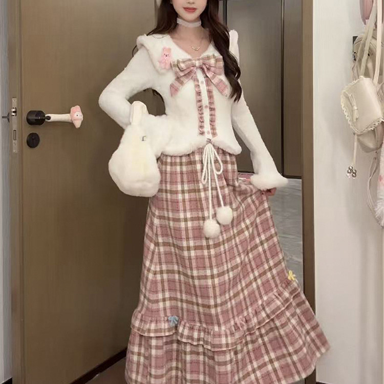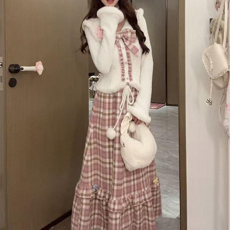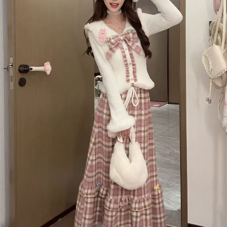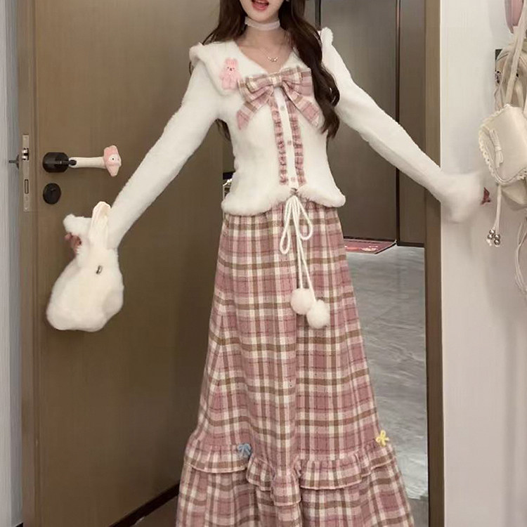 千金感温柔风套装女秋冬甜美氛围感蝴蝶结针织上衣粉格长裙两件套