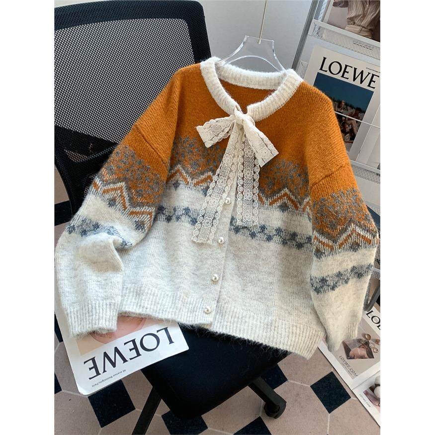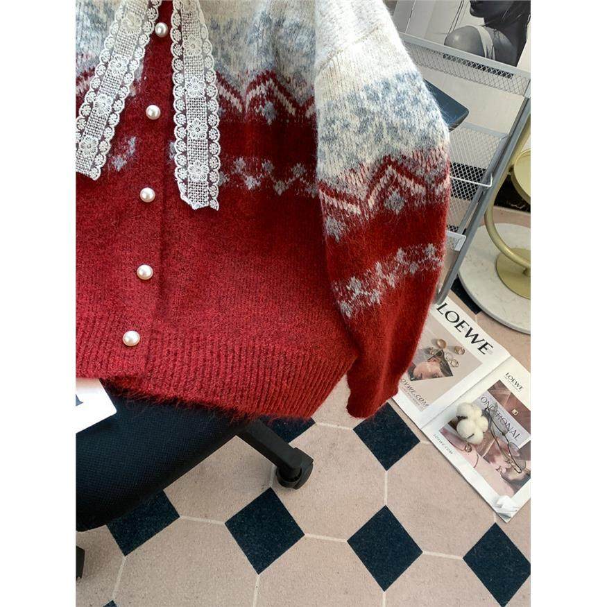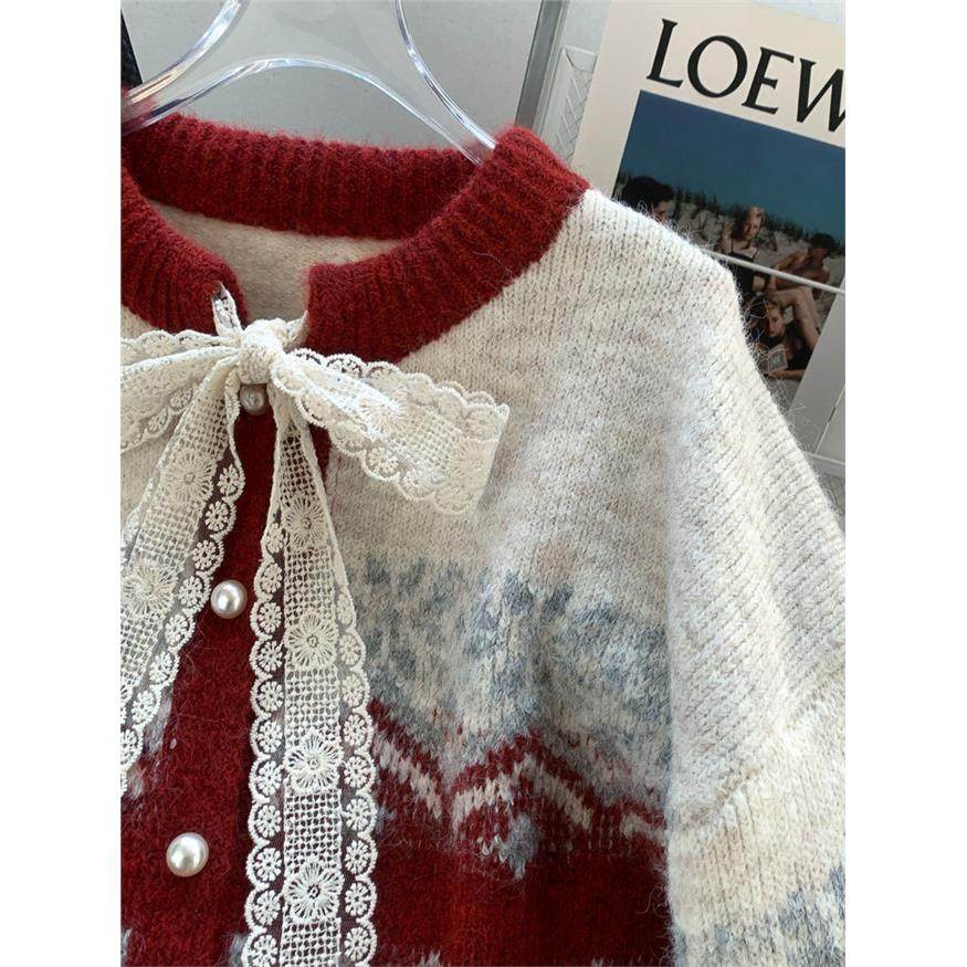 费尔岛覆古提花红色圣诞毛衣外套女设计感甜美蕾丝蝴蝶结针织开衫