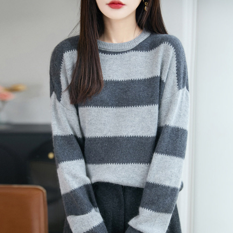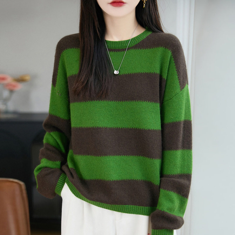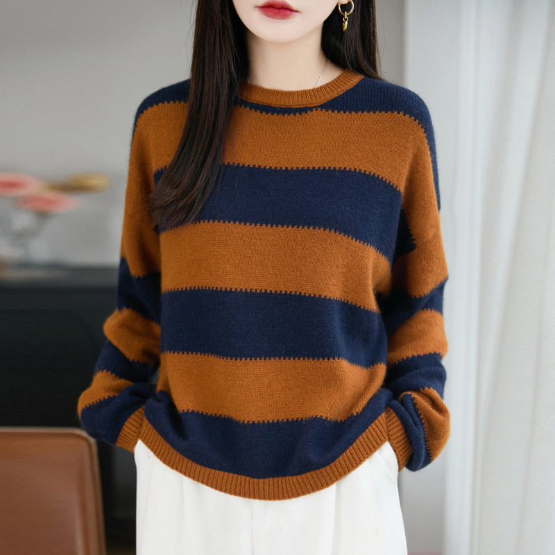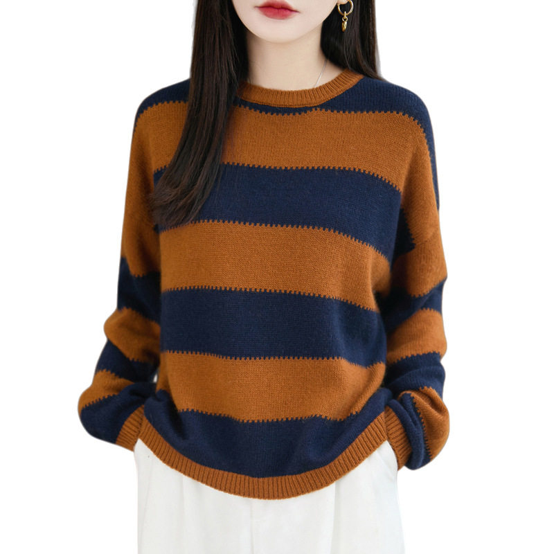 撞色宽条纹圆领套头毛衣女秋冬宽松百搭新款针织衫打底上衣