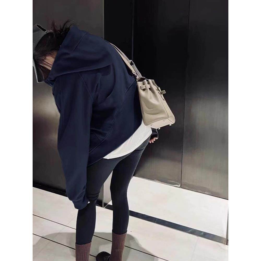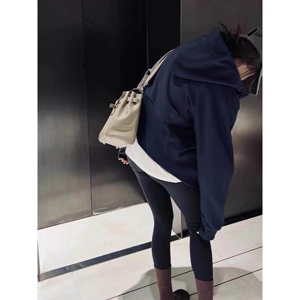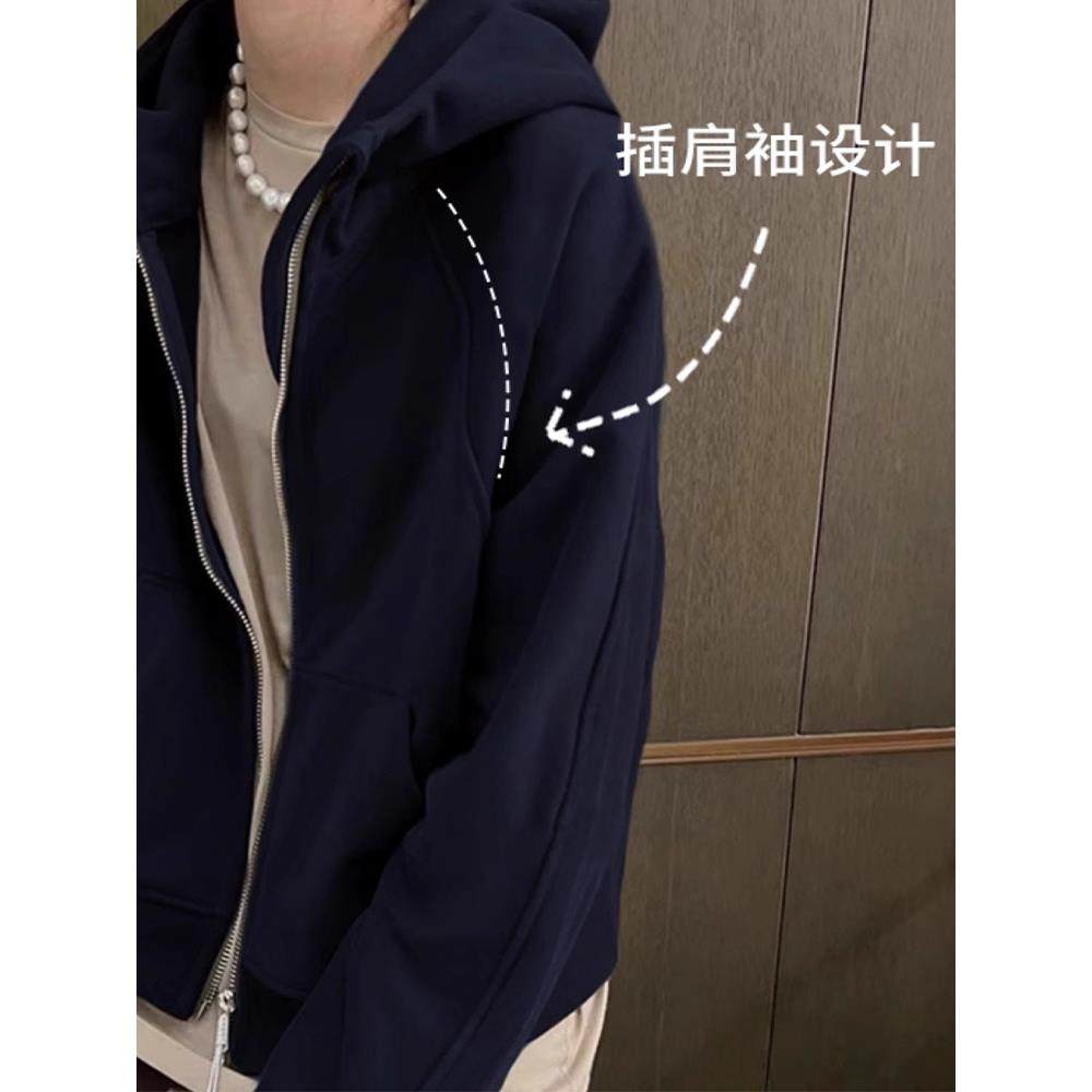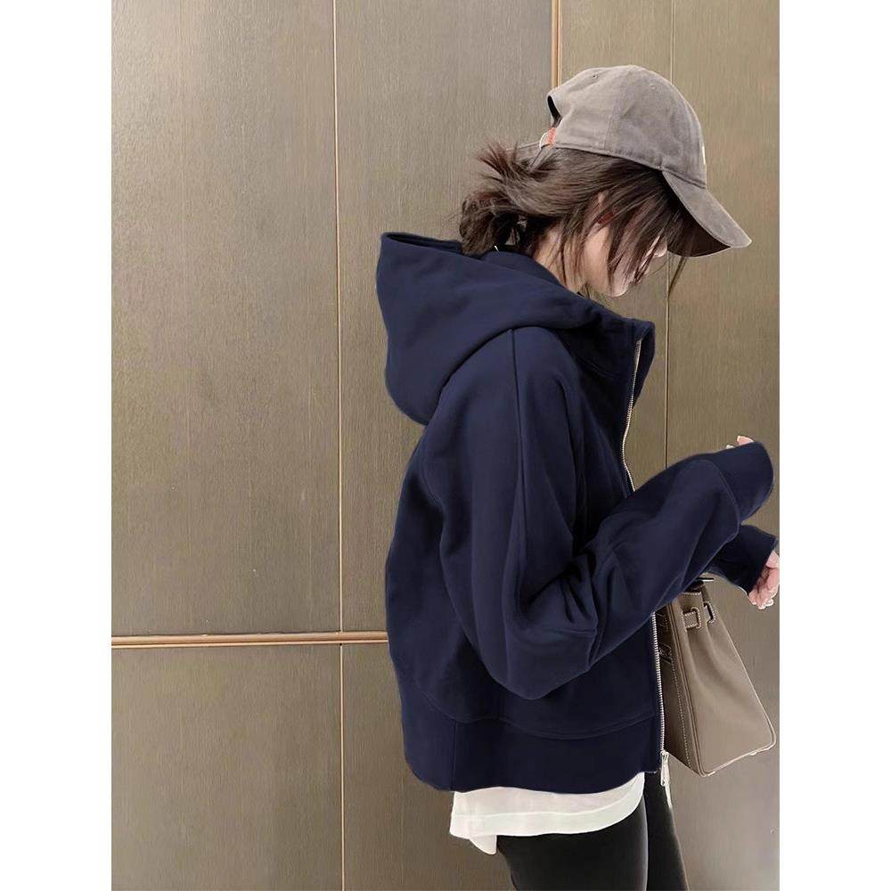 藏青色连帽卫衣外套女2025秋春穿搭运动休闲百搭短款拉炼开衫上衣