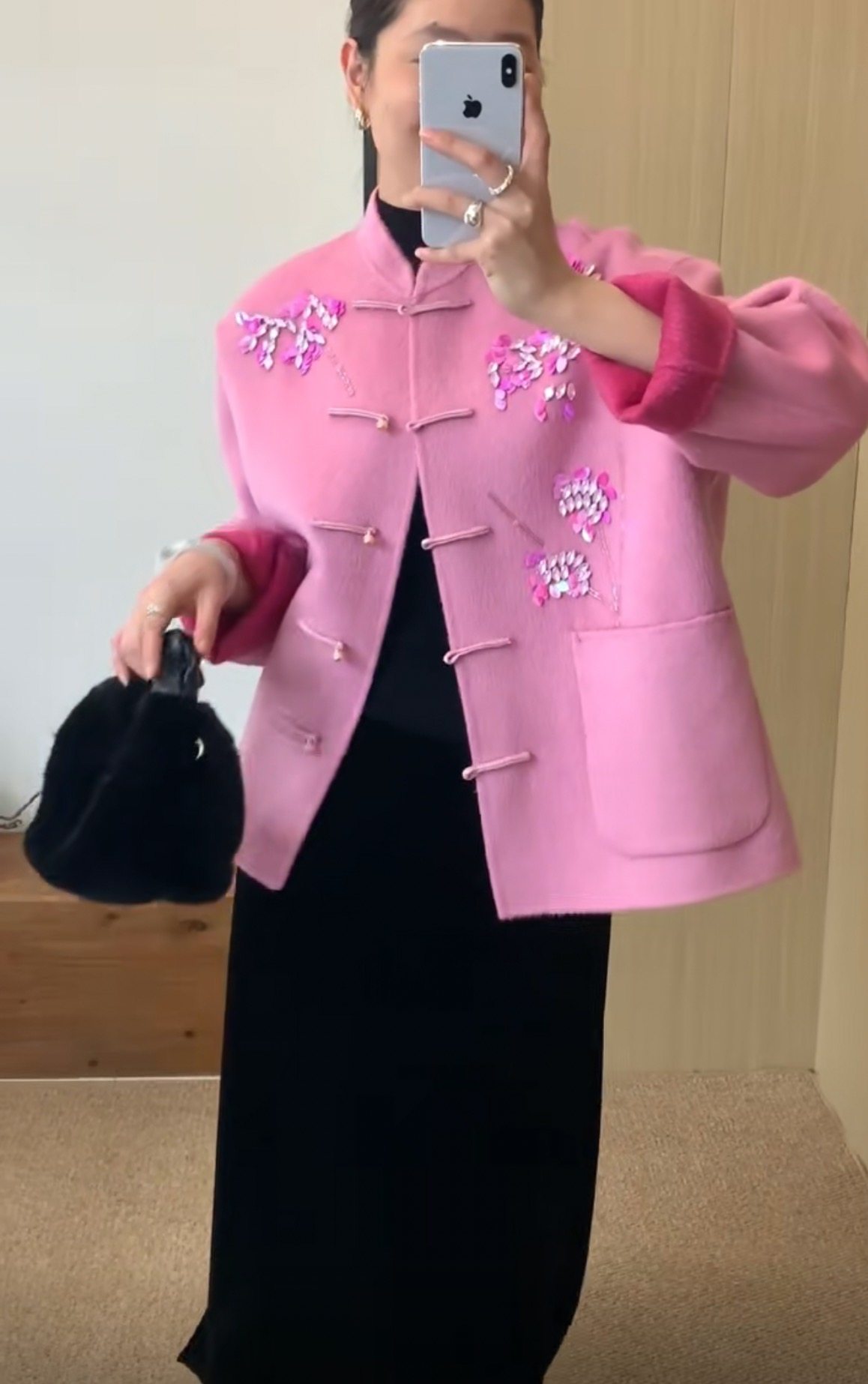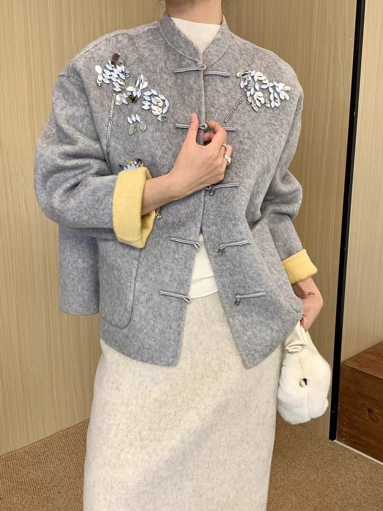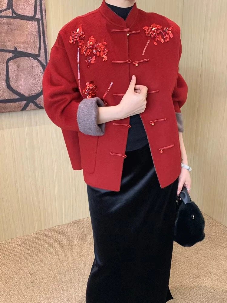 2025中式国风重工钉珠镶钻羊毛外套女高级感立领双面毛呢上衣