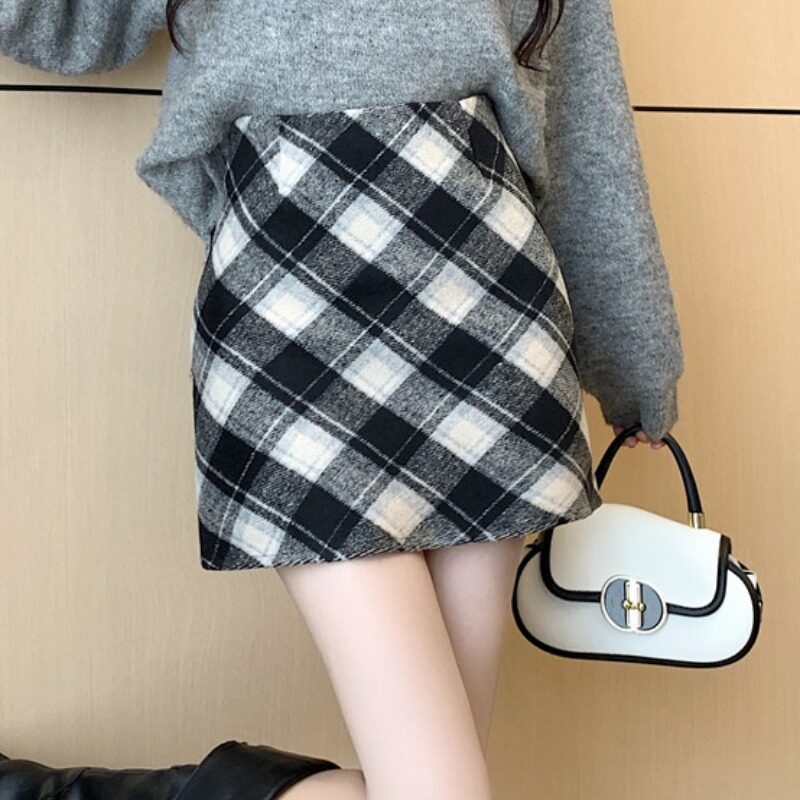 港味chic风复古拼色格子包臀短裙大码女装胖MM修身显瘦A字半身裙