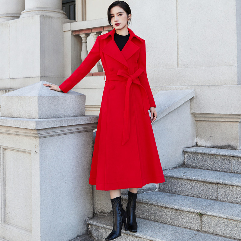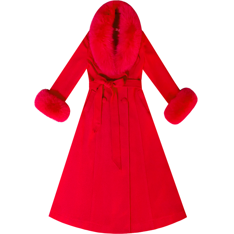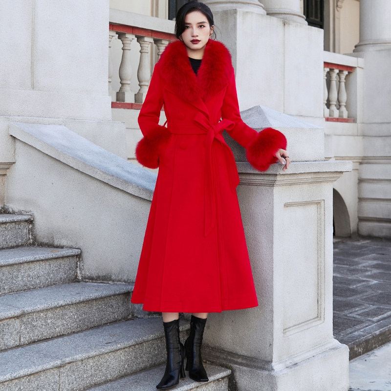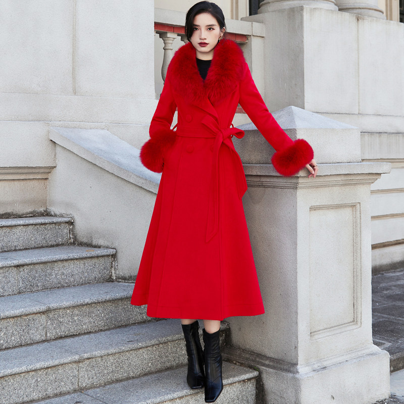 大红色西装领羊绒大衣女2025冬季中长款羊毛呢子外套厚真狐狸毛领