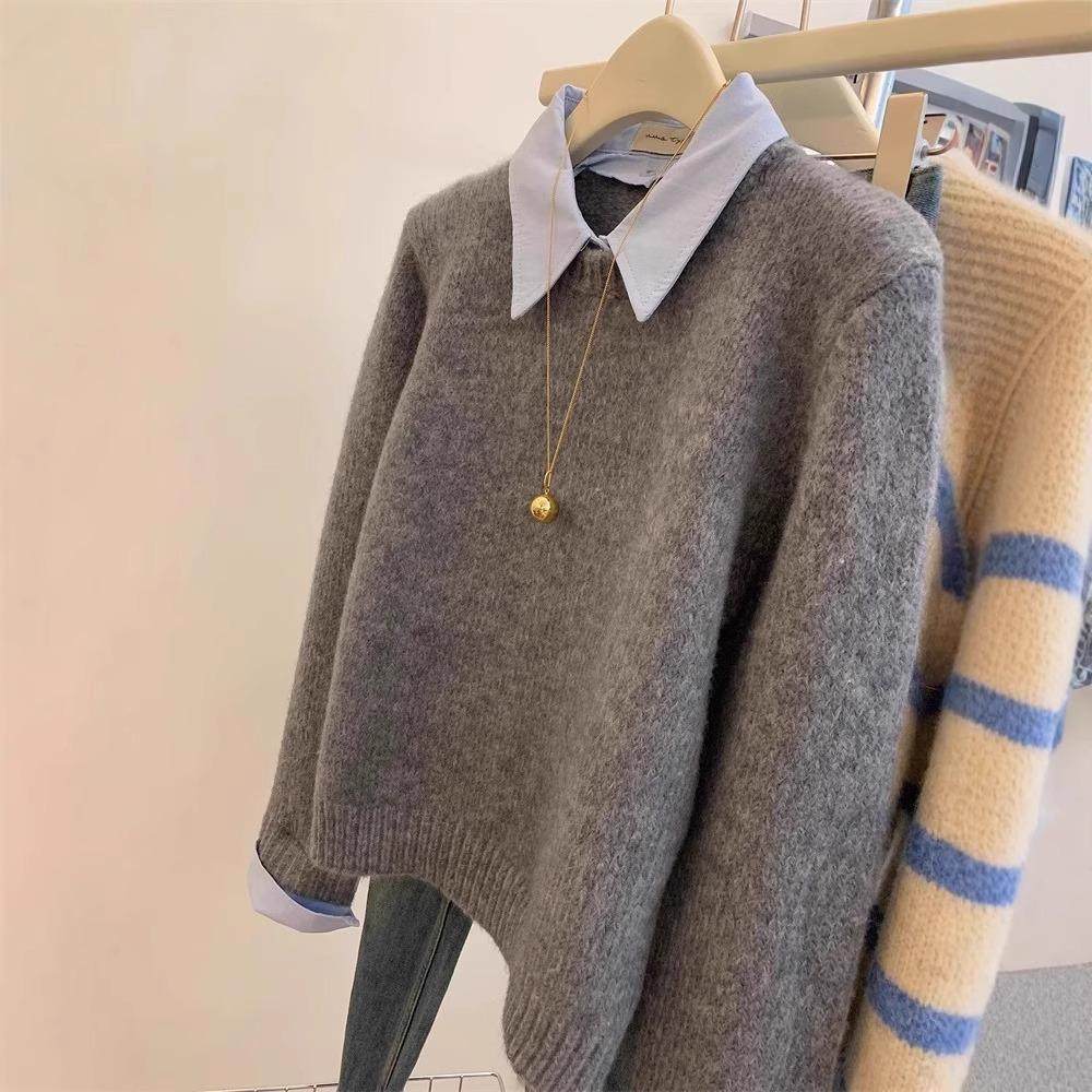 灰色假两件polo领内搭针织毛衣女秋冬短款慵懒风宽松打底针织上衣