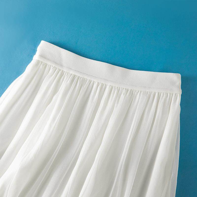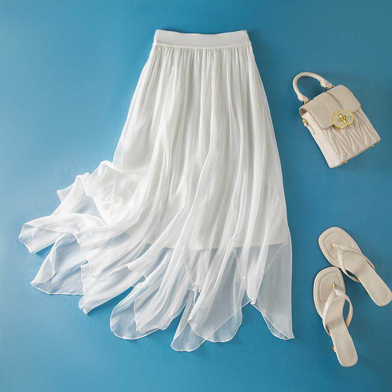 首页> 女装> 松紧腰真丝半身裙中长款气质不规则下摆纯色飘逸裙黑色白色85089