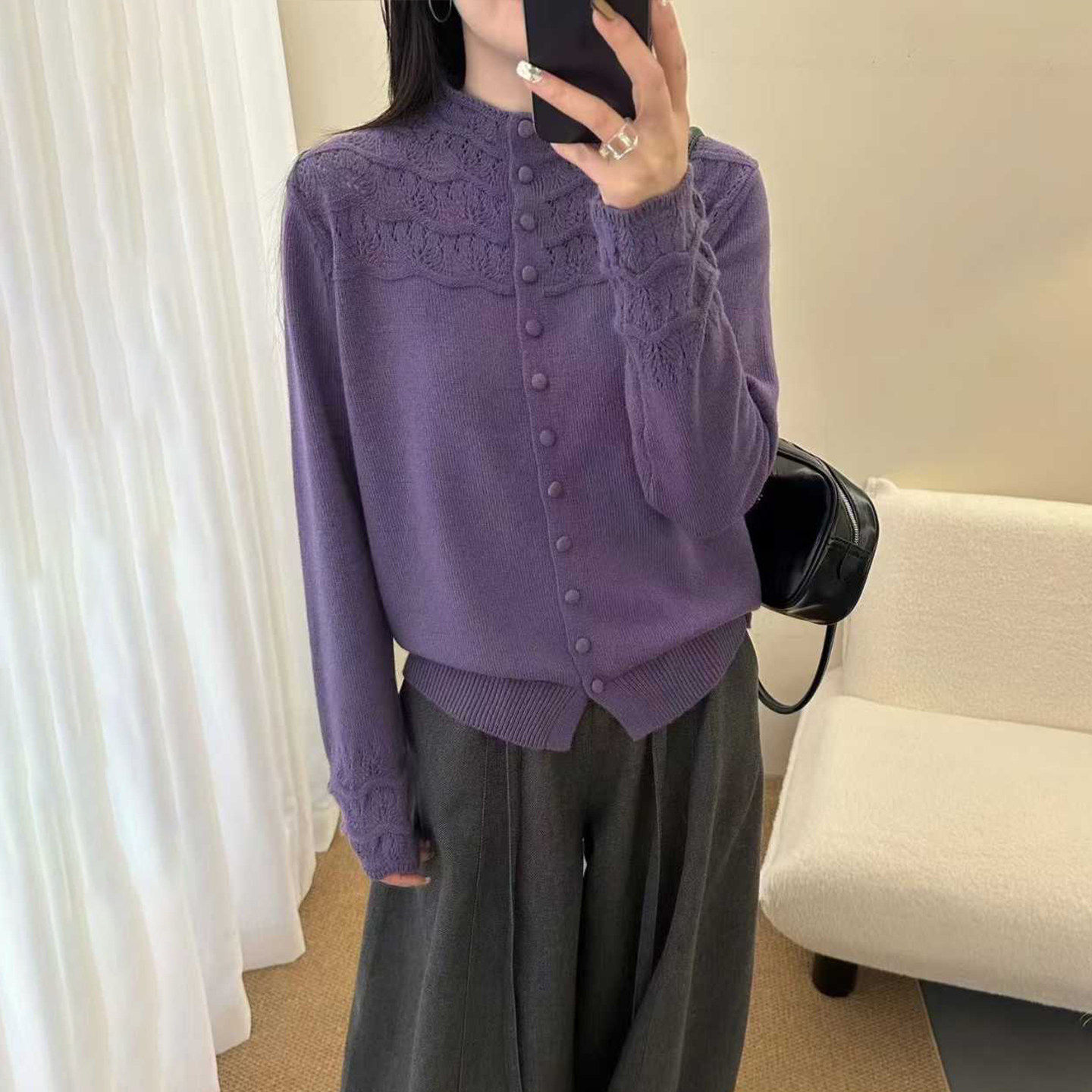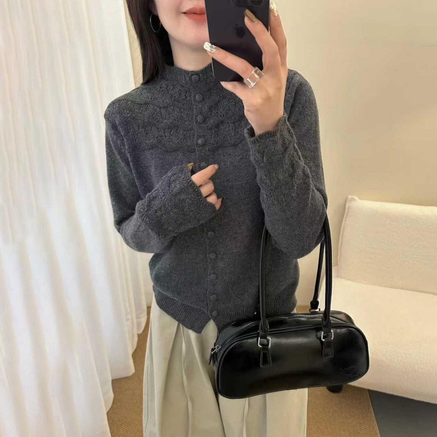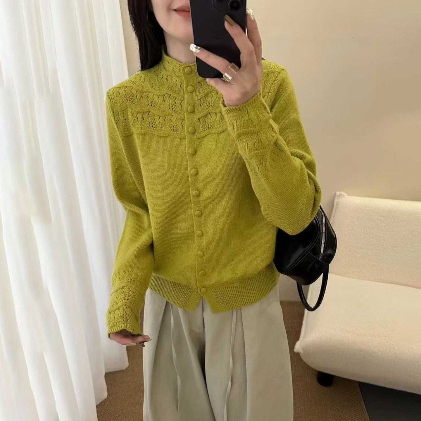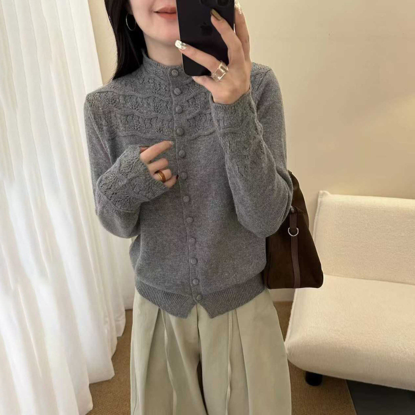 半高领镂空钩花针织开衫女2025新款秋冬显瘦毛衣外套独特别致上衣
