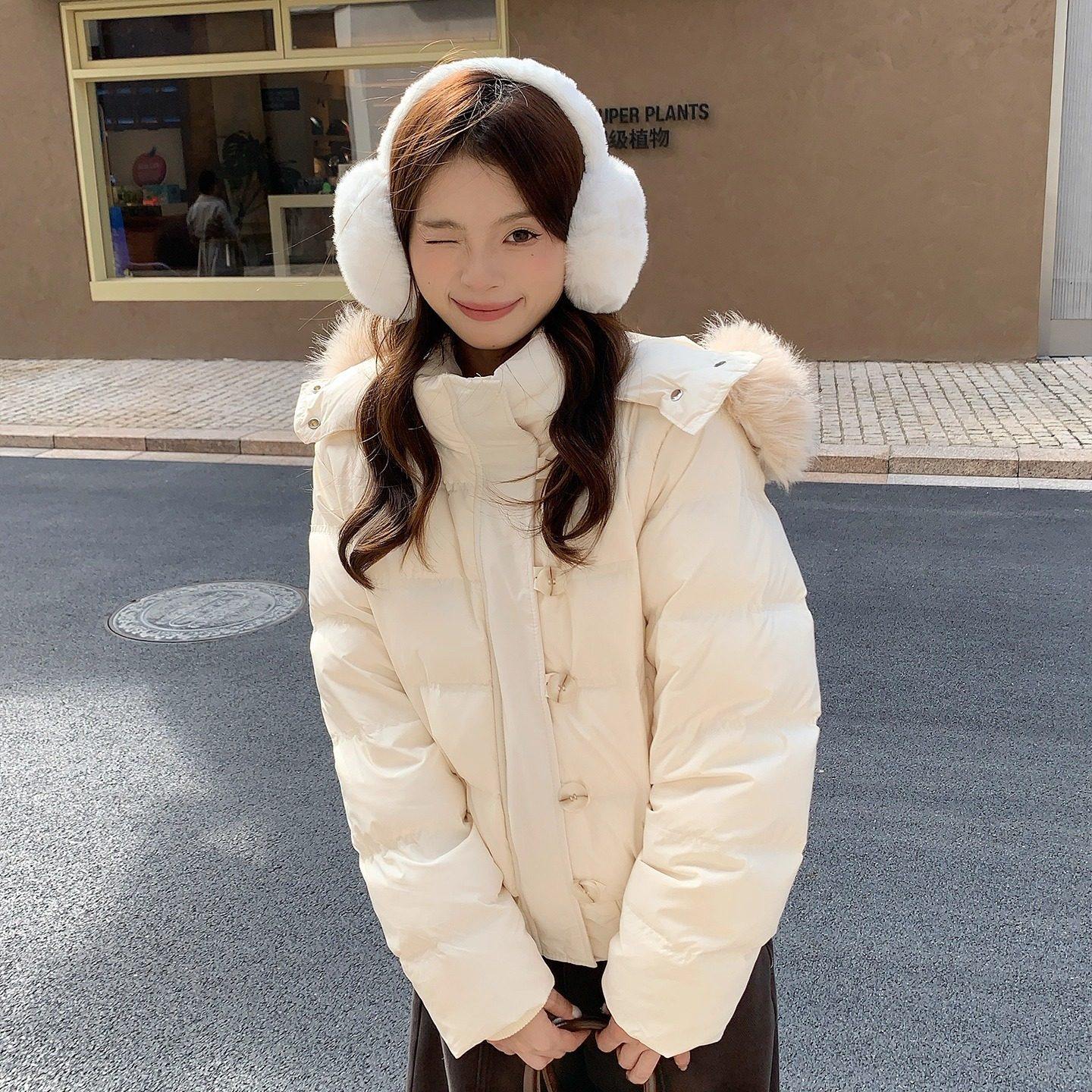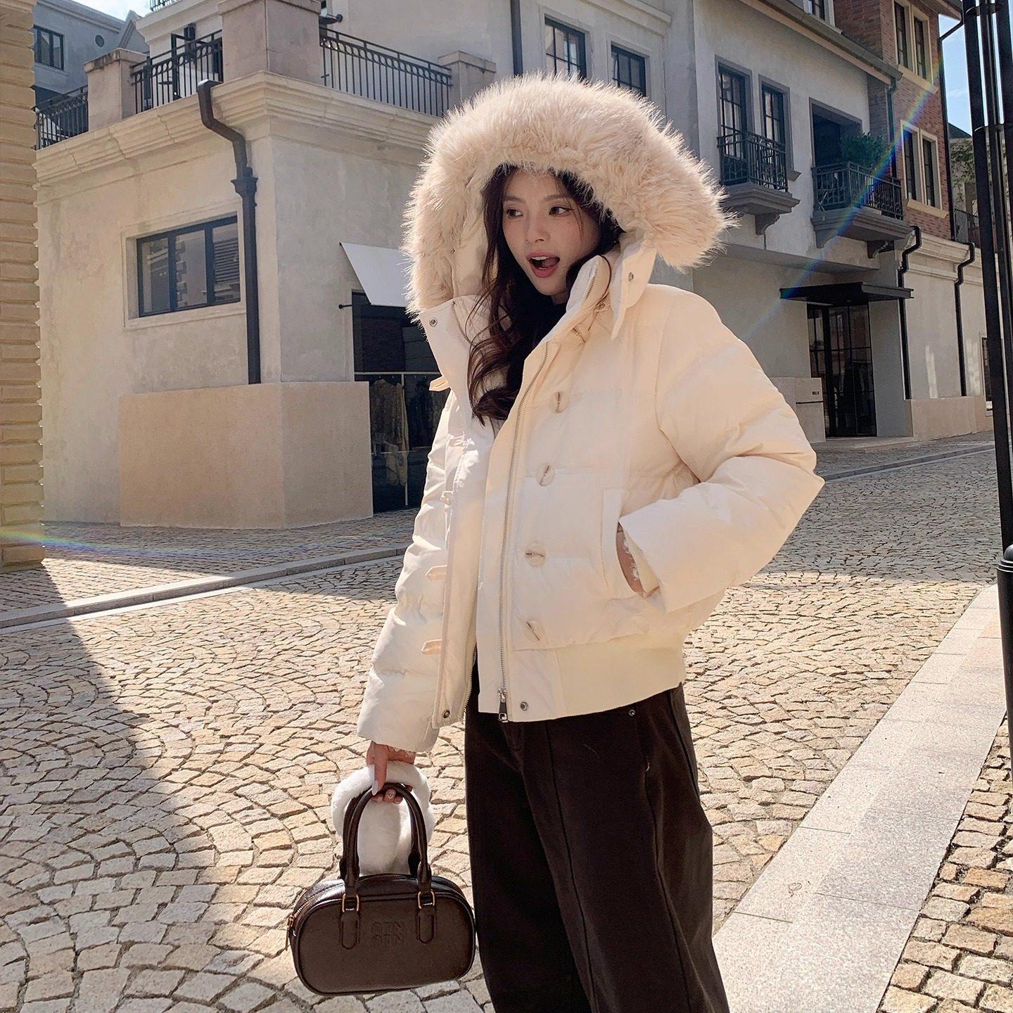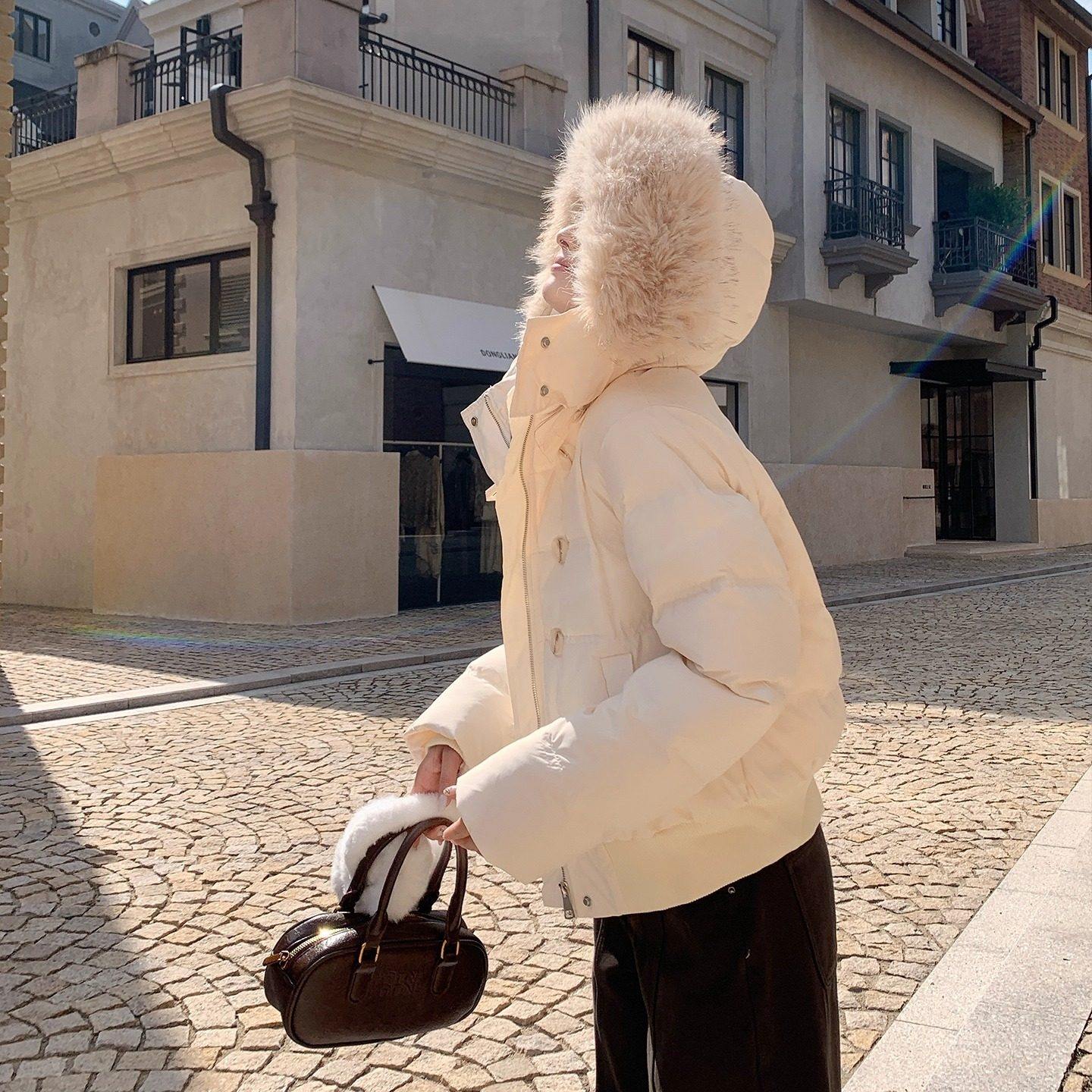 FAN 韩系甜美杏色大毛领外套女秋冬新款保暖短款白鸭绒羽绒服上衣