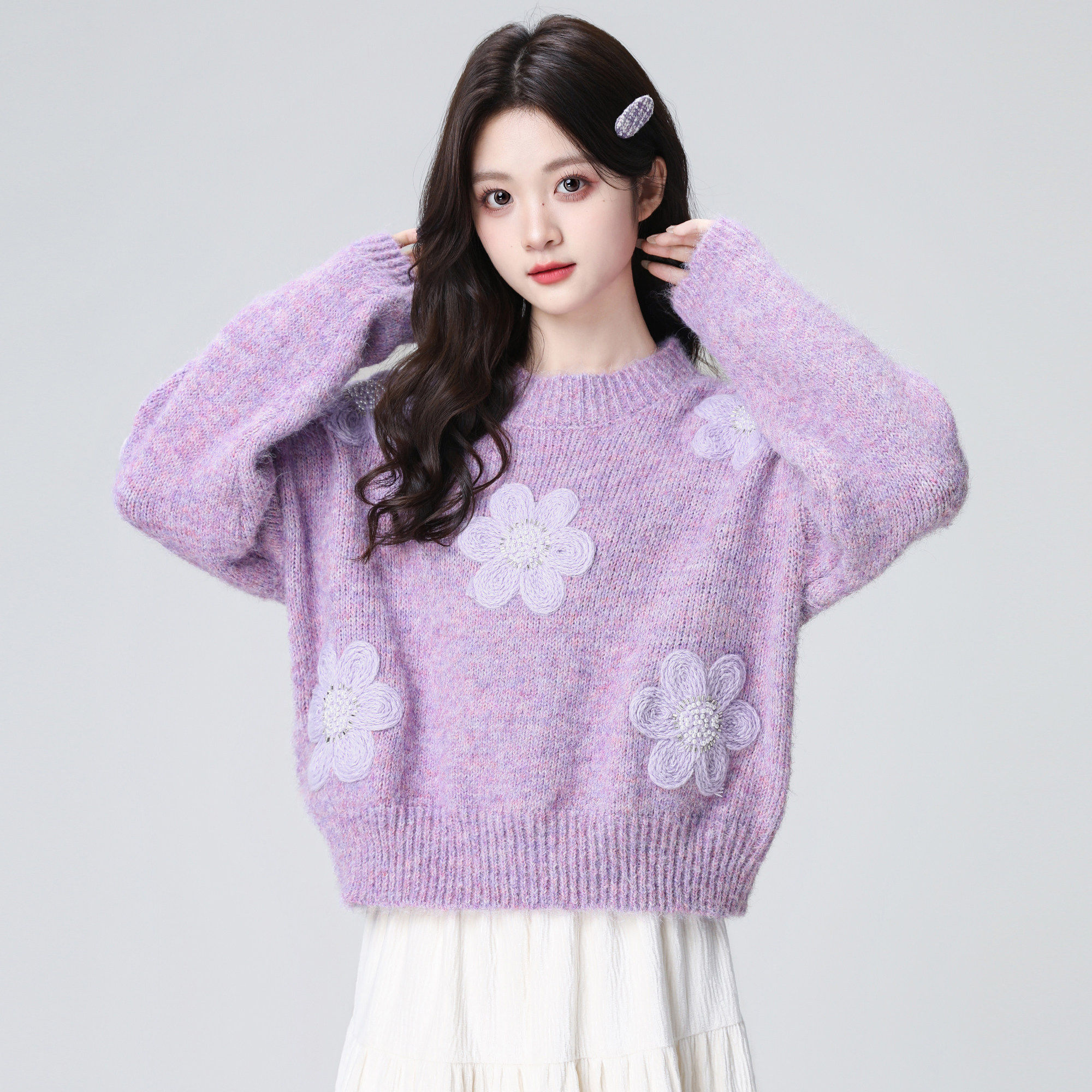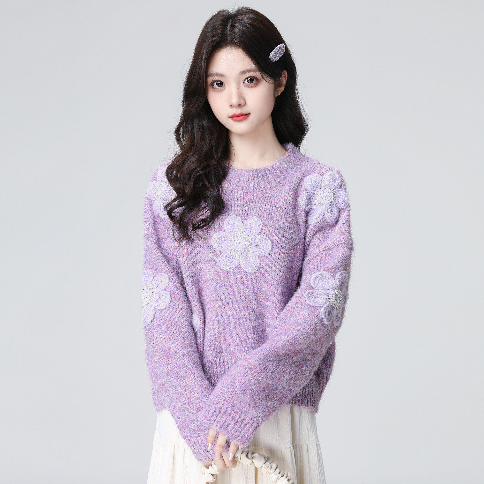 紫色圆领毛衣女秋冬2025冬新款立体花朵小个子宽松慵懒针织衫上衣