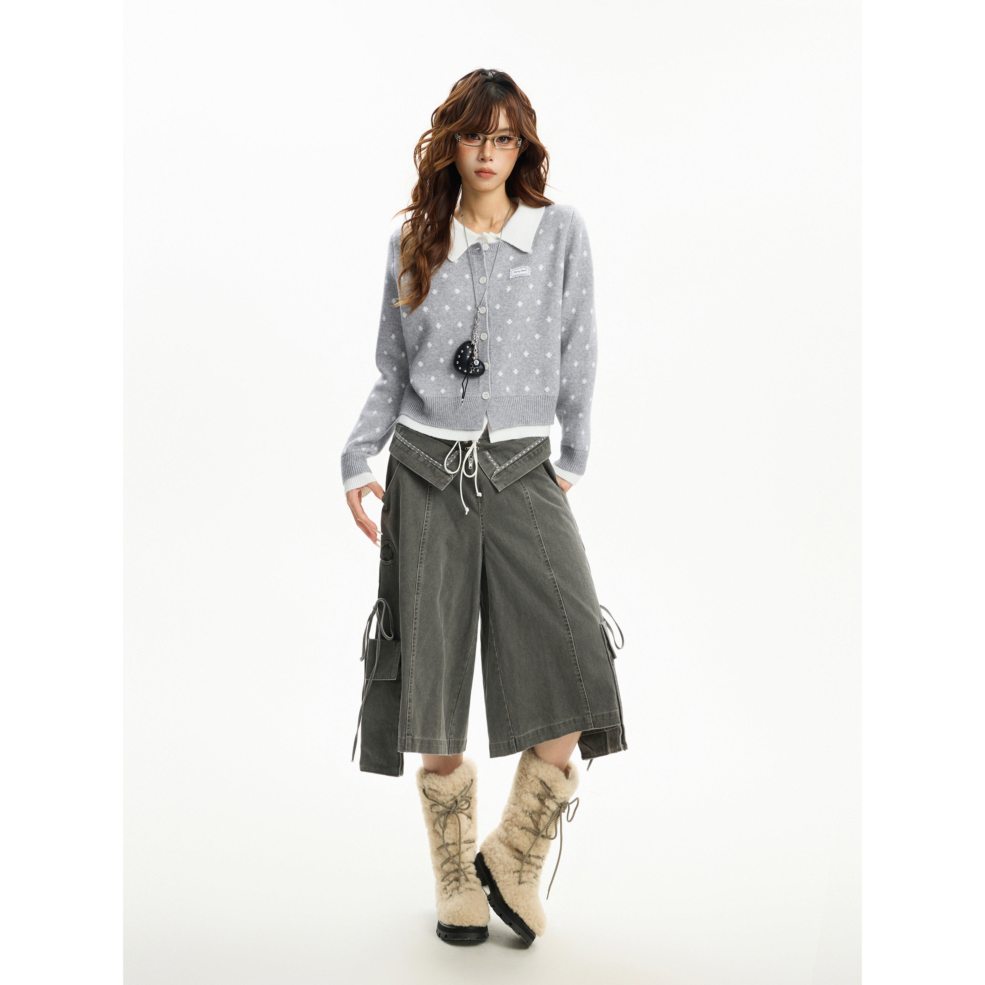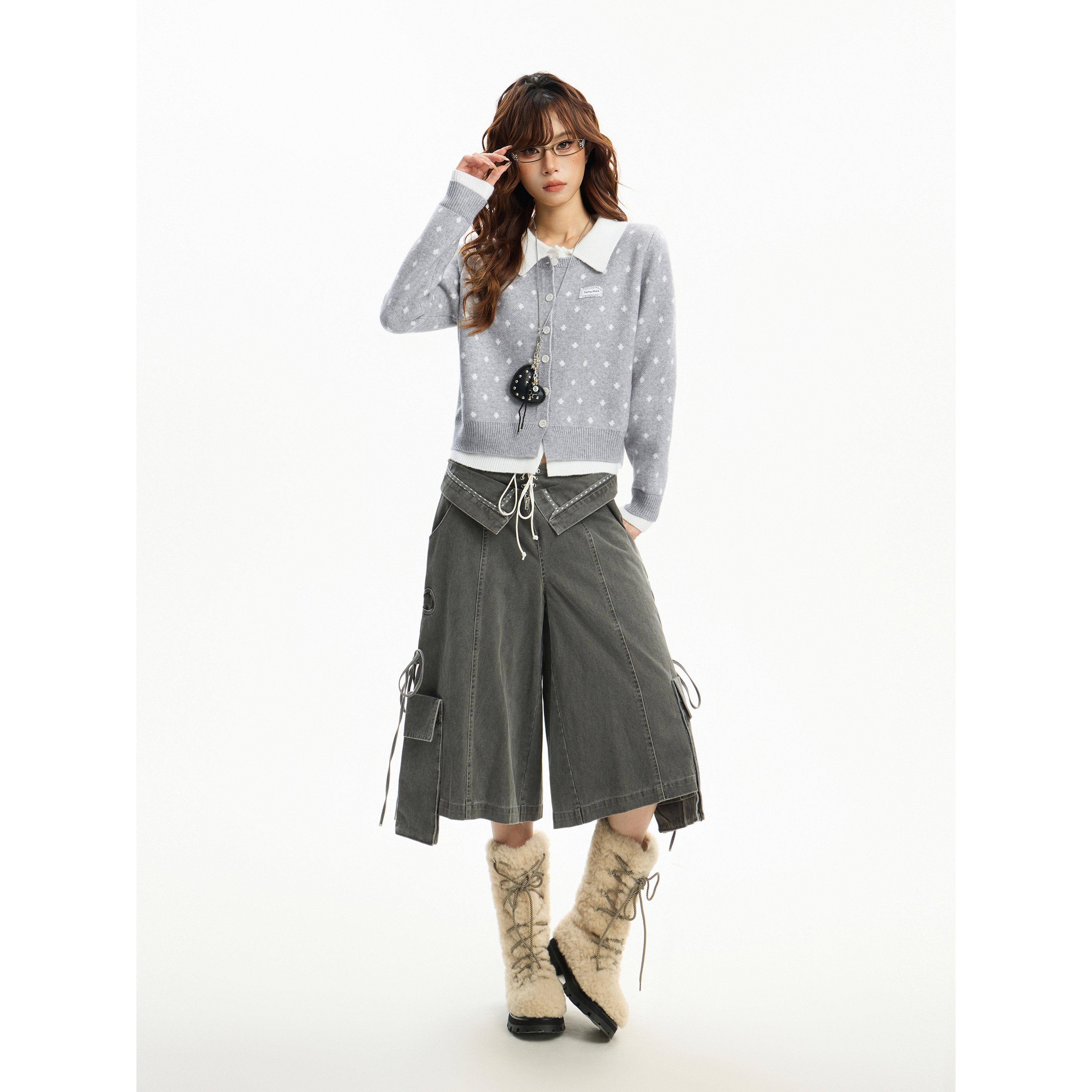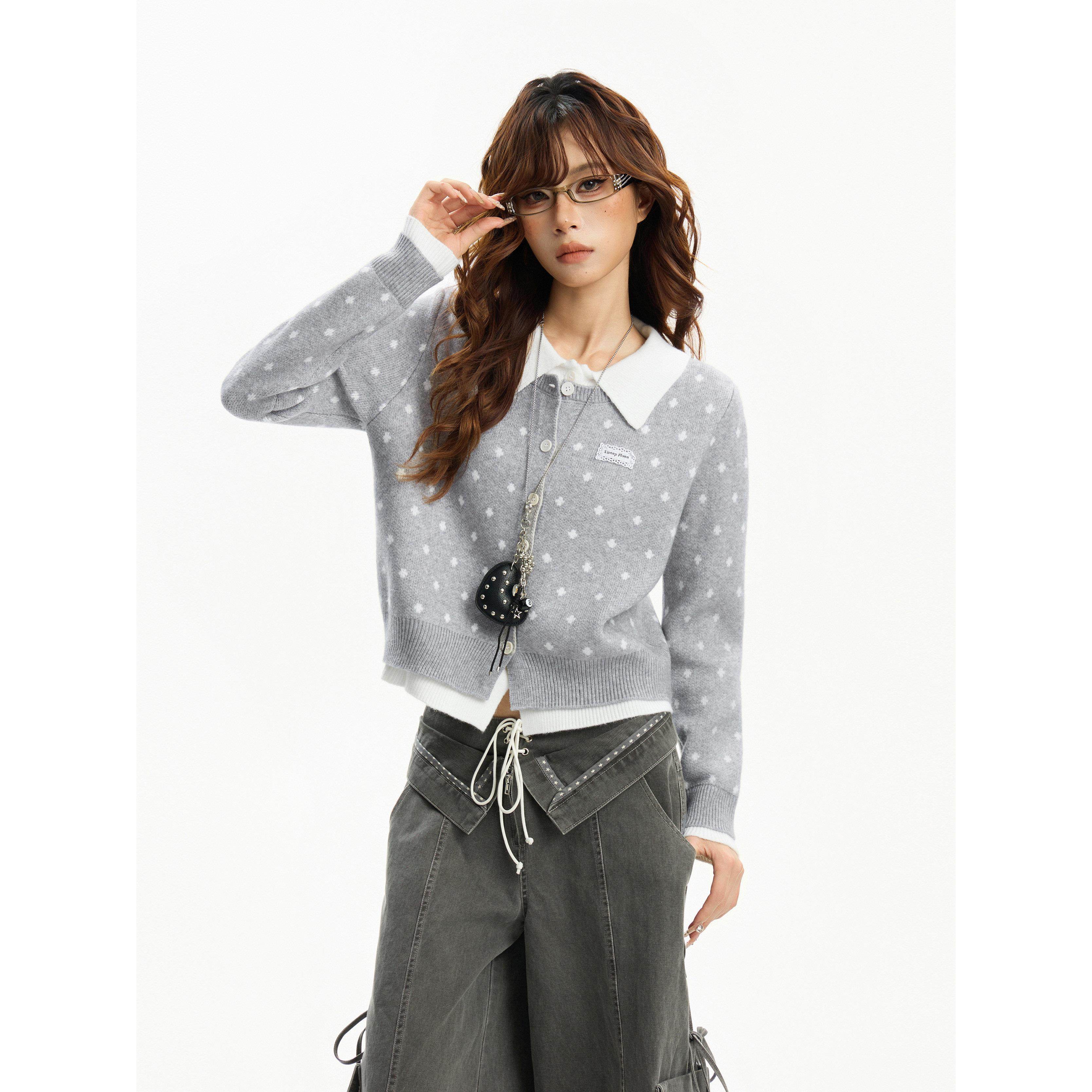 美式灰色正肩polo领假两件毛衣开衫外套女秋冬修身显瘦针织衫上衣