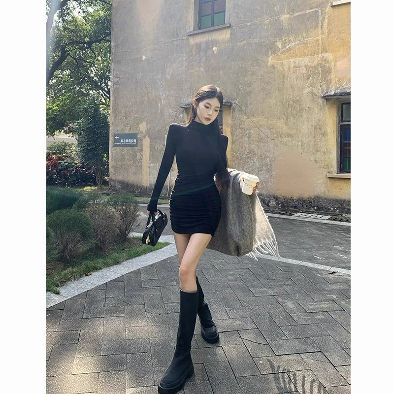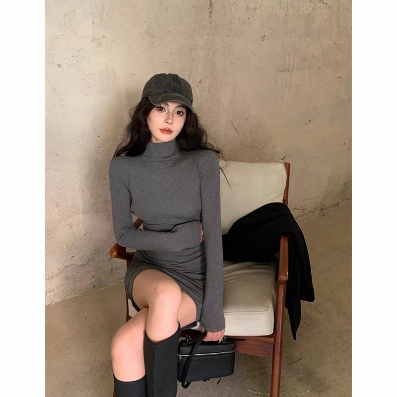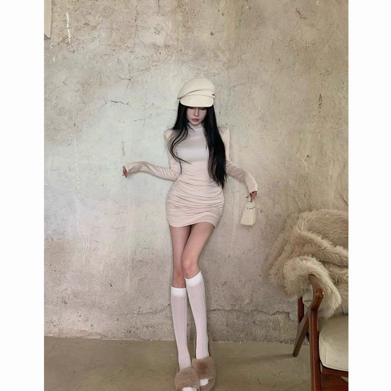 春秋纯欲性感磨毛长袖短裙修身显瘦加绒内搭半高领包臀打底连衣裙