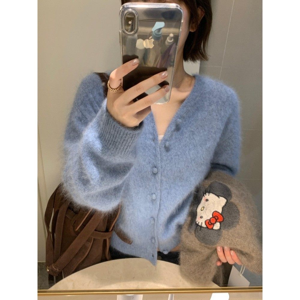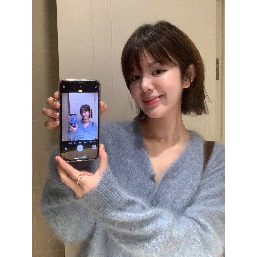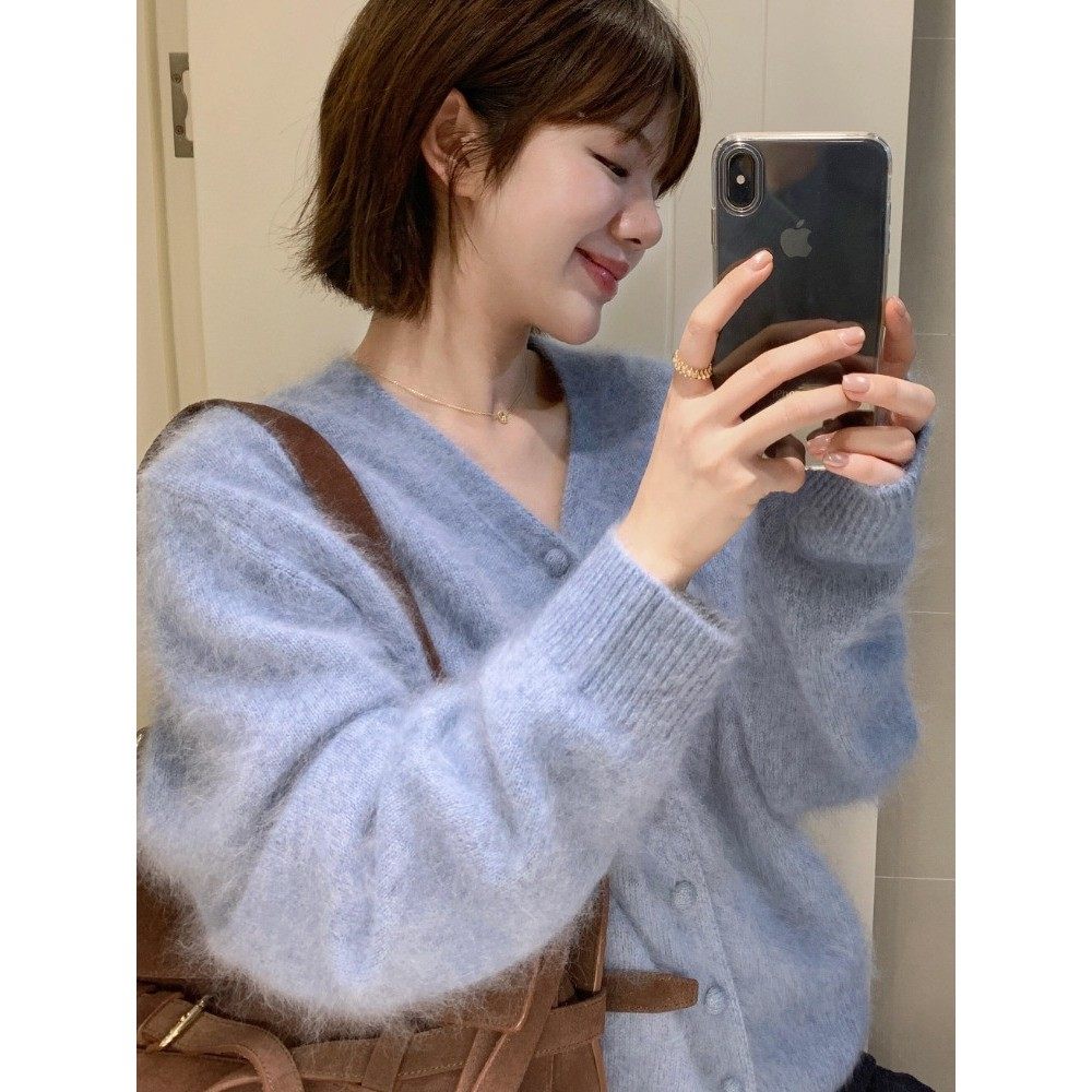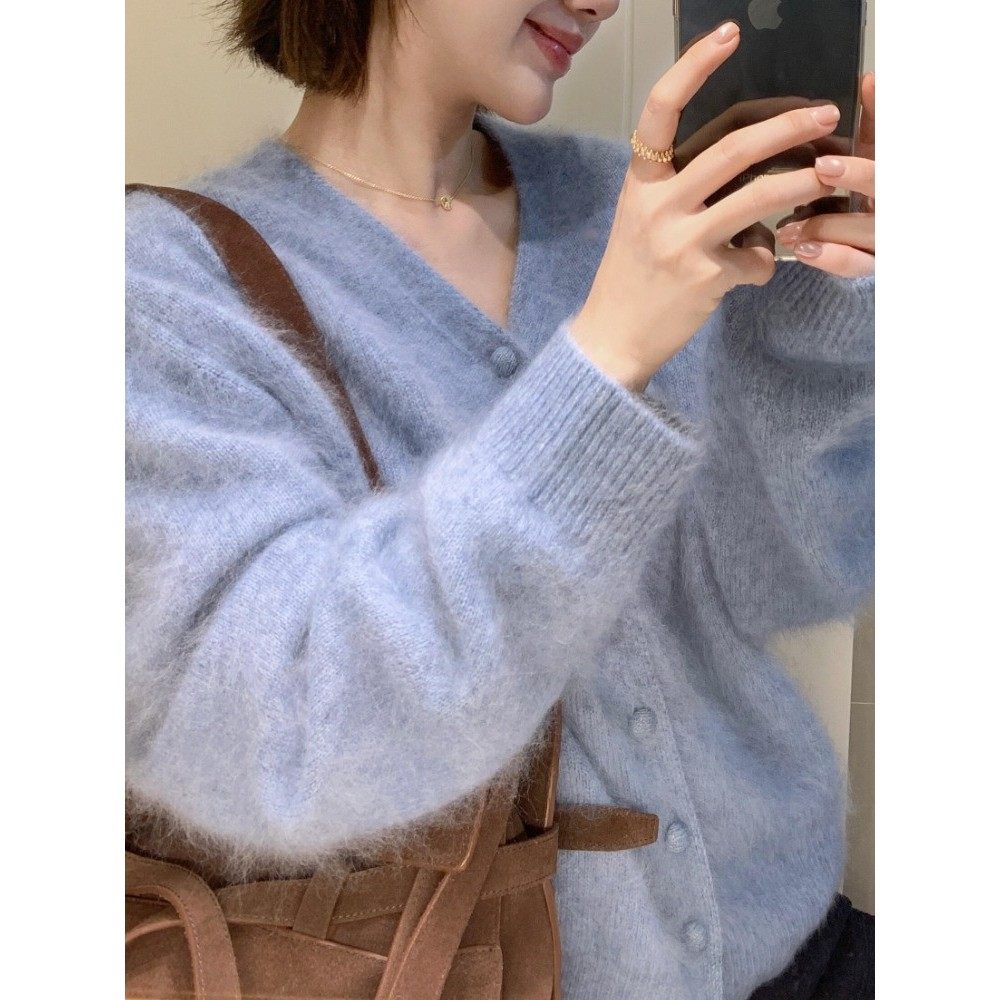 温柔系蓝色v领珠扣马海毛毛衣外套韩系慵懒高级感针织衫2025秋季