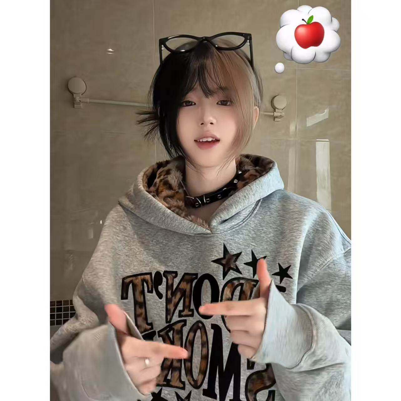 美式复古豹纹星星贴布刺绣连帽卫衣女秋冬加绒加厚宽松情侣外套