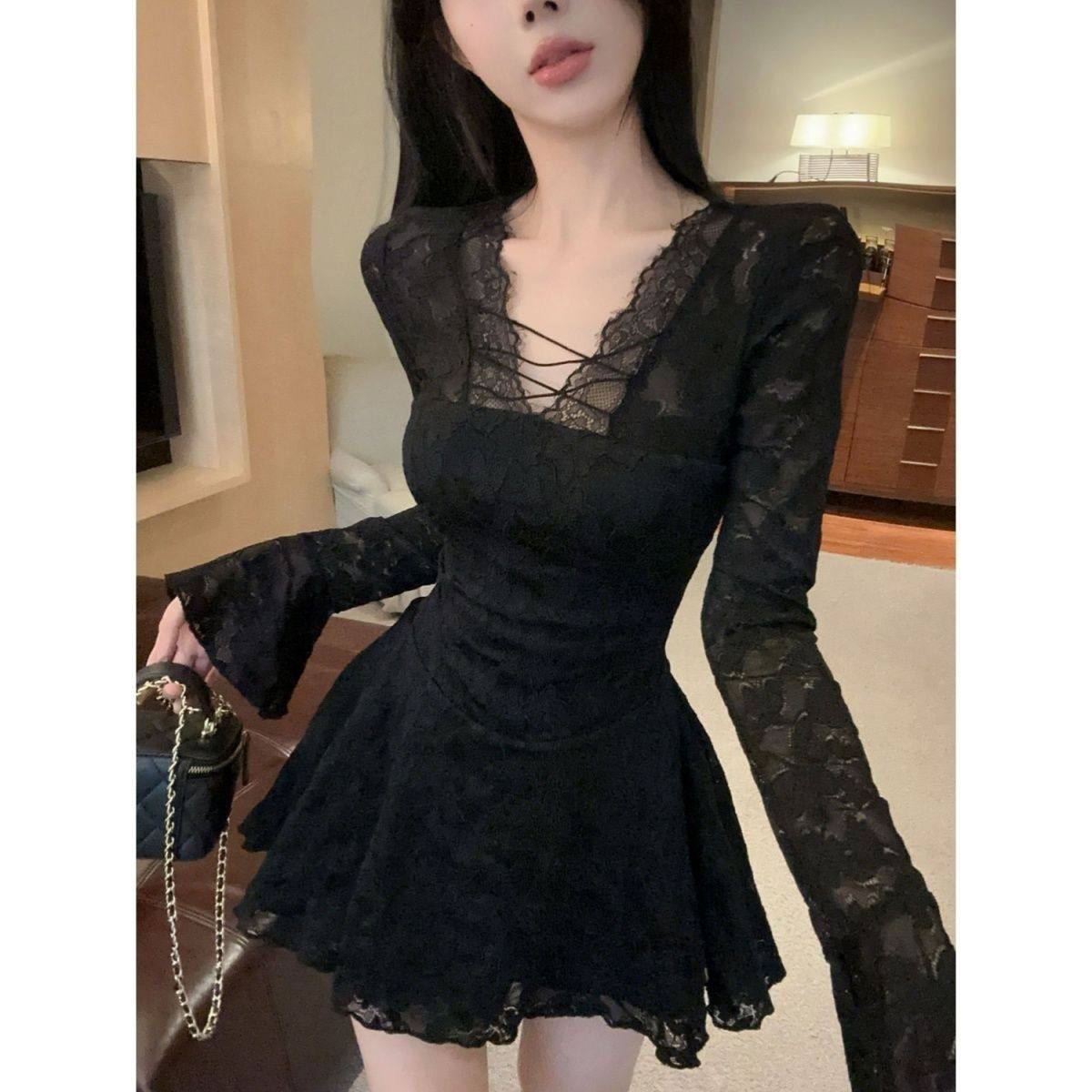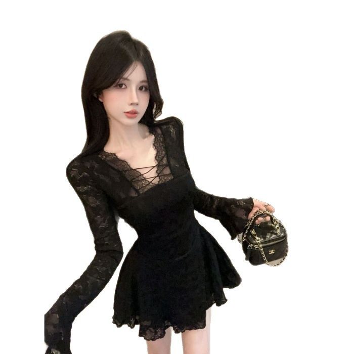 韩系性感镂空蕾丝长袖连衣裙气质收腰显瘦辣妹春季纯欲新款裙子