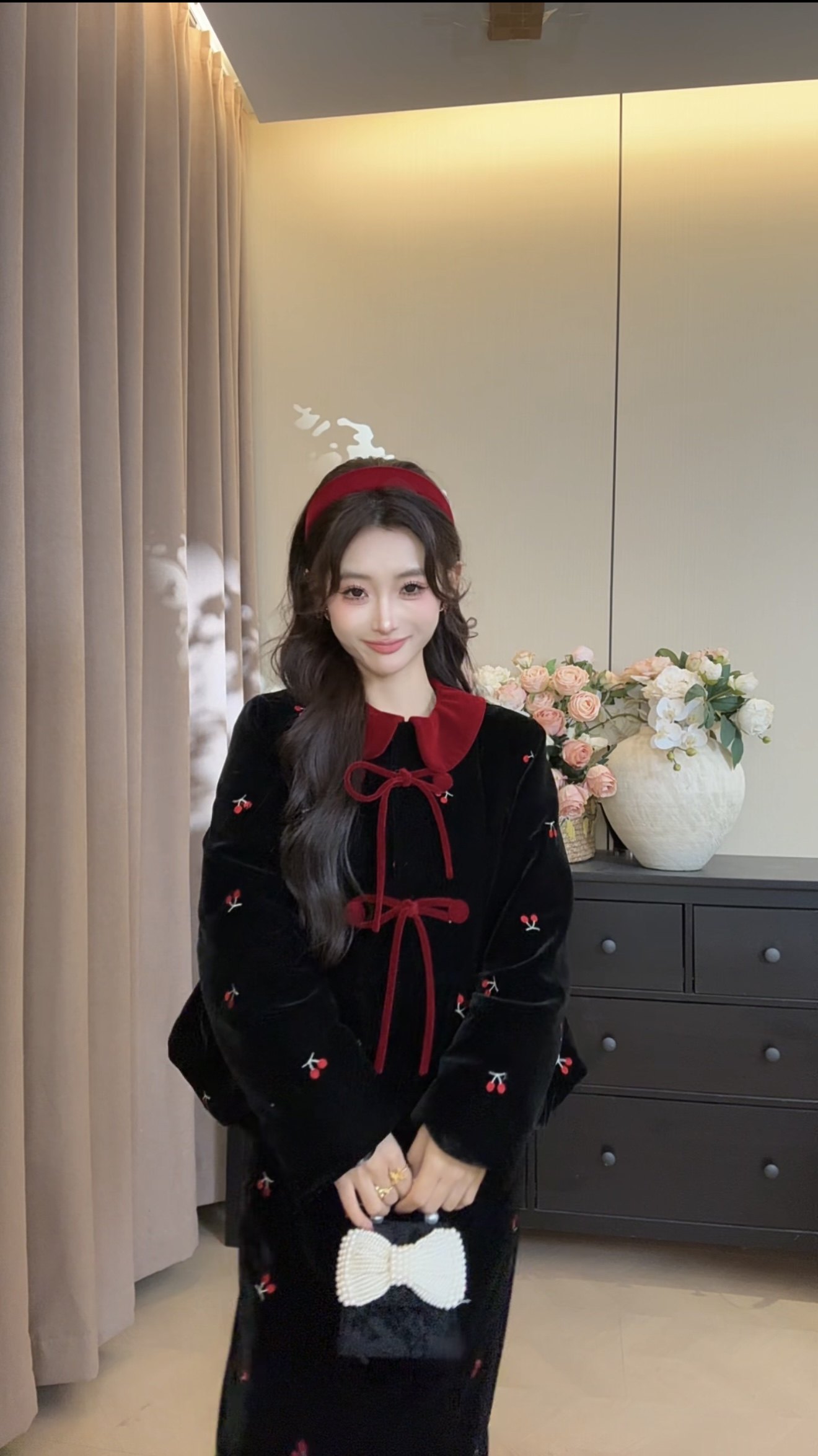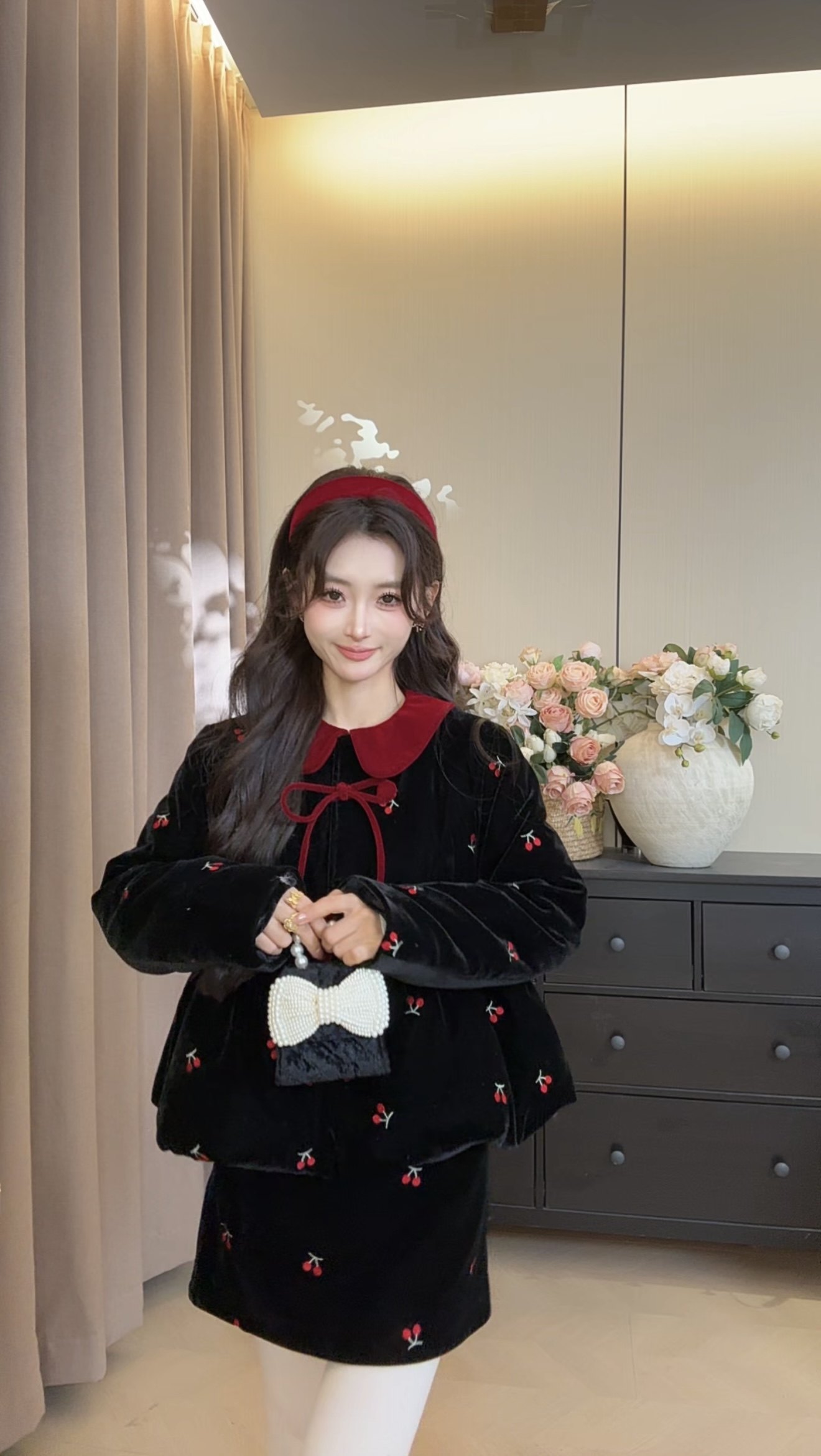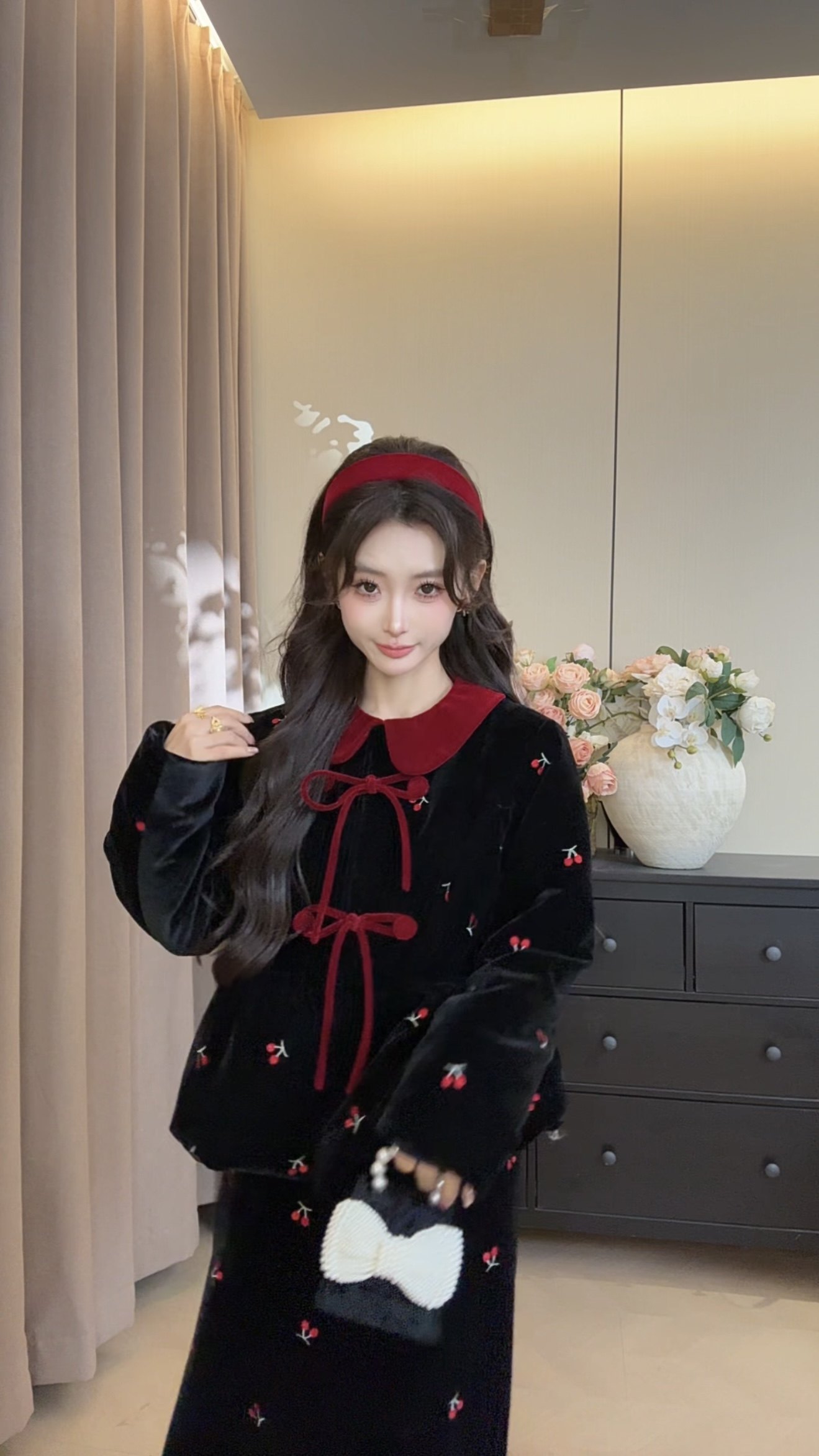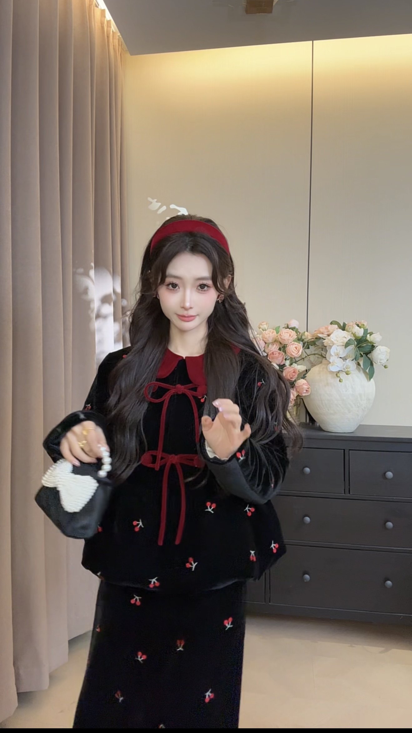 可可可欣【红绒丝带羽绒套装】女装洋气时尚休闲原创小众老钱风