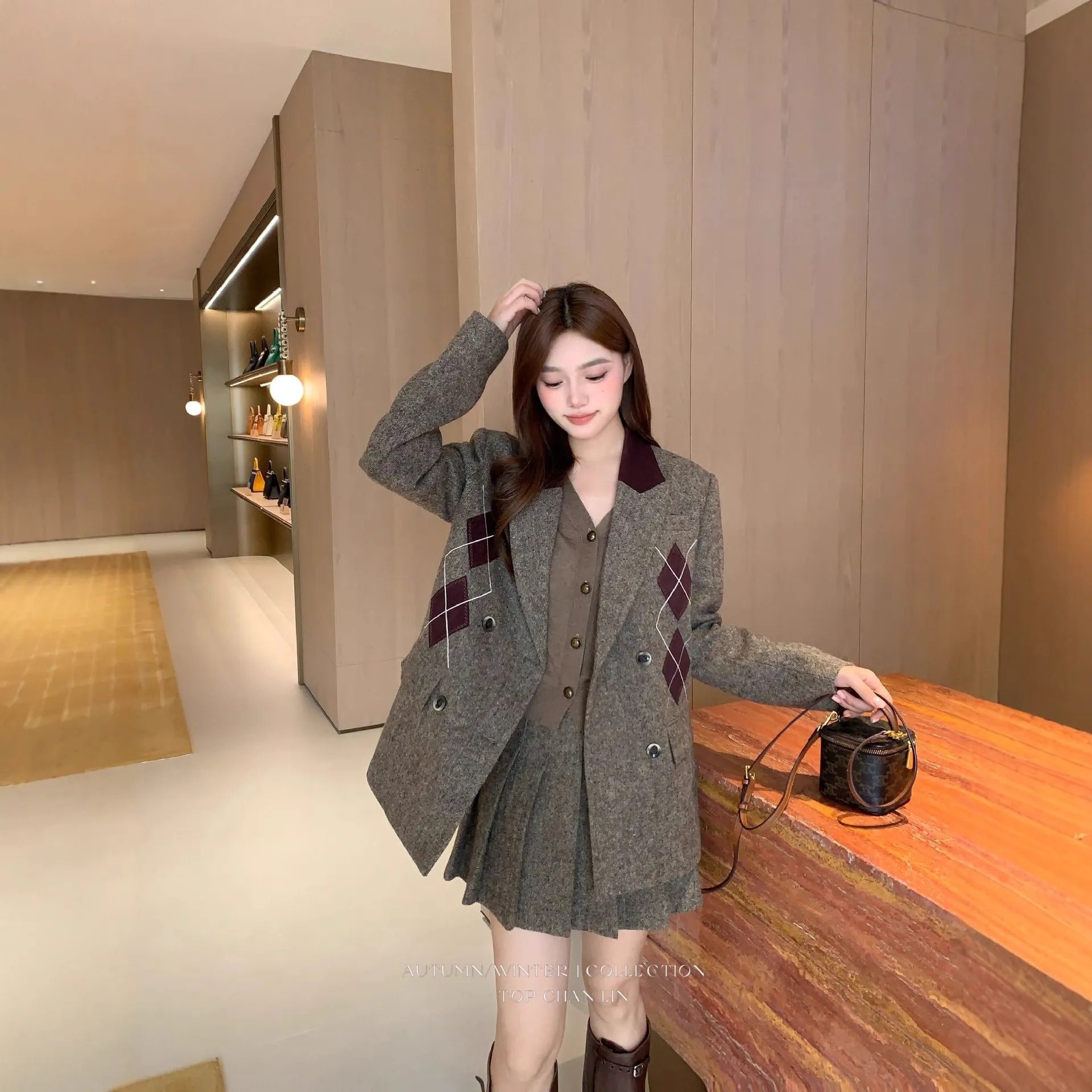 2025秋老钱风菱格西装外套+高腰毛呢百褶A字半身裙套装QD82270