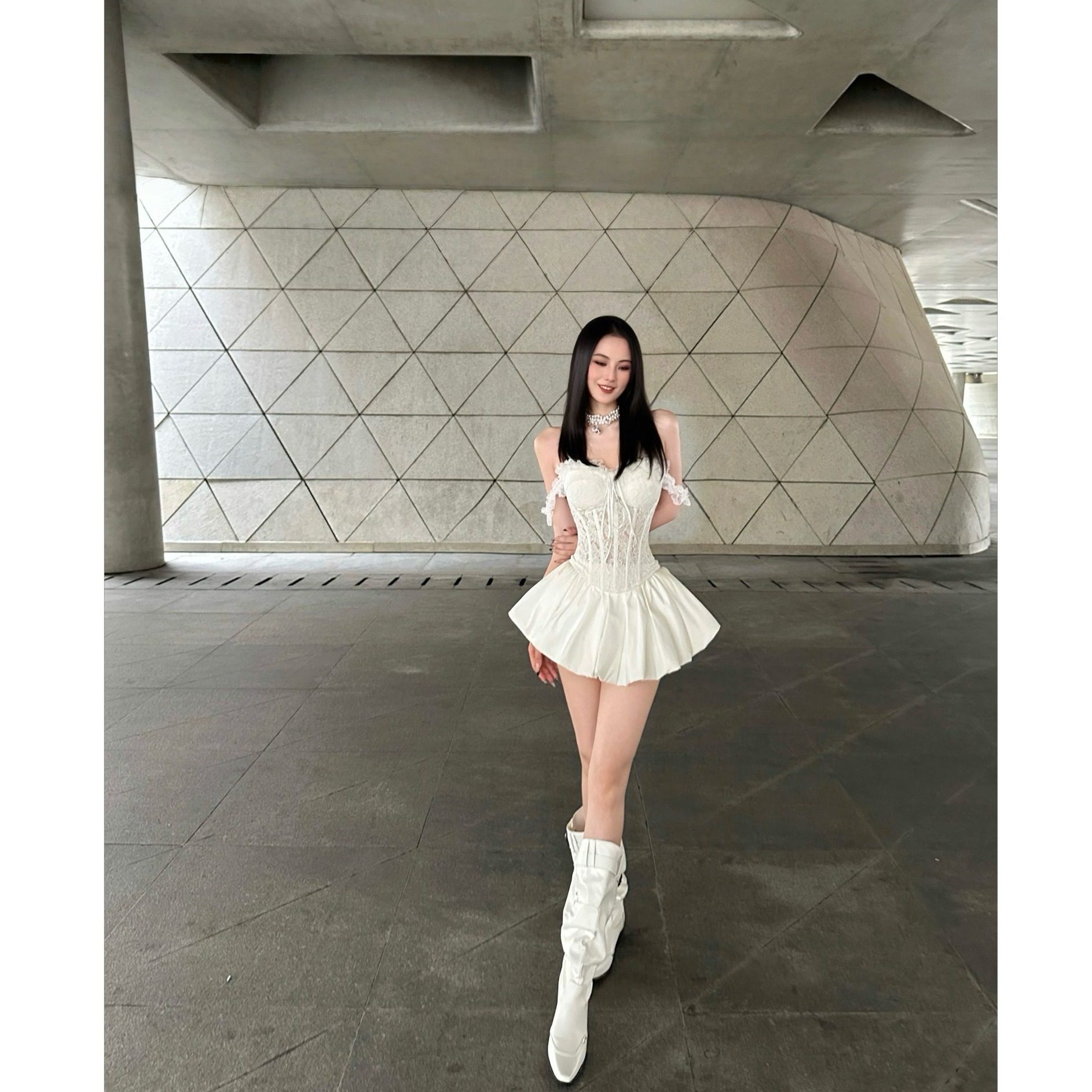BETTER ME 白色蕾丝花边一字肩挂肩俩穿鱼骨抹胸修身显瘦露肩上衣