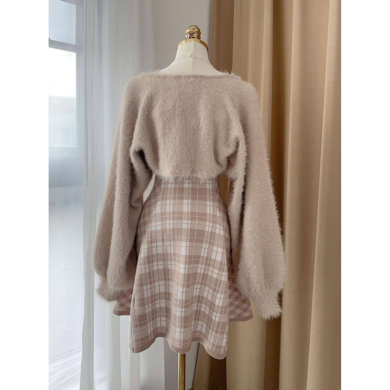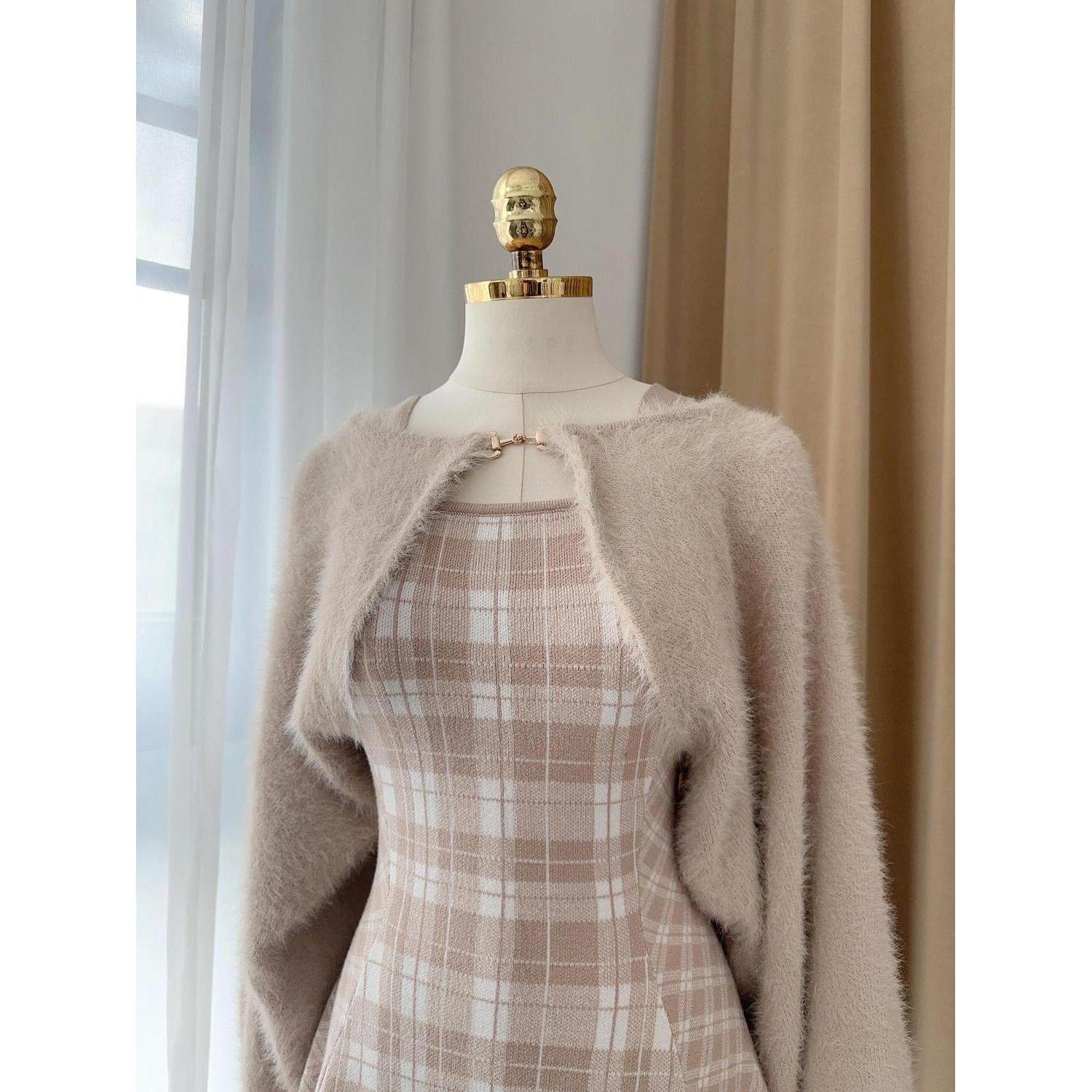 日系甜美粉色毛绒披肩+格纹连衣裙两件套秋冬设计感气质短裙套装