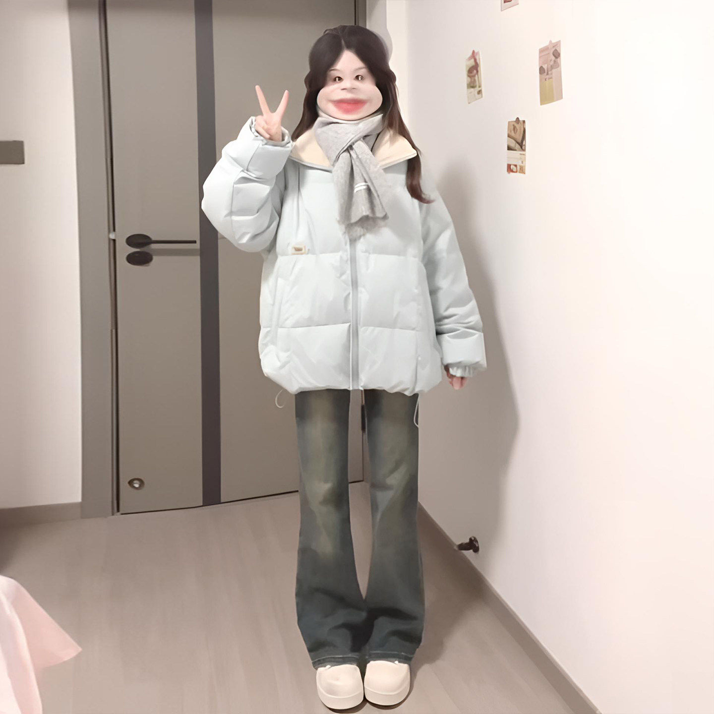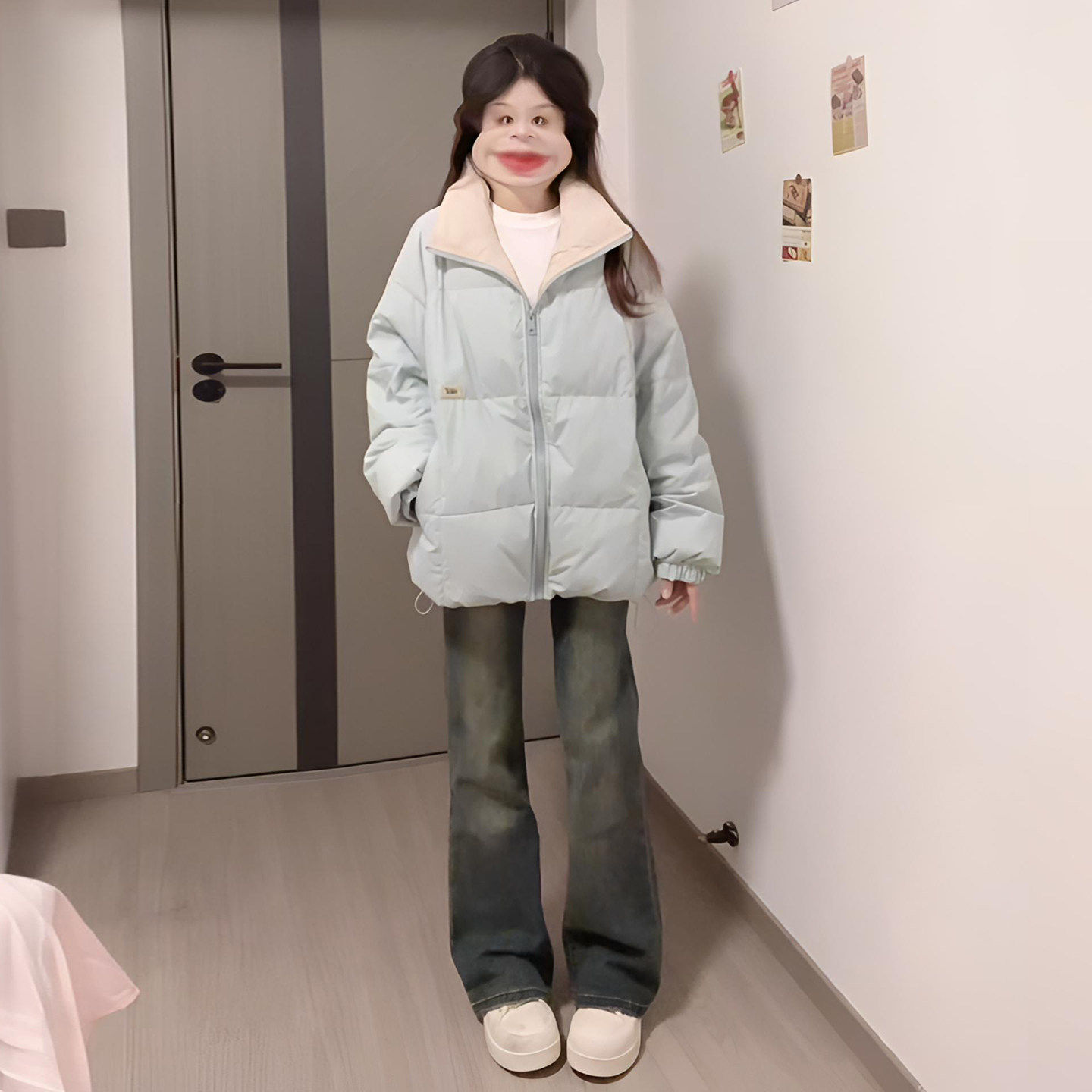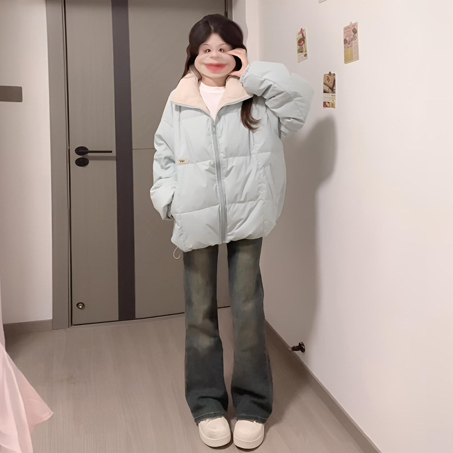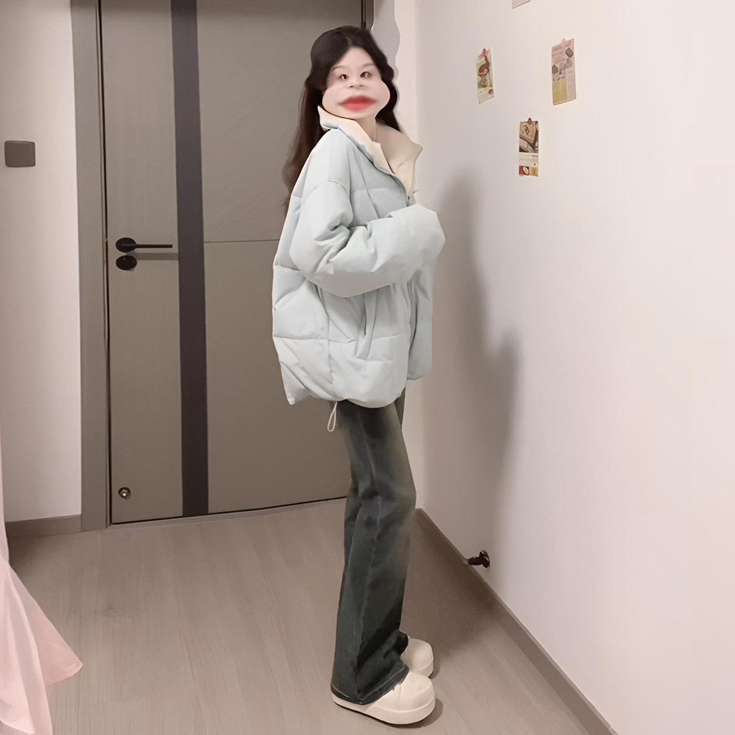 300斤特大码韩系简约百搭棉服外套女胖mm蓝色加厚保暖面包服上衣