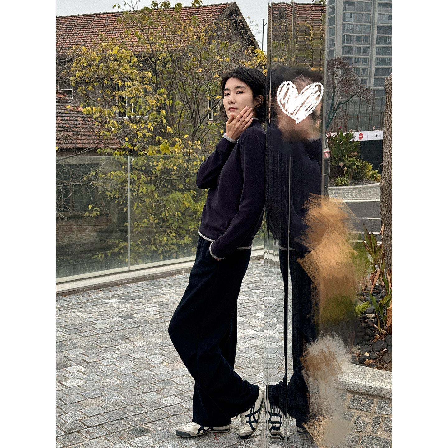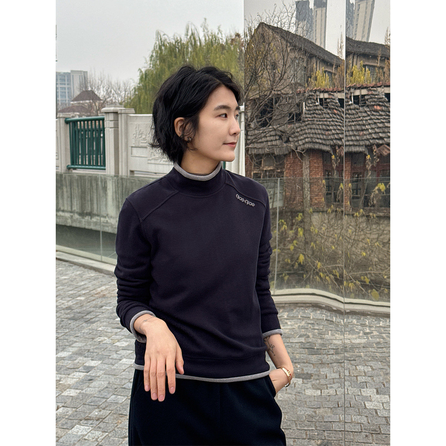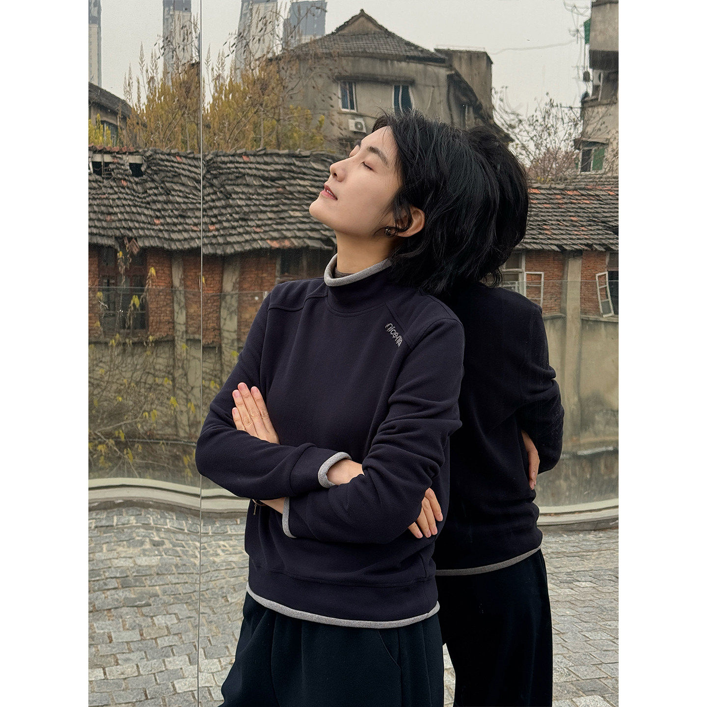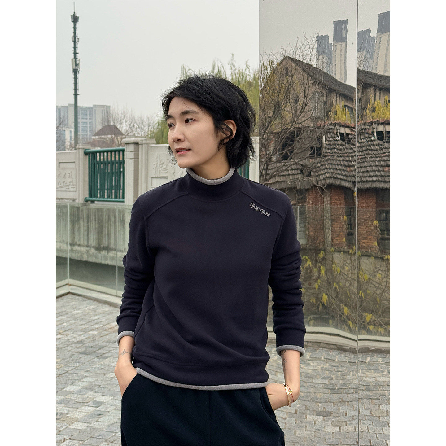 周浪清藏青色半高领羊毛卫衣女2025新款冬季保暖无帽内搭打底上衣