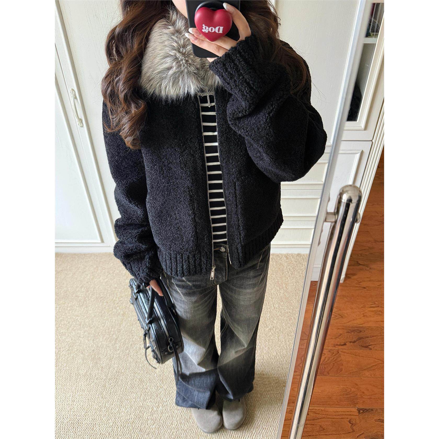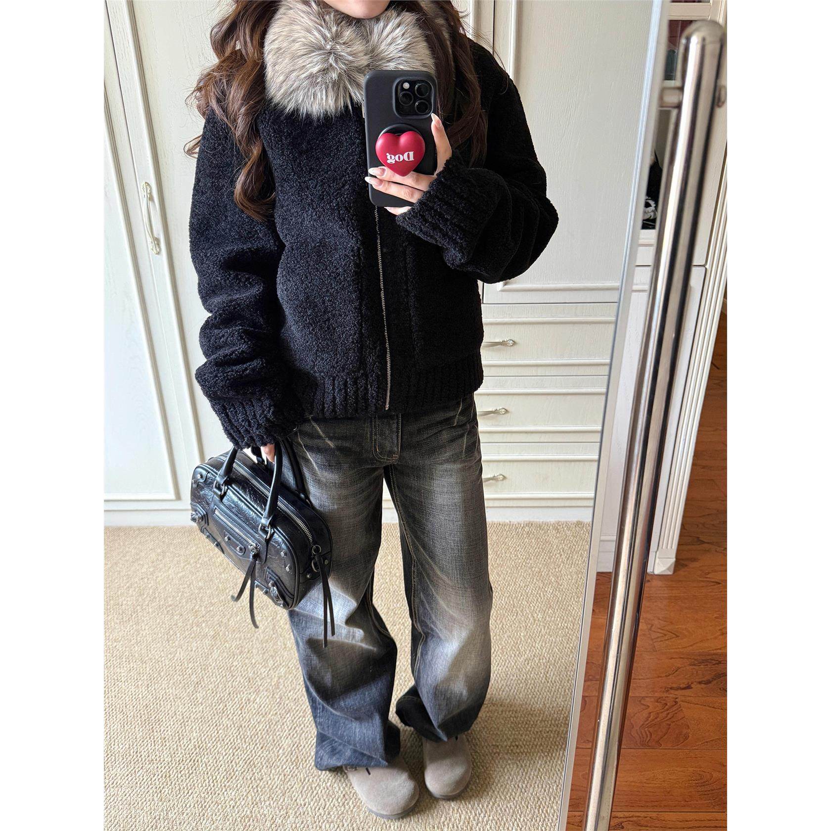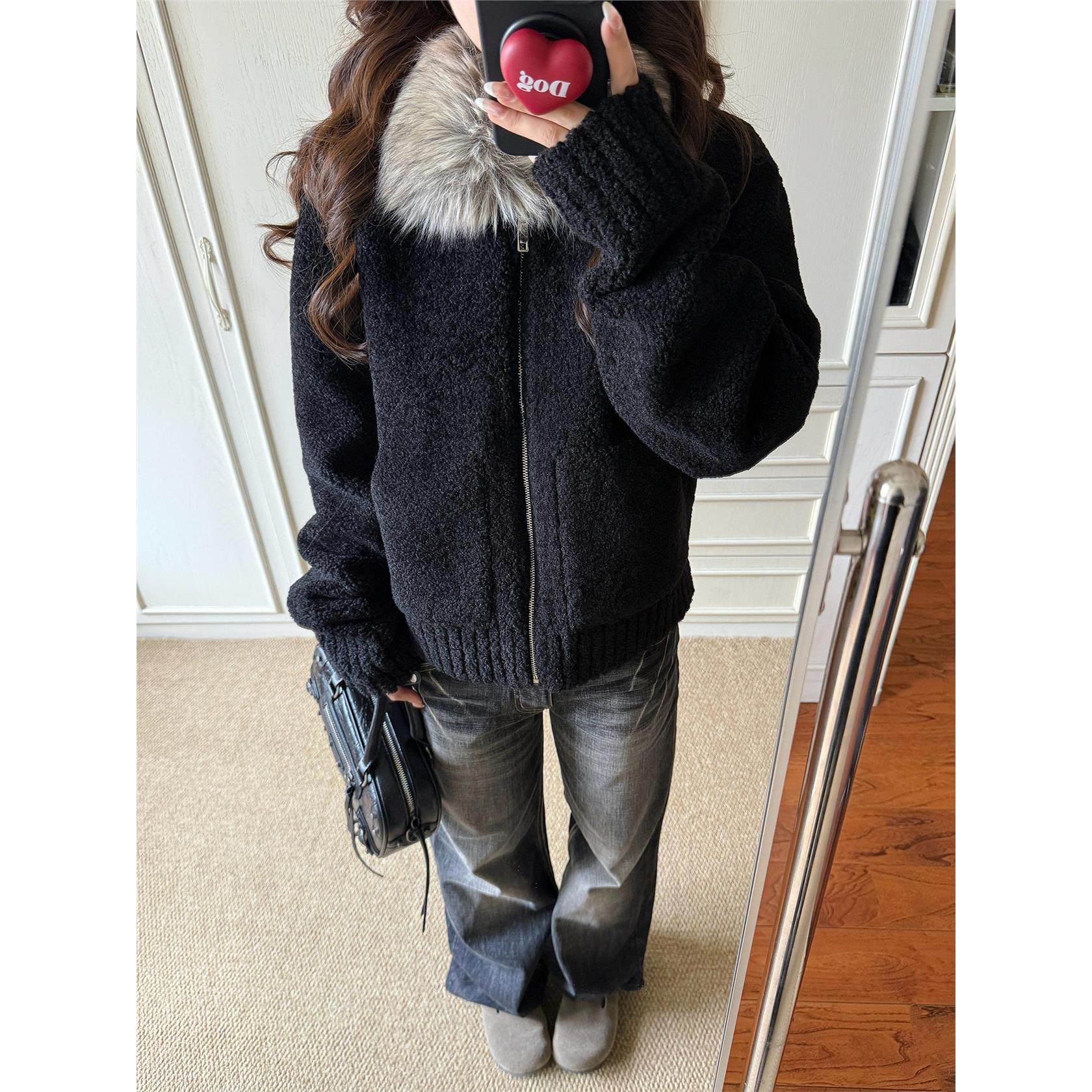 定染毛领小颗粒羊羔毛外套女秋冬季新款皮毛一体加厚黑色环保皮草