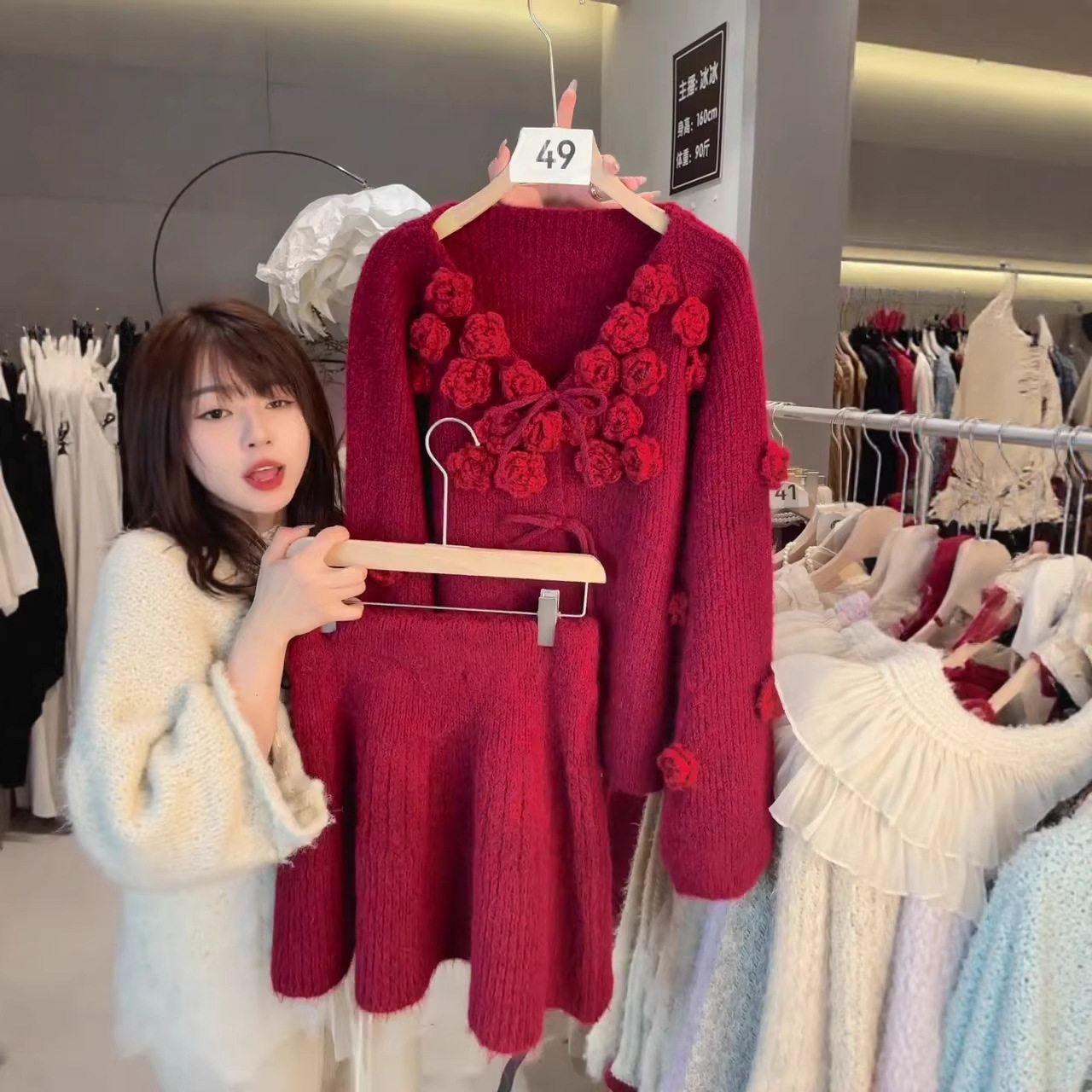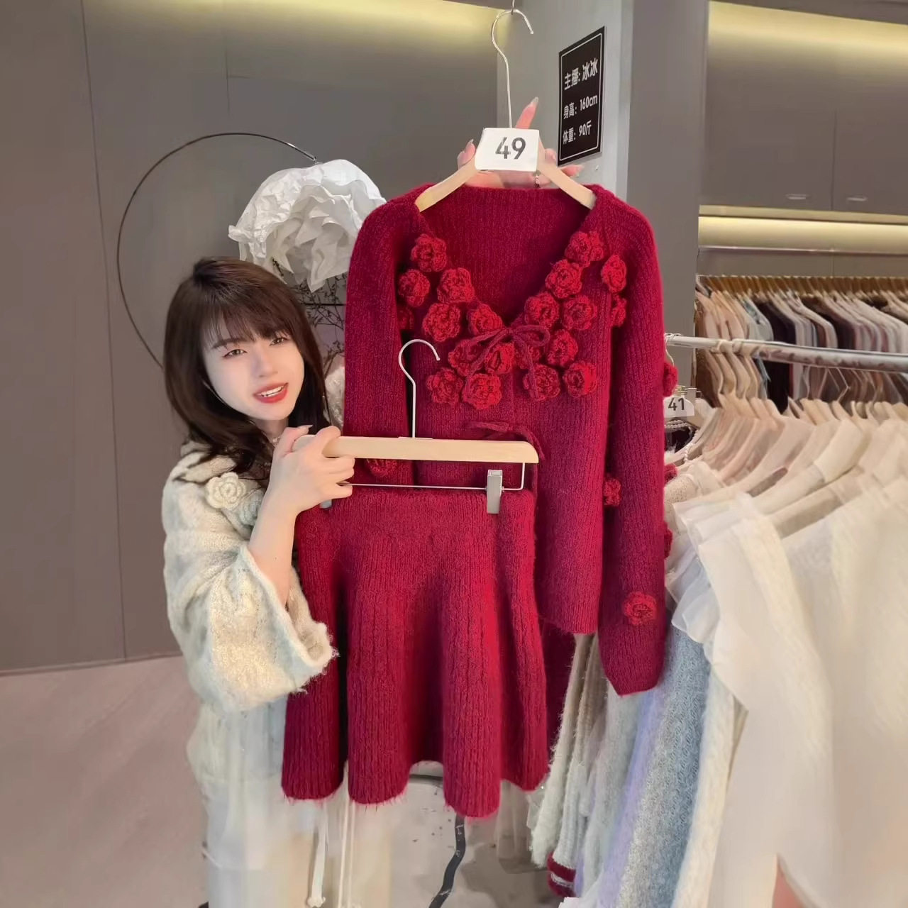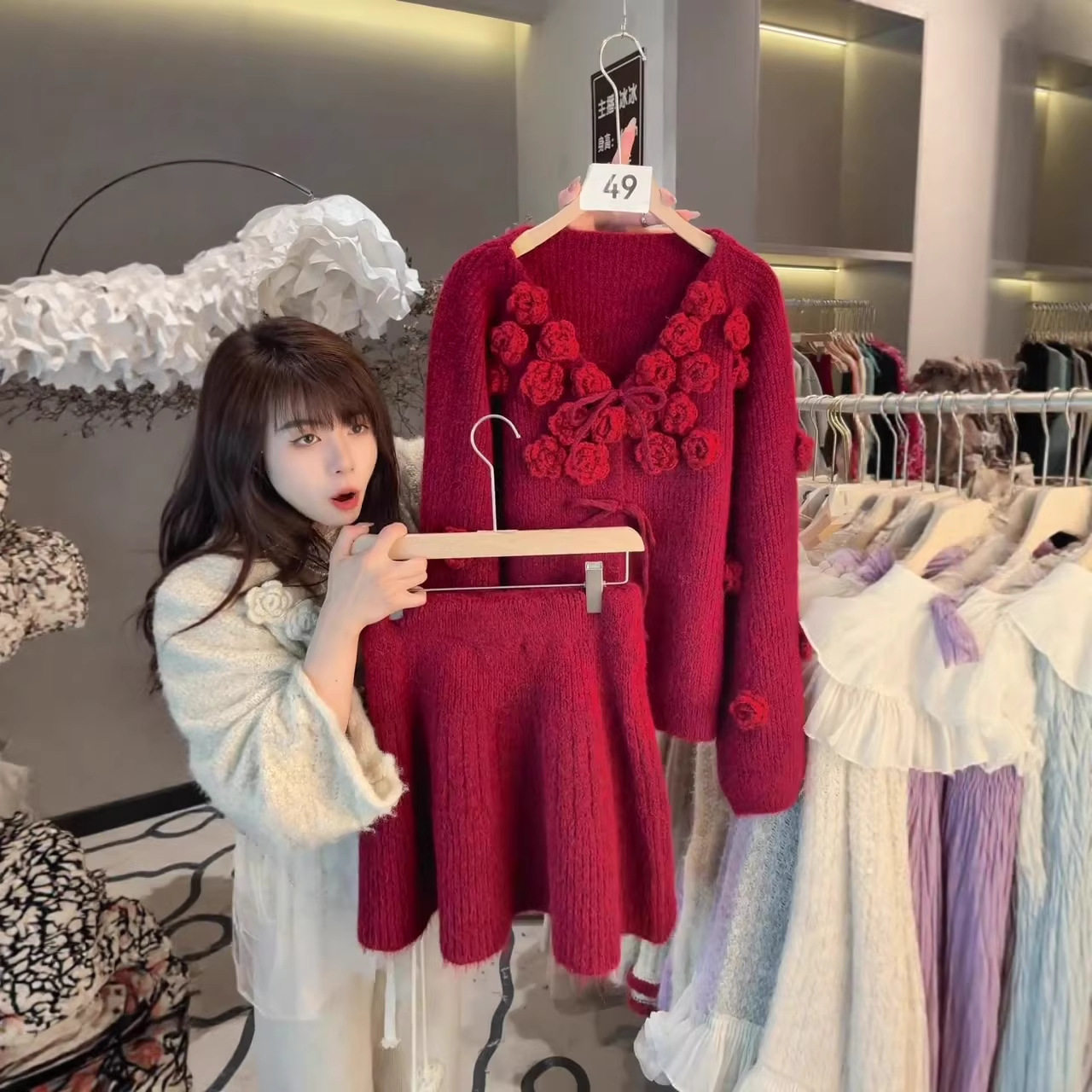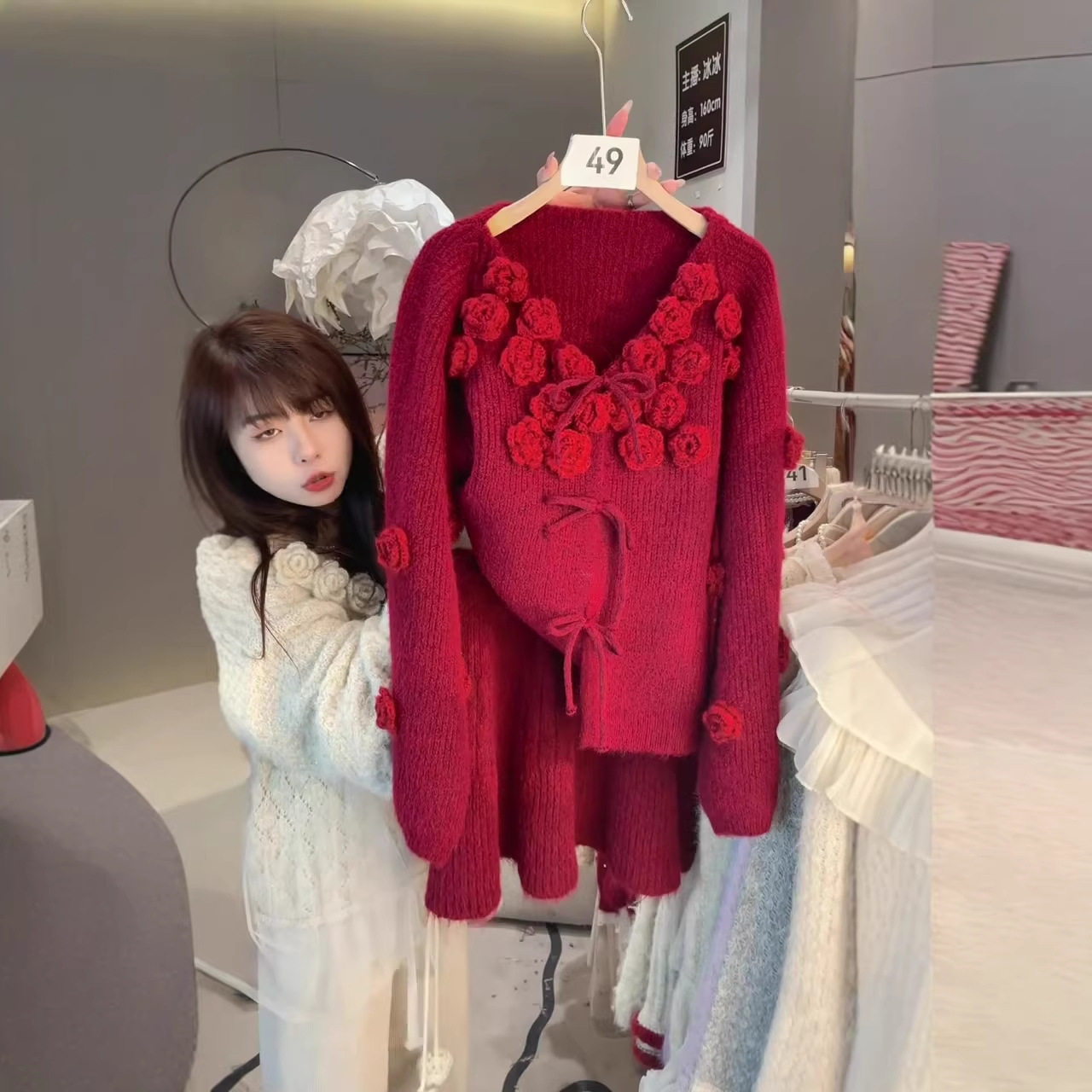 2026秋冬新款韩系手工花朵系带V领套头毛衣+高腰半身裙两件套装
