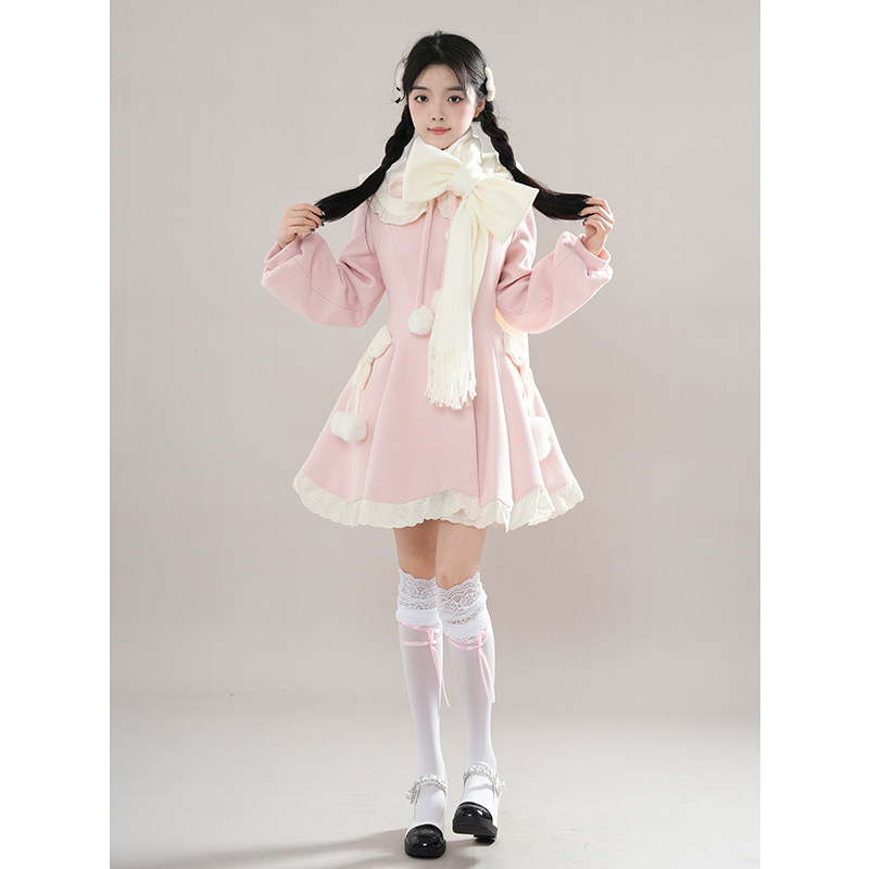 秋冬甜美风小个子围巾花边娃娃领毛球系带毛呢外套2025秋冬新款女