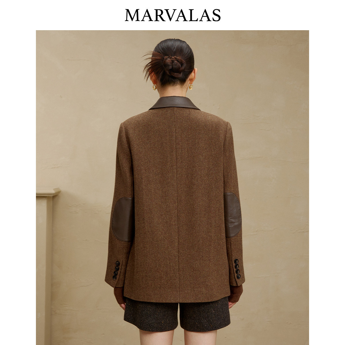 【粉丝专属】曼德诗绵羊毛西服2025冬季新款人字纹拼皮设计美拉德