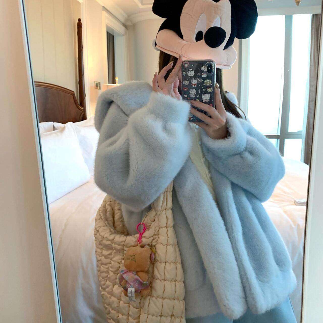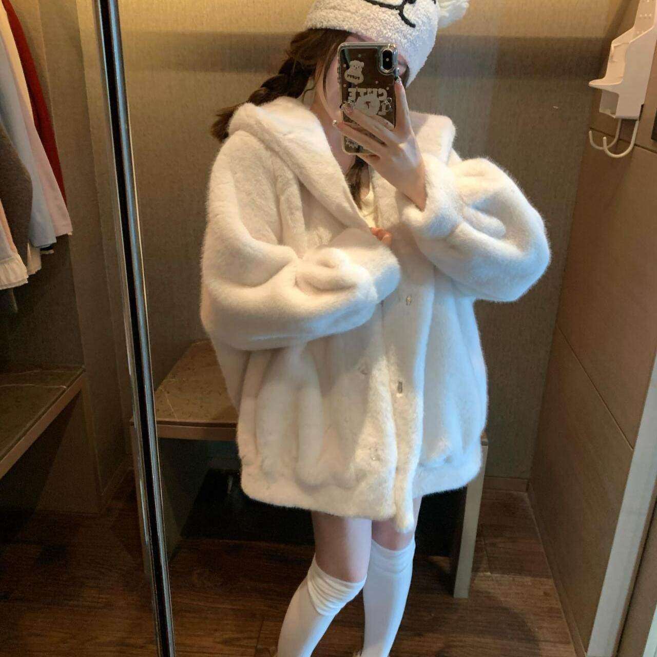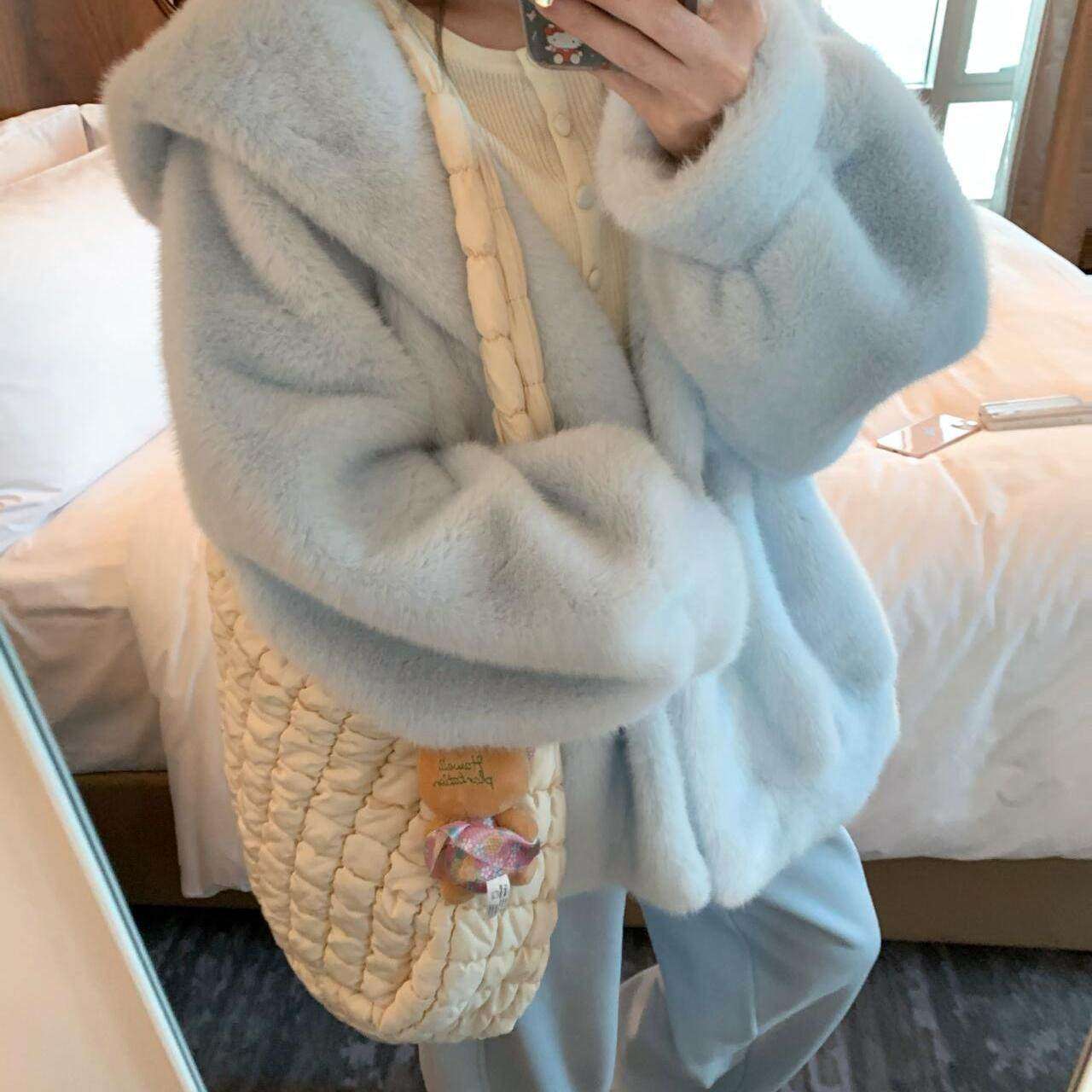 冬软乎乎宽松连帽显瘦保暖毛毛外套彷皮草淡蓝色减龄环保戴帽外套