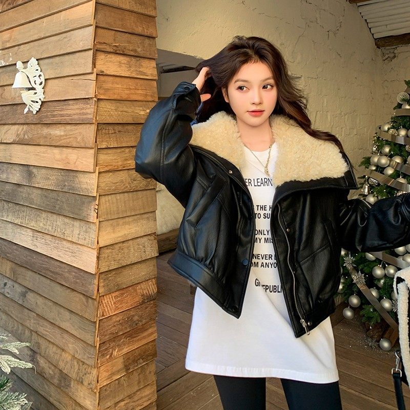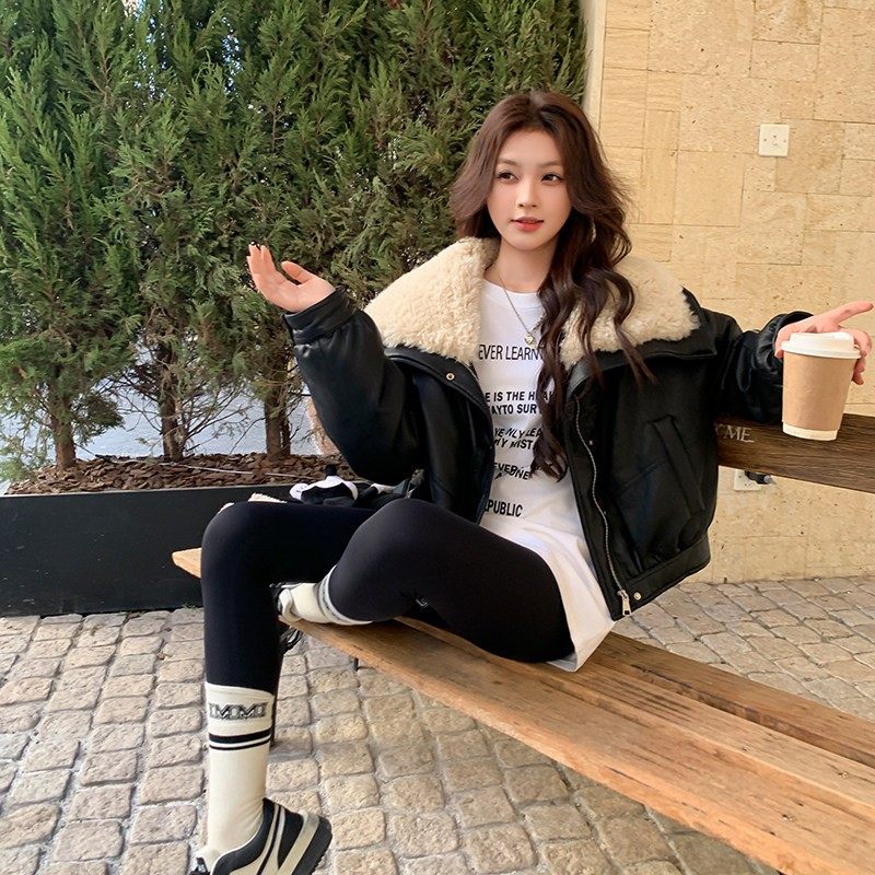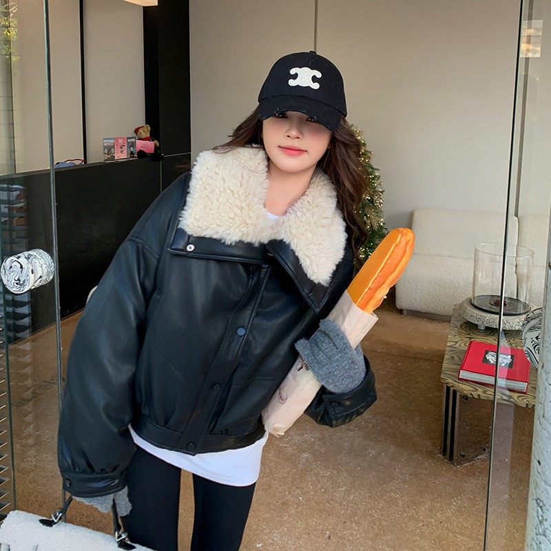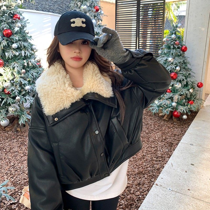 复古黑色皮衣羽绒服女2025冬季新款羊羔毛大翻领90白鸭绒PU皮外套