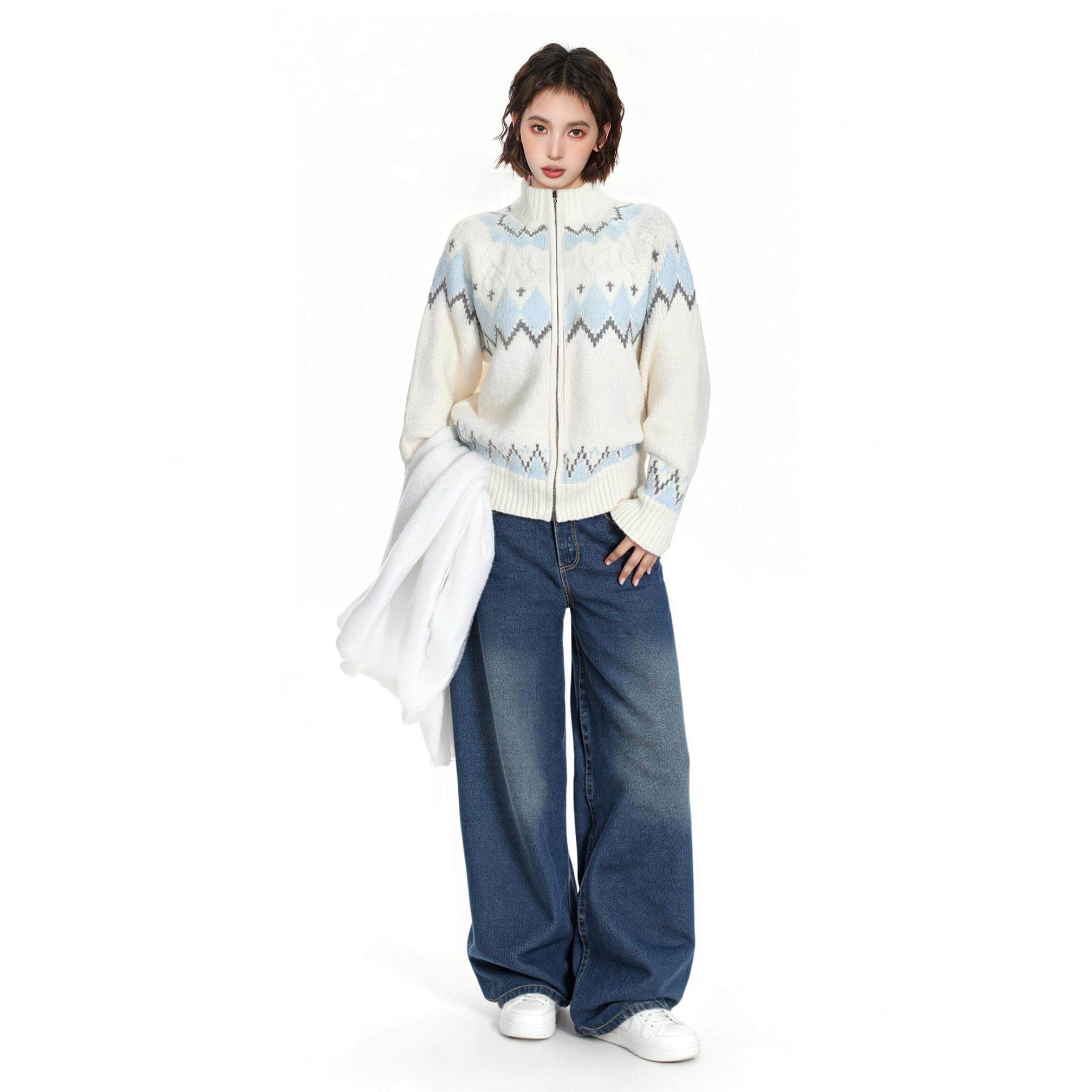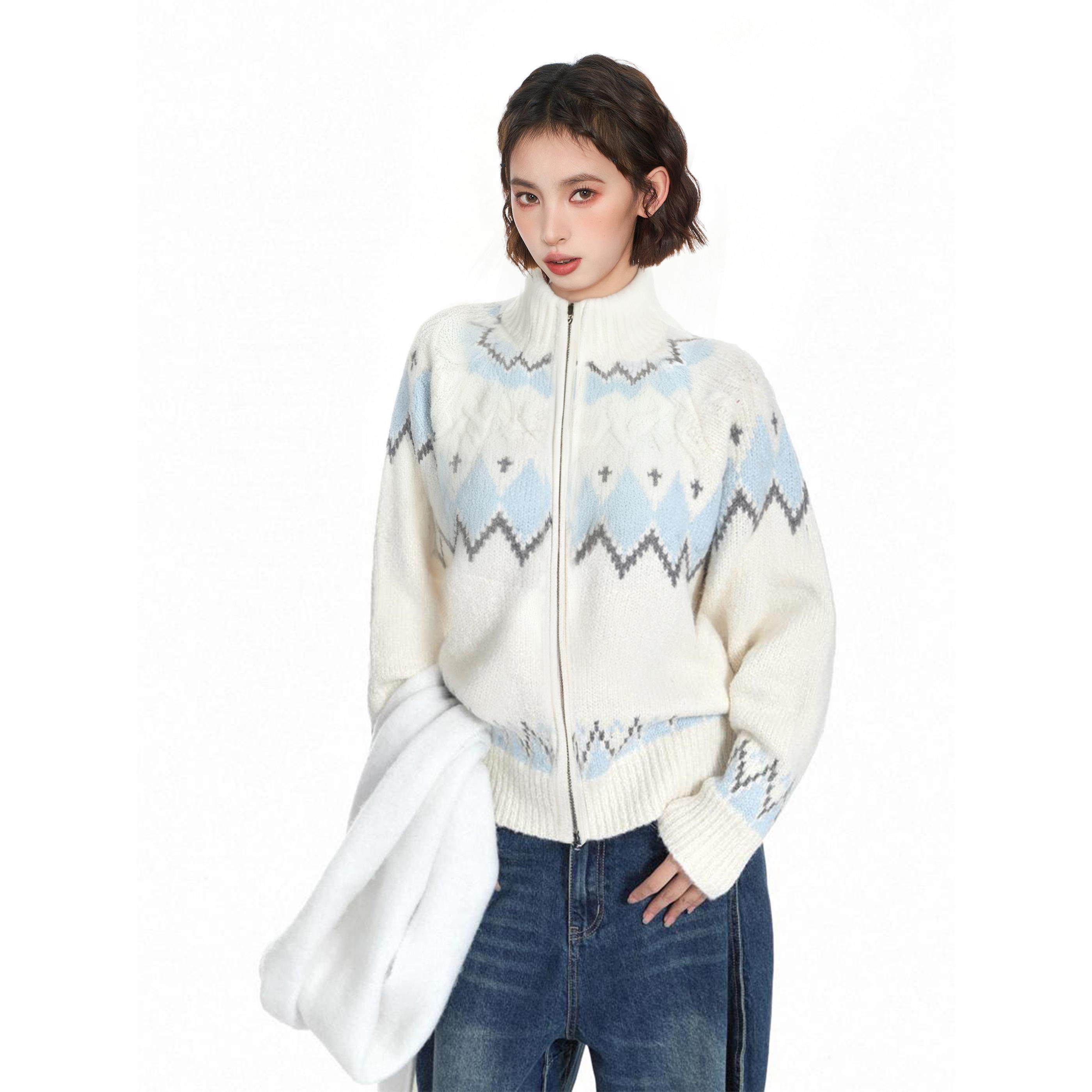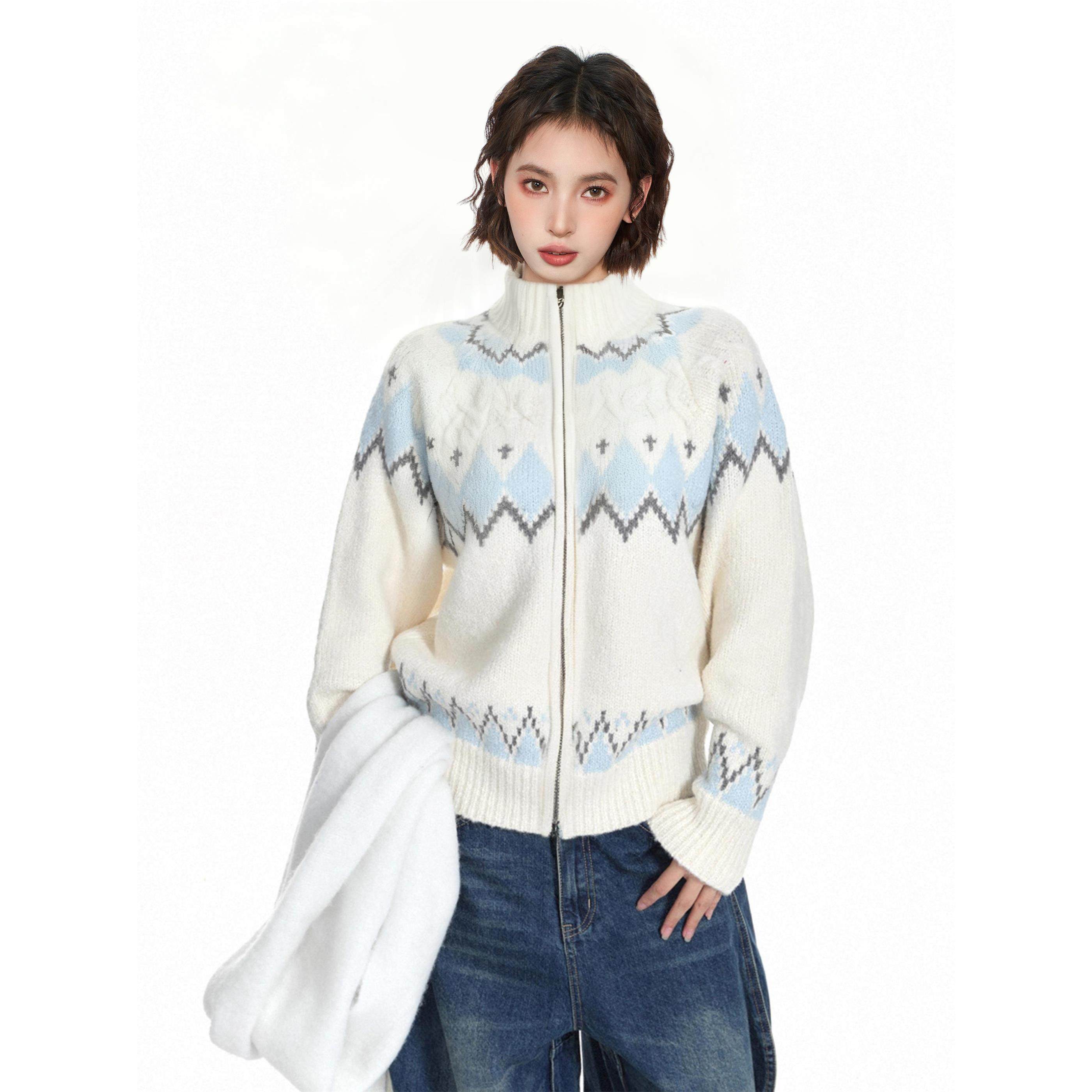 费尔岛白色高领拉炼毛衣外套女秋冬季软糯慵懒高级感加厚针织开衫