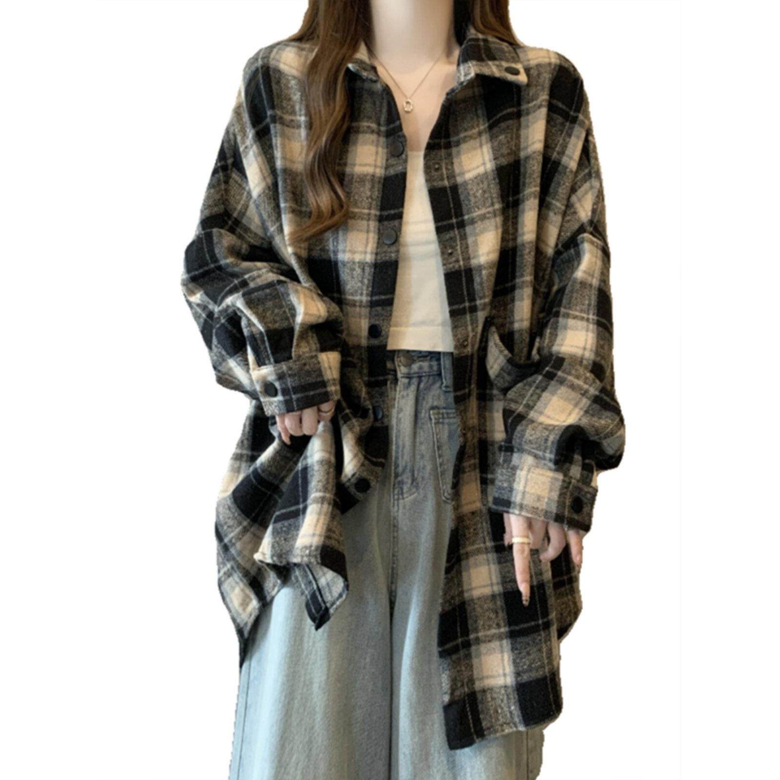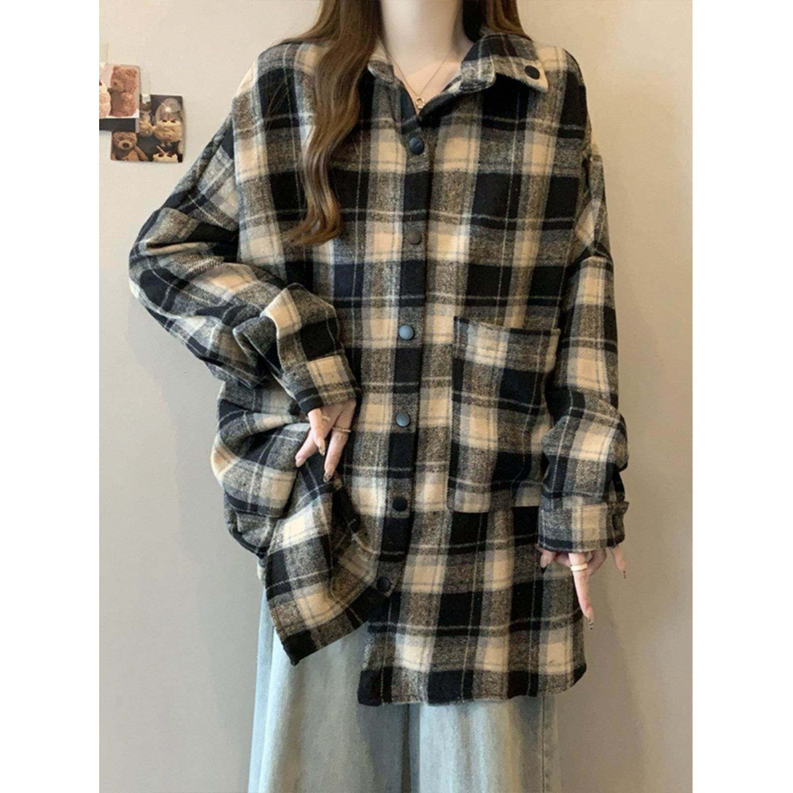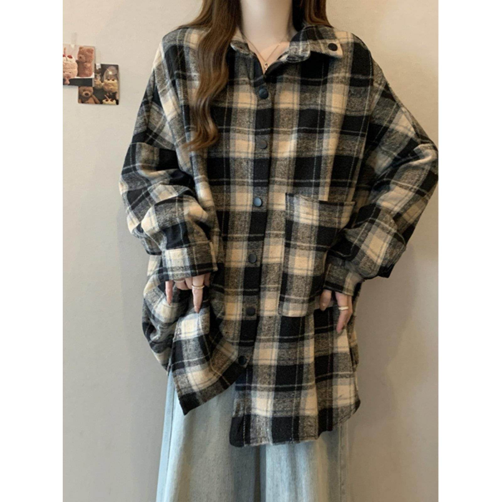 复古格子毛呢衬衫外套女款秋季慵懒风大码加厚中长款衬衣开衫上衣
