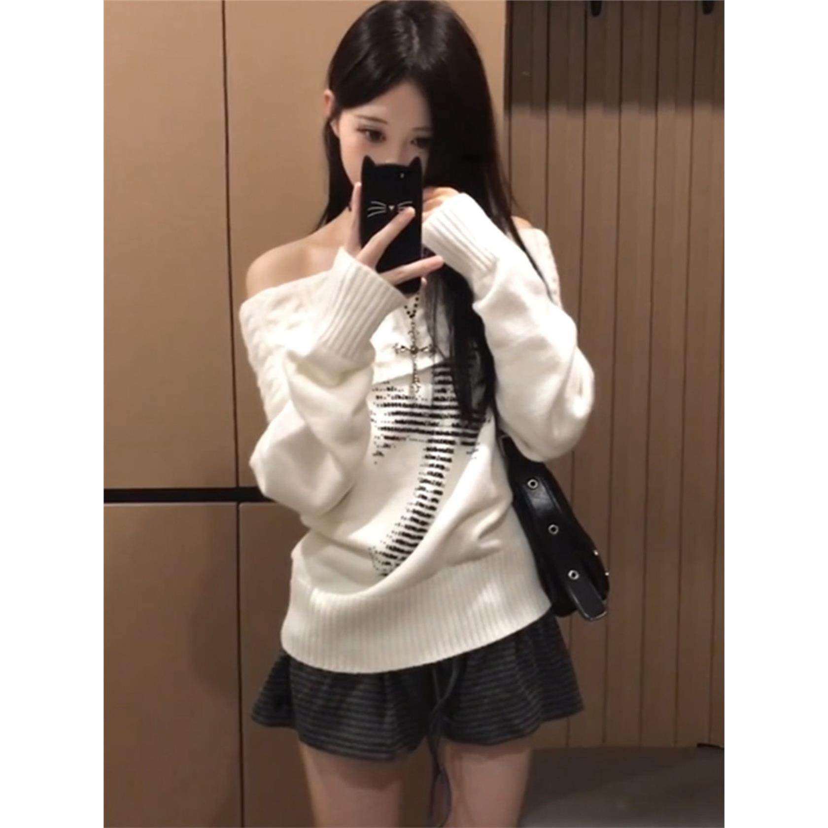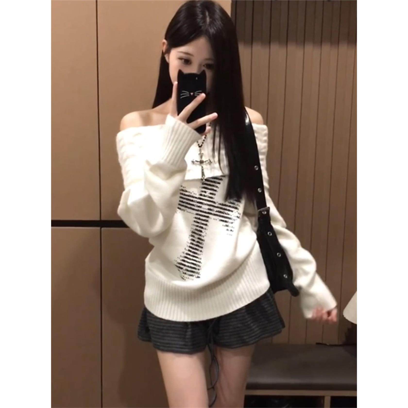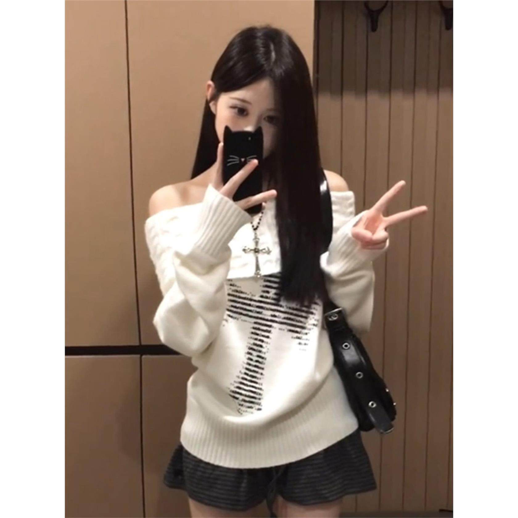 美式覆古一字肩套头长袖针织衫女春秋修身显瘦毛衣外穿休闲外套潮