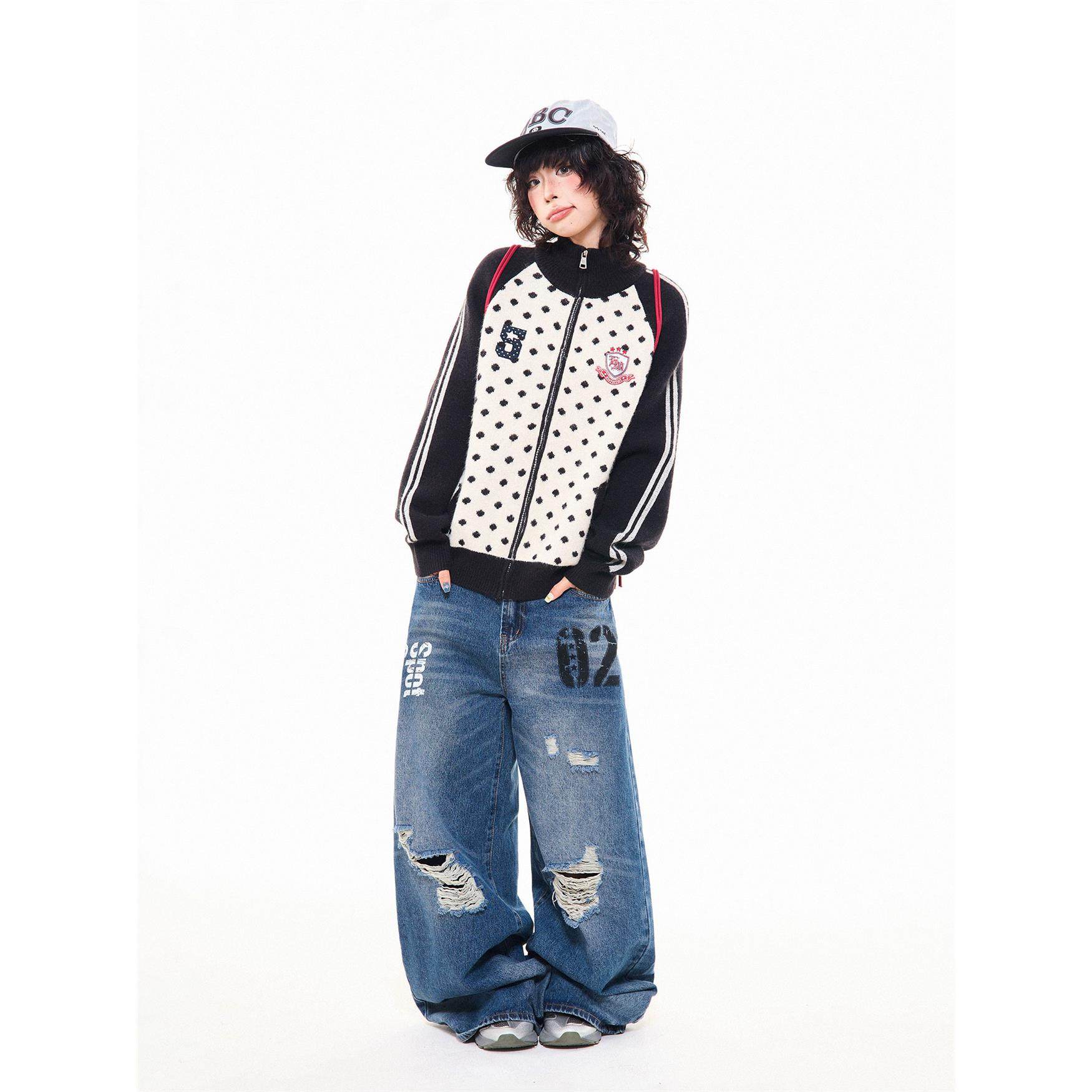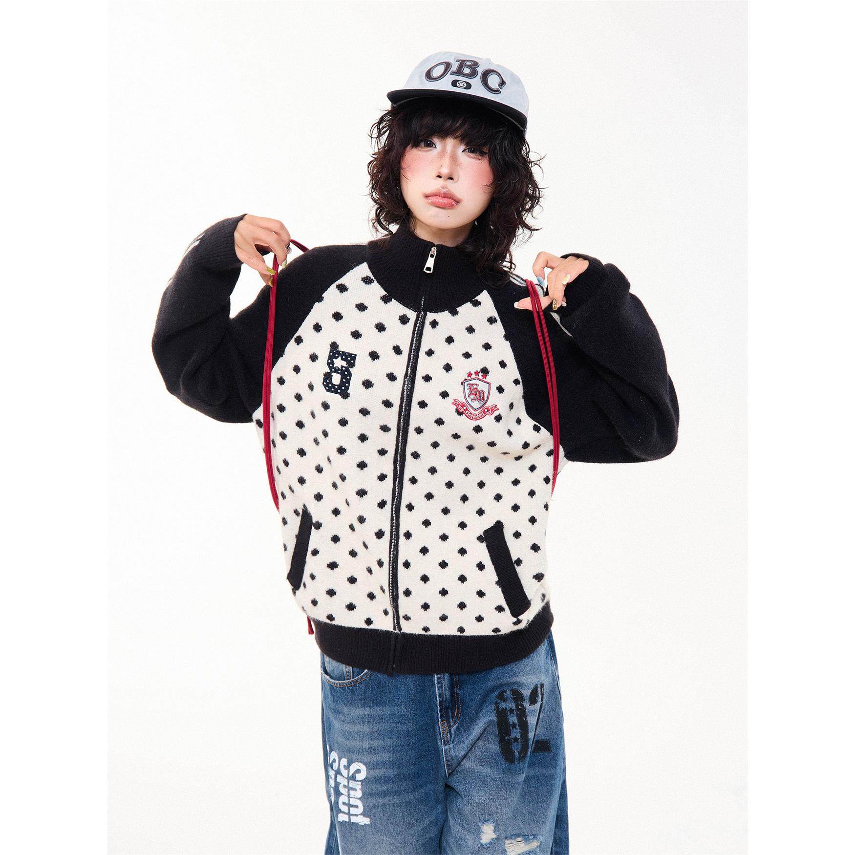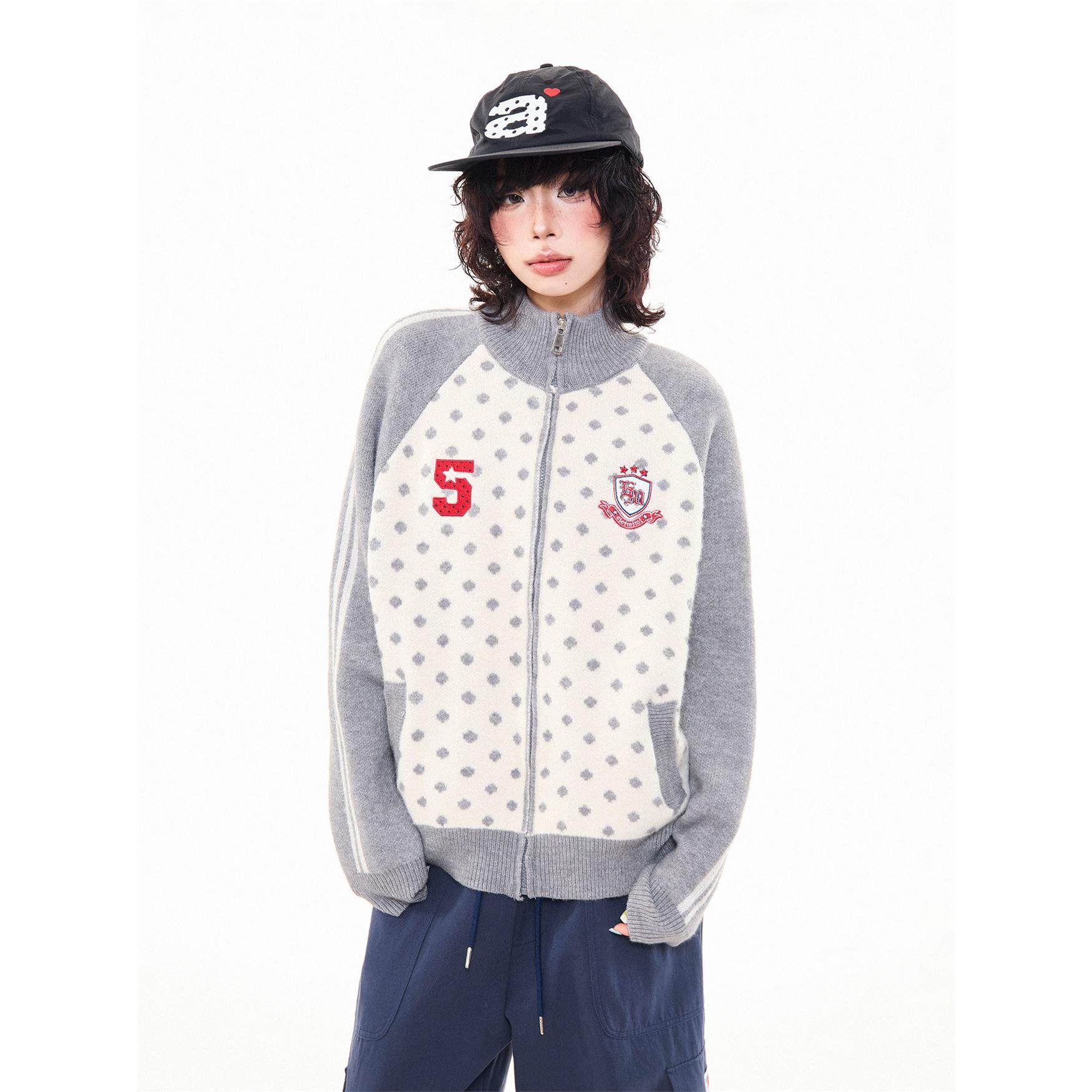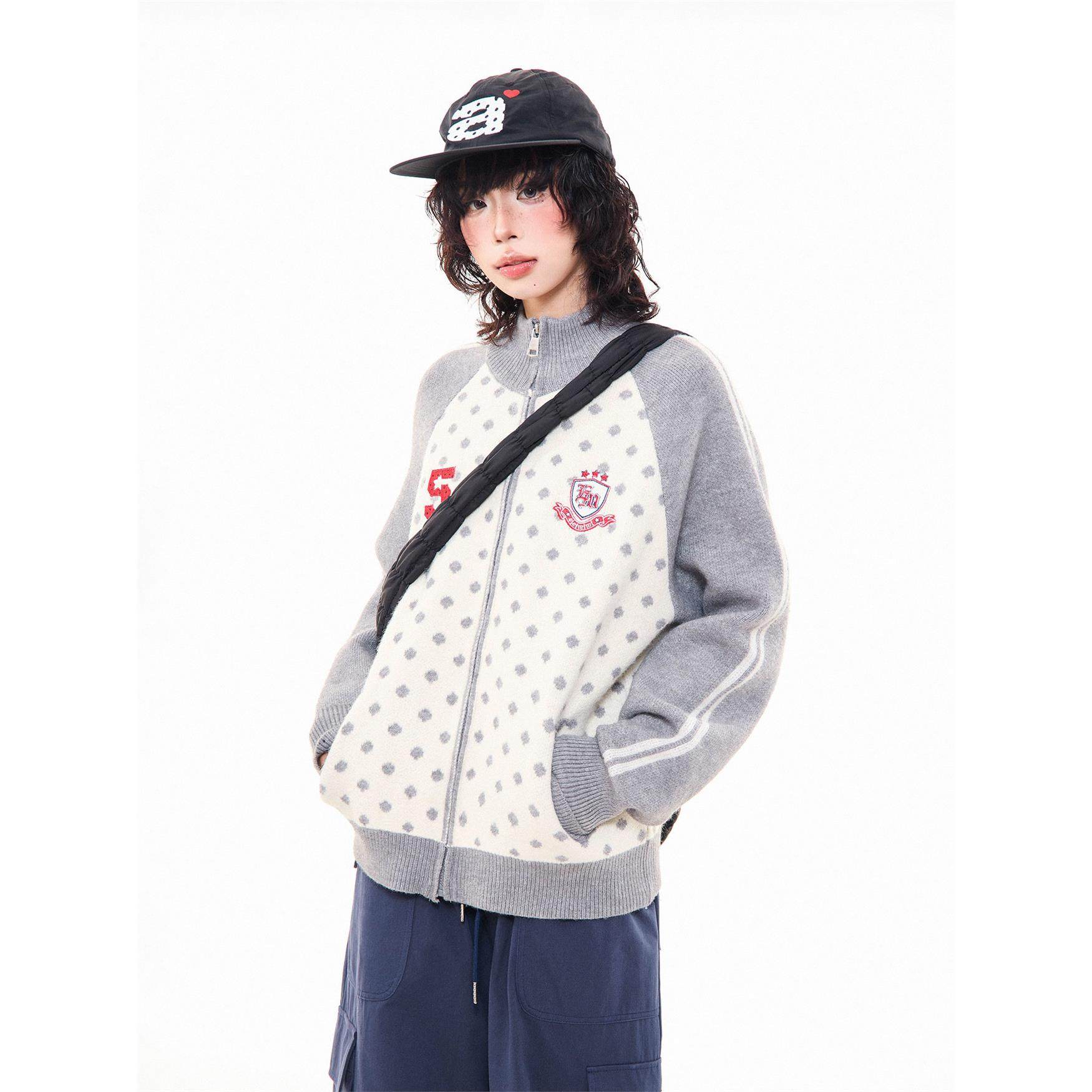 MKGO 美式覆古波点贴布绣开衫毛衣女秋季宽松拼色插肩袖针织外套