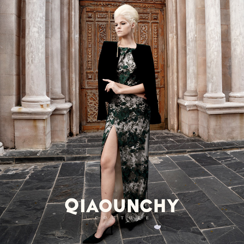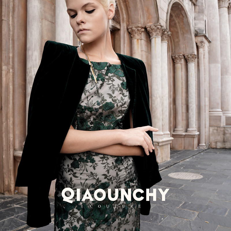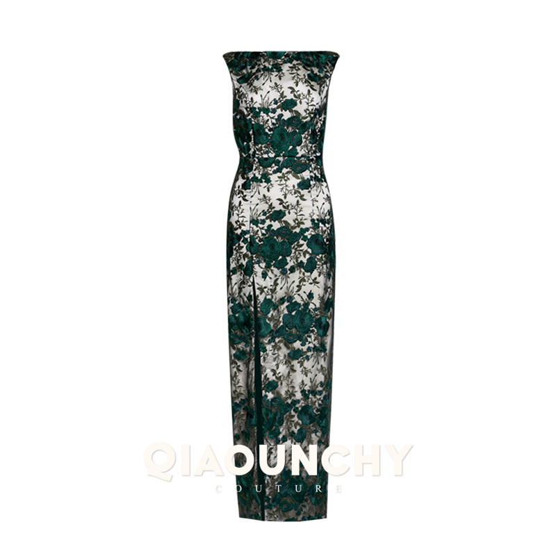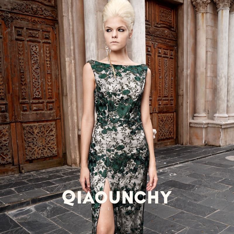 精工刺绣 QIAOUNCHY俏云曦 | 翡翠绿牡丹花一字领高腰连衣裙早秋