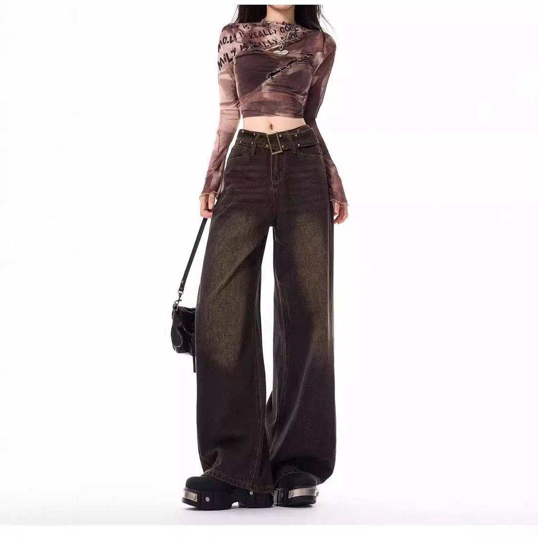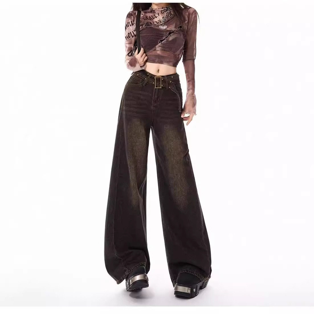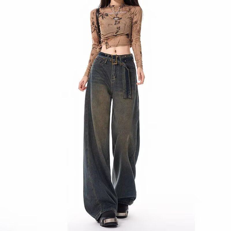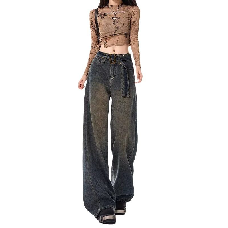 春夏秋季美式复古设计感牛仔裤女新款高腰水洗怀旧直筒阔腿长裤子