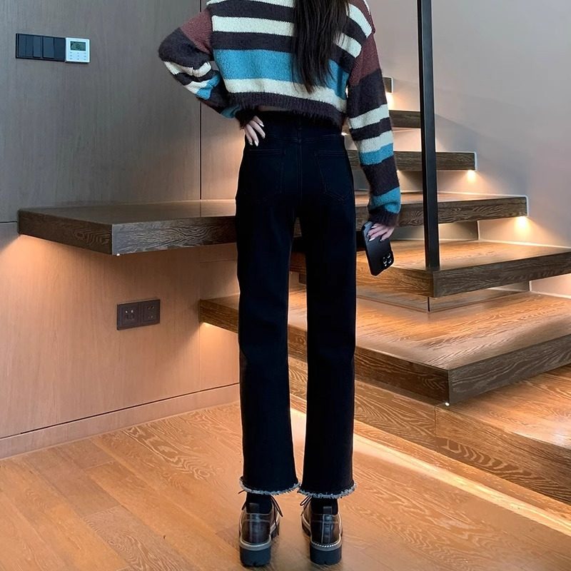 大码黑色直筒加绒牛仔裤女2024秋冬新款百搭高腰显瘦法棍烟管裤潮