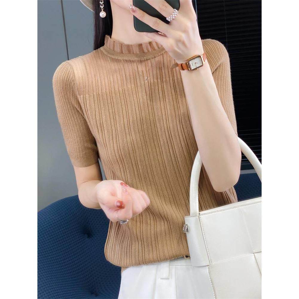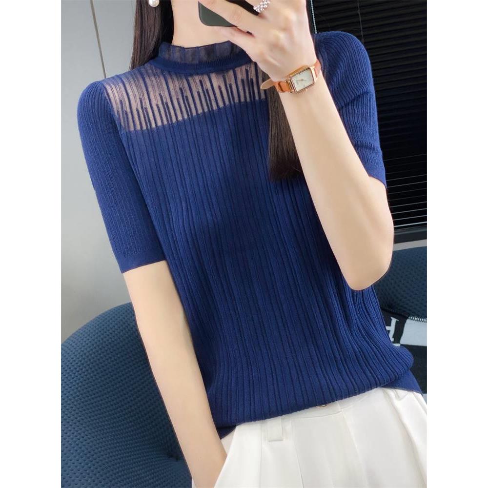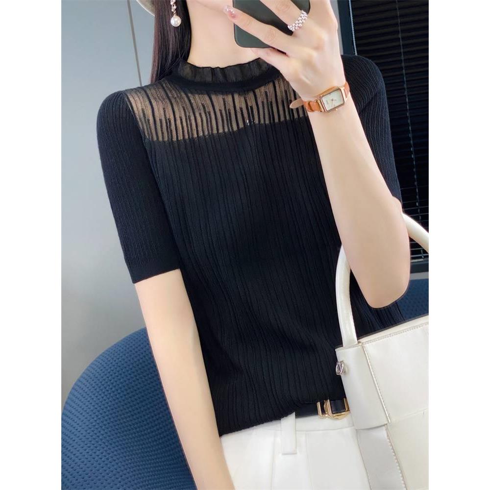 蕾丝花边短袖t恤修身显瘦丝光羊毛衫薄款针织打底衫春夏百搭上衣