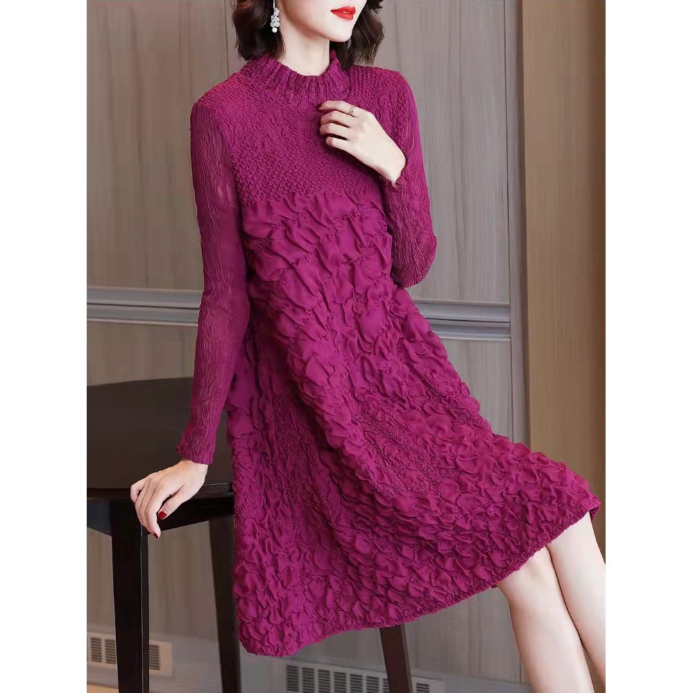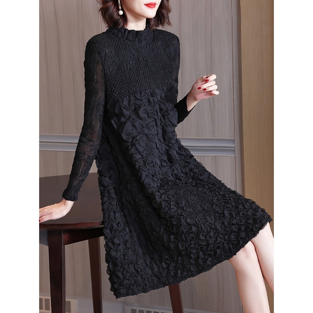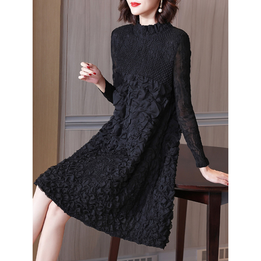 省钱风2025春季长袖褶皱刺绣连衣裙女套头大码中长款a字裙DCA635