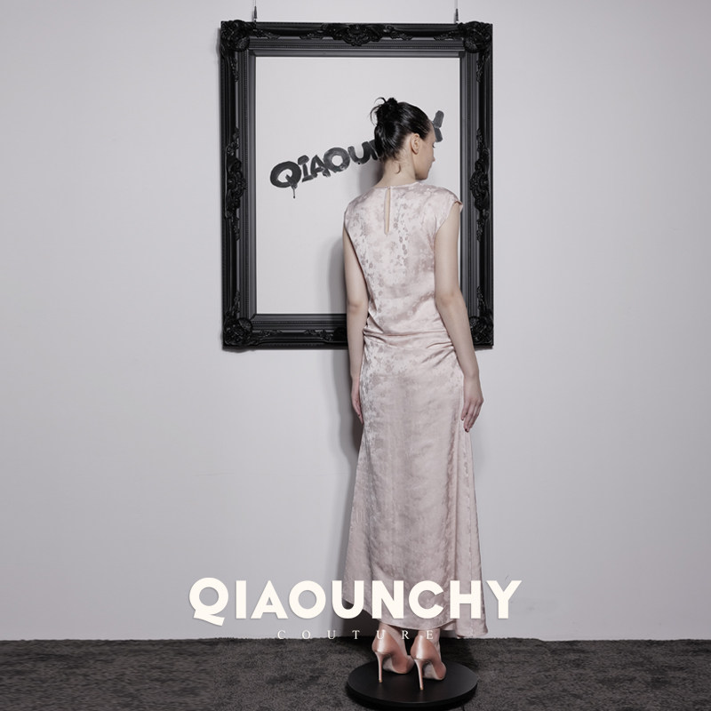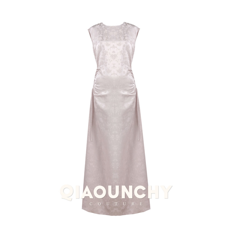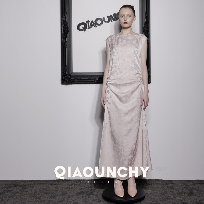 苏杭丝绸 QIAOUNCHY俏云曦 | 25早秋优雅香槟粉提花抽绳连衣裙