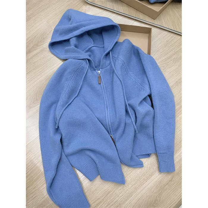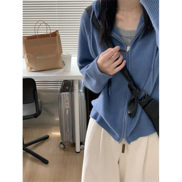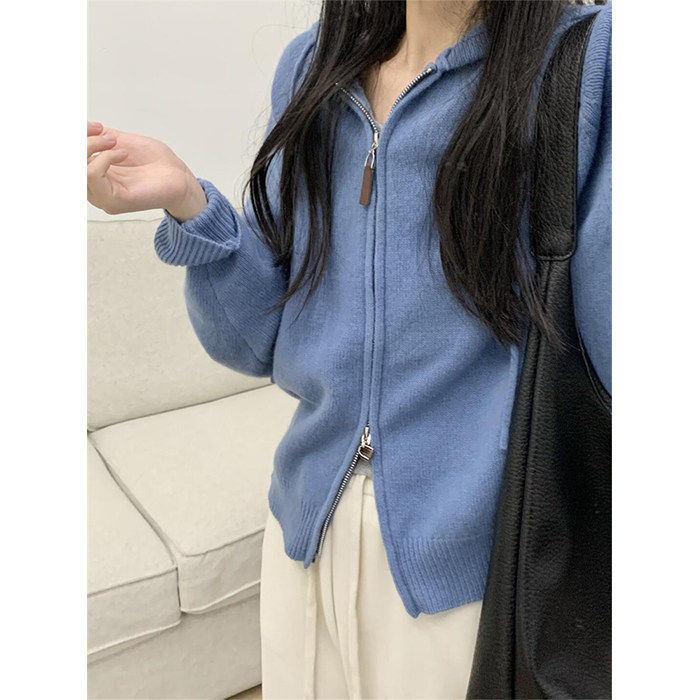慵懒风短款蓝色拉链毛衣女 加厚开衫外套 2024年新款通勤穿搭