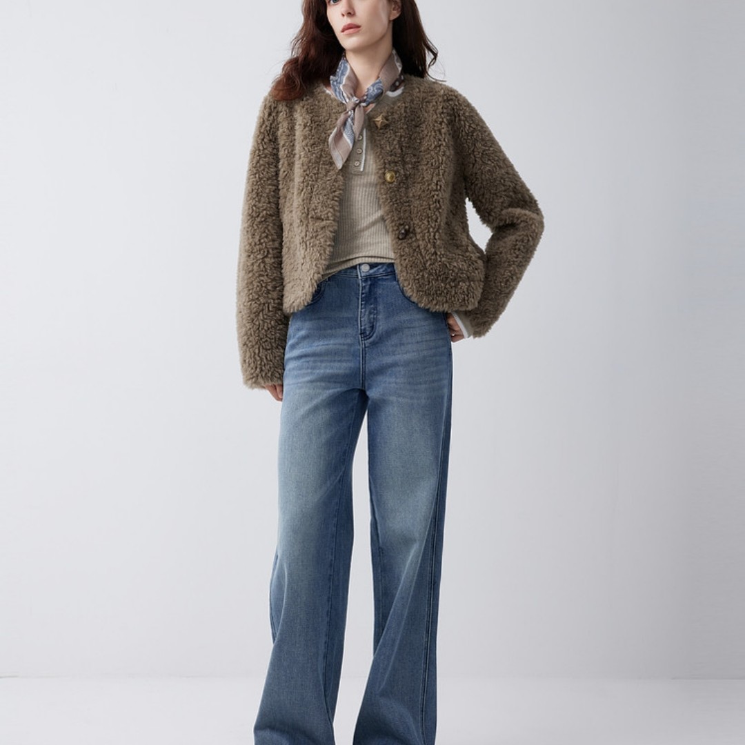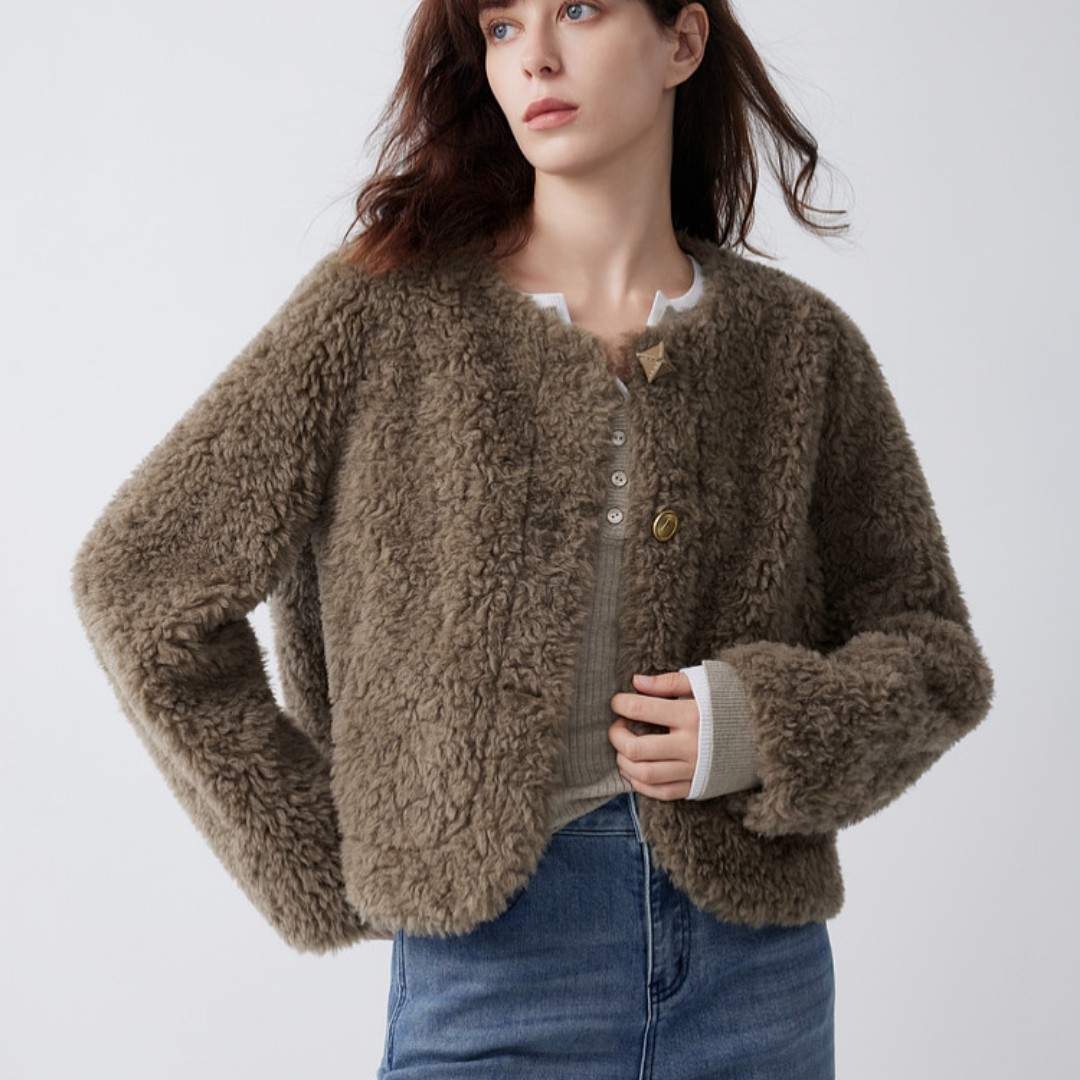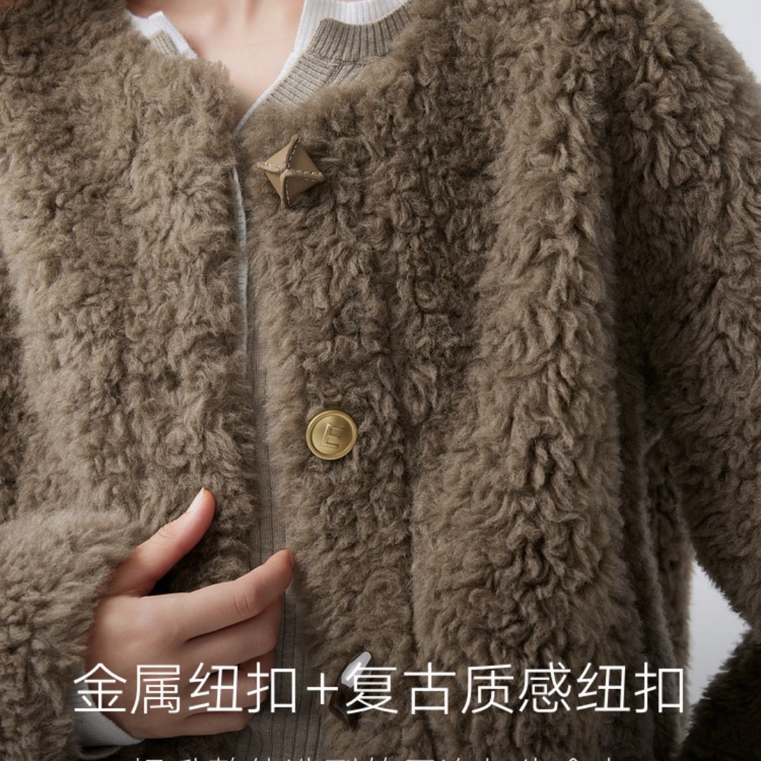 官图 实价 绵羊毛咖色复古毛绒短外套2025冬小香风羊羔毛上衣