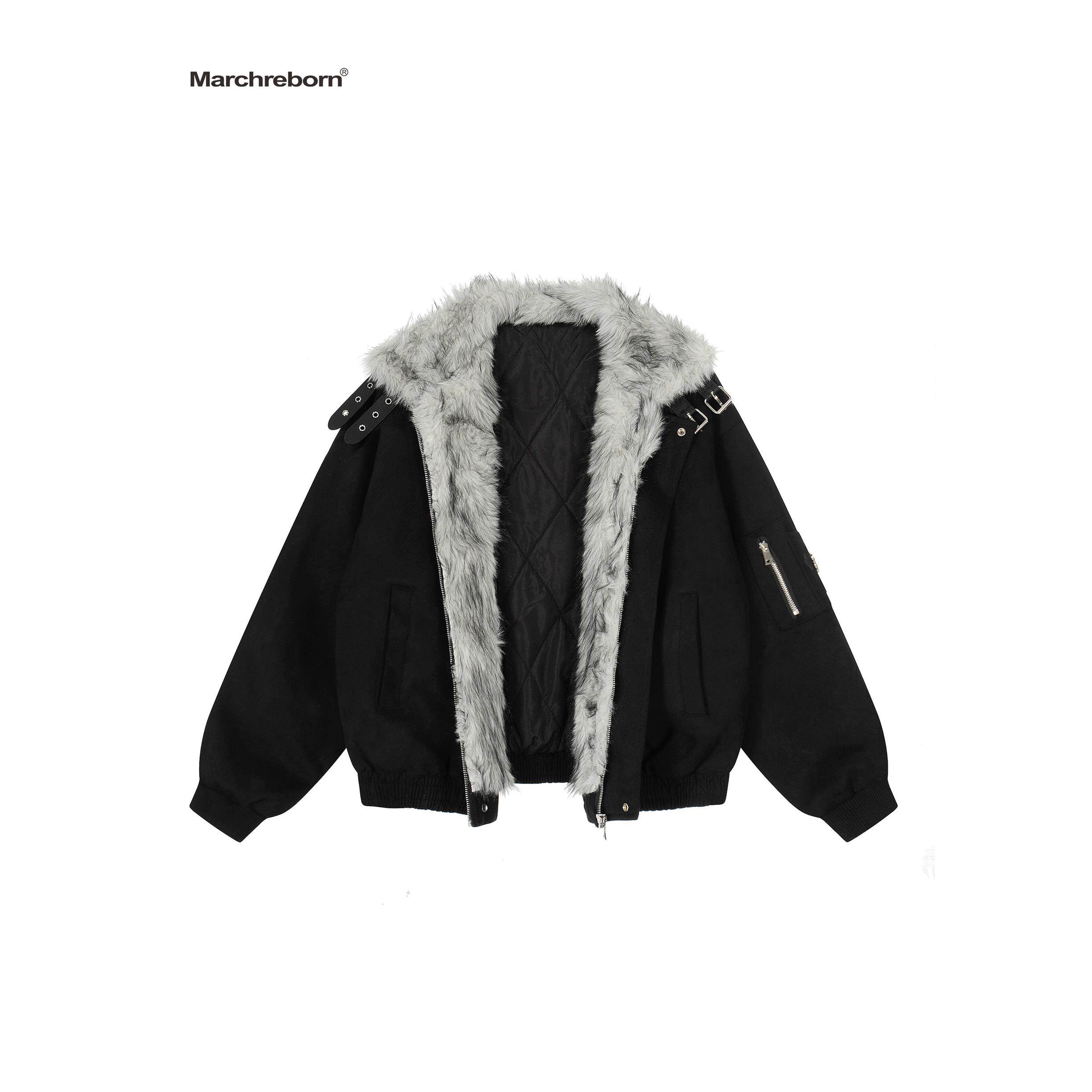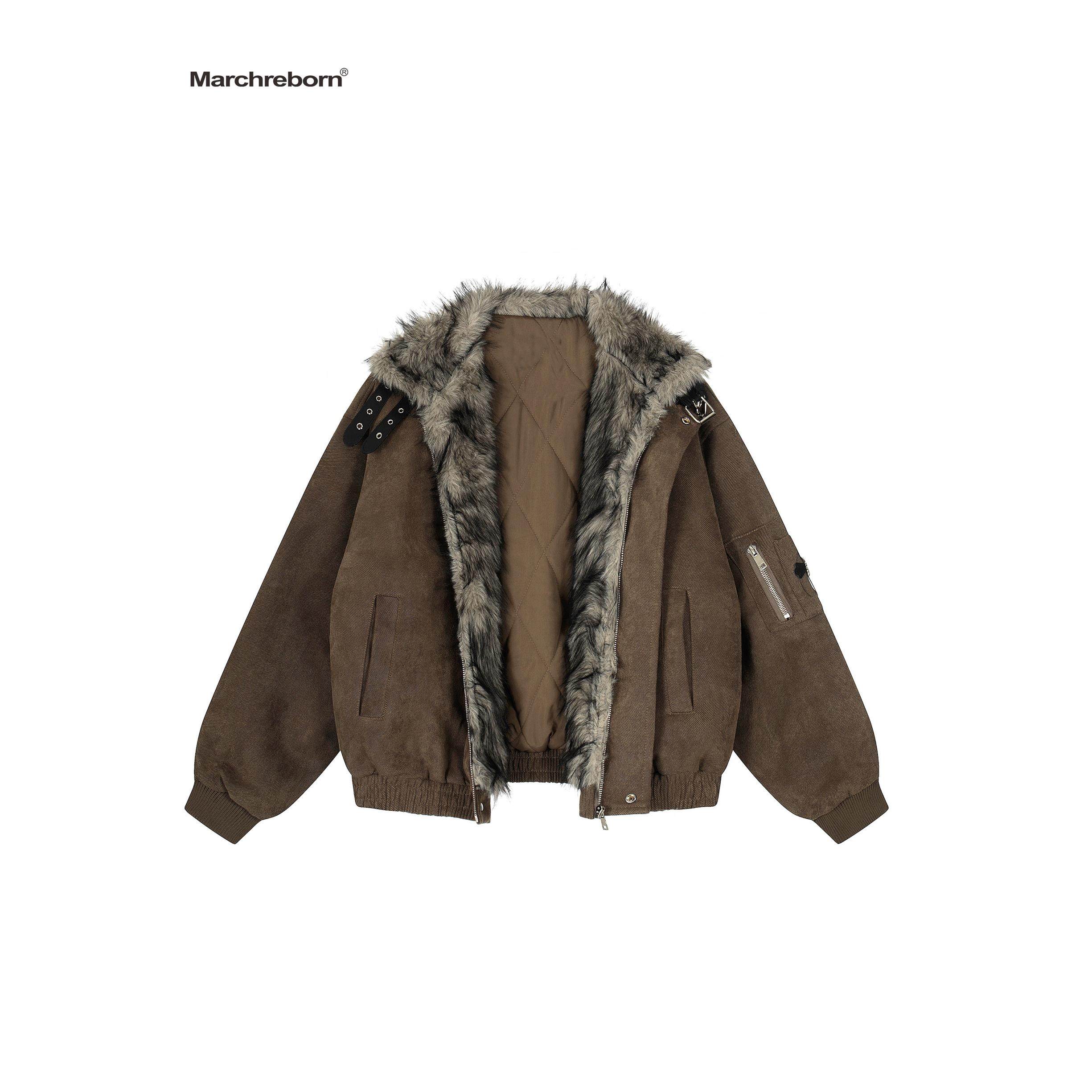 MARCH 美式覆古十字架毛领座山雕棉服外套女冬季宽松加厚加绒夹克