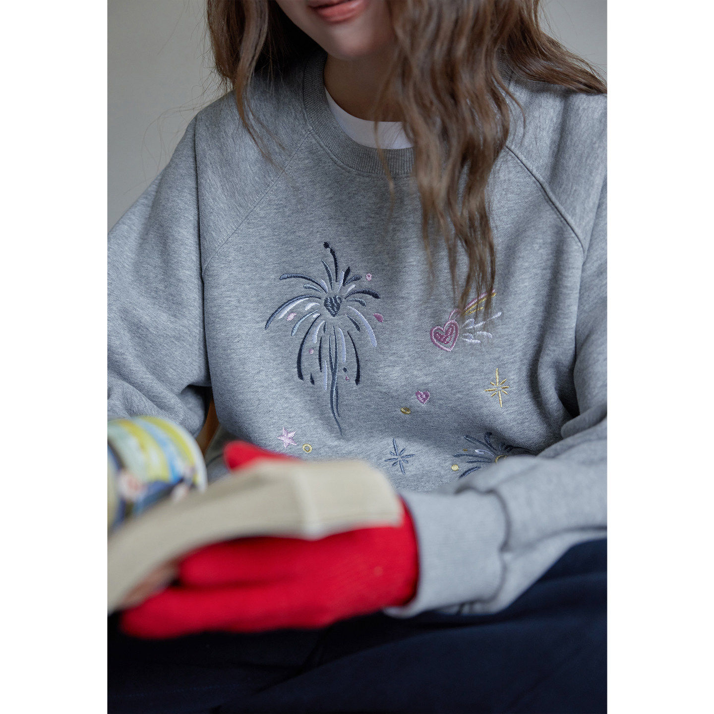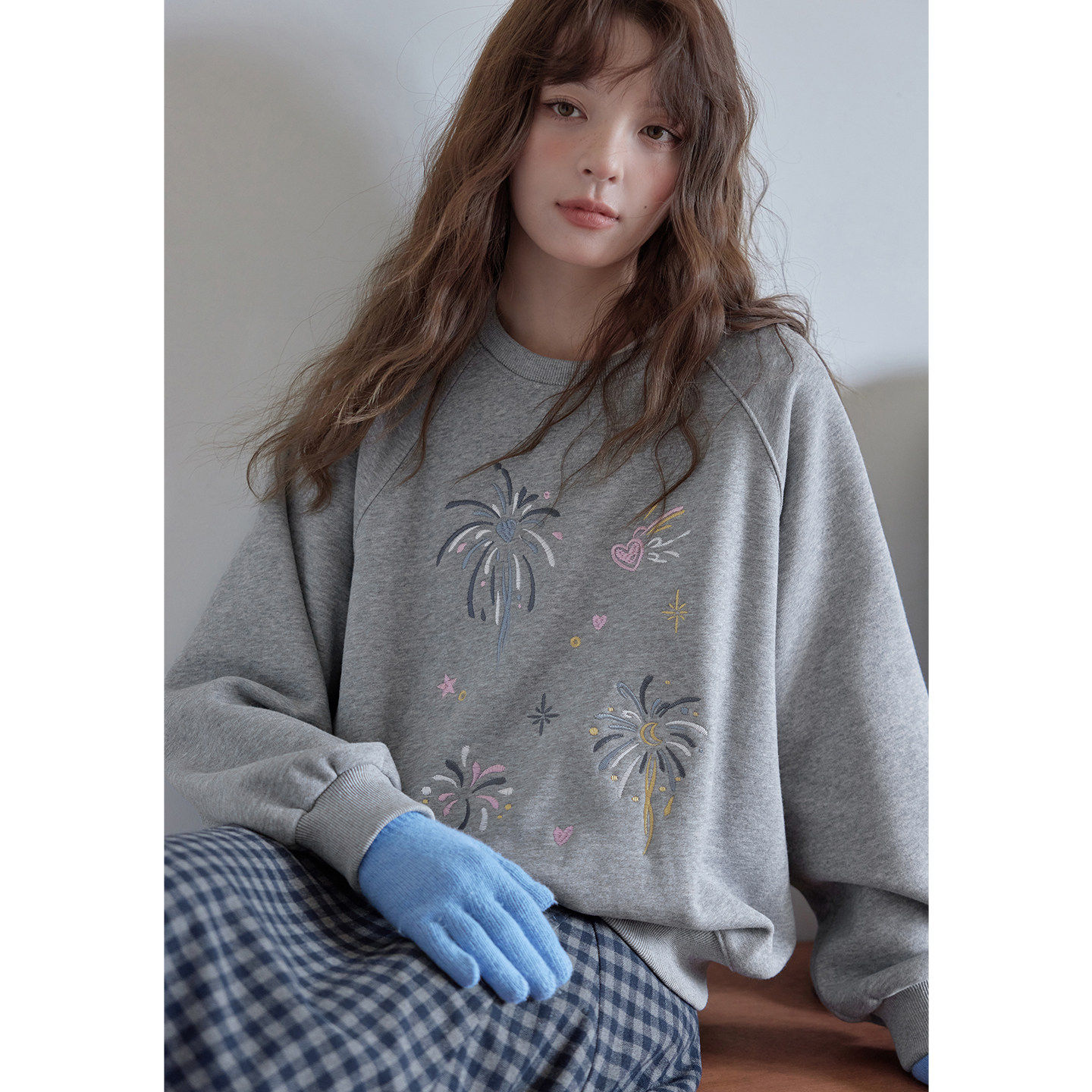 Momolife彩色烟花刺绣灰色插肩长袖2025女冬套头加绒保暖宽松卫衣