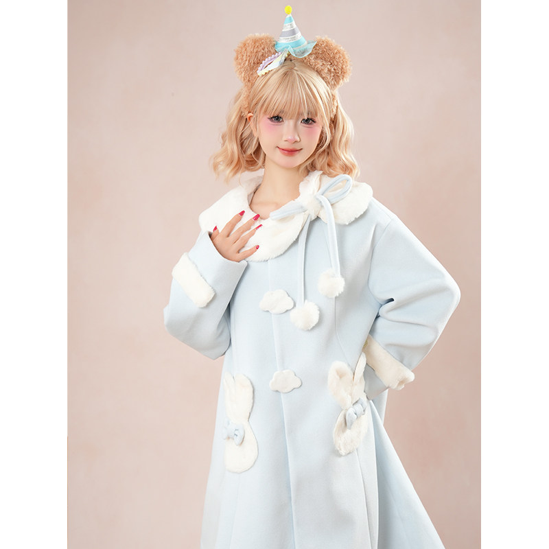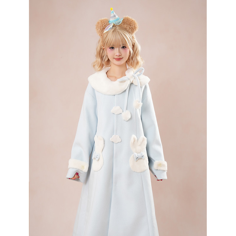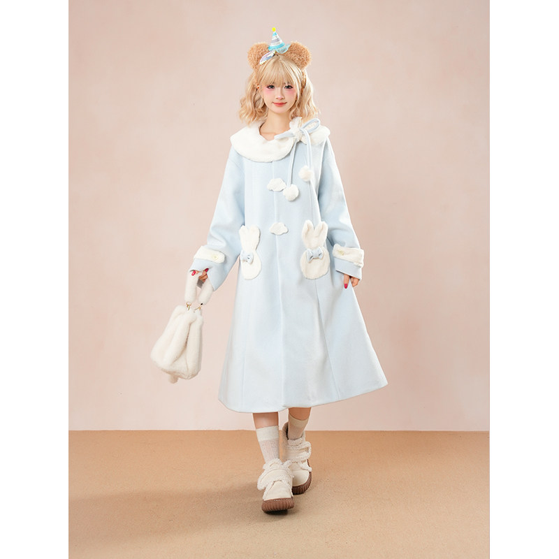 牛奶海盐 蓝色小兔子毛呢外套冬日甜美穿搭拼接撞色翻领呢子大衣