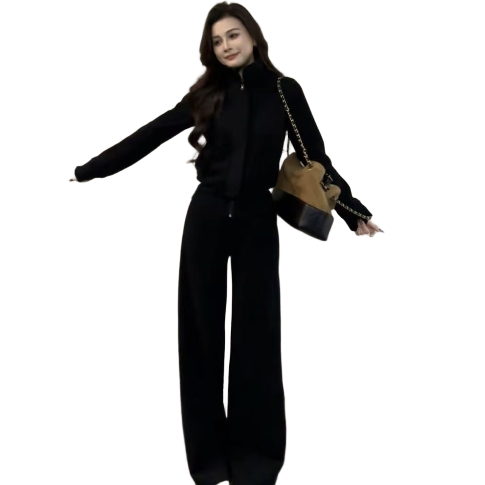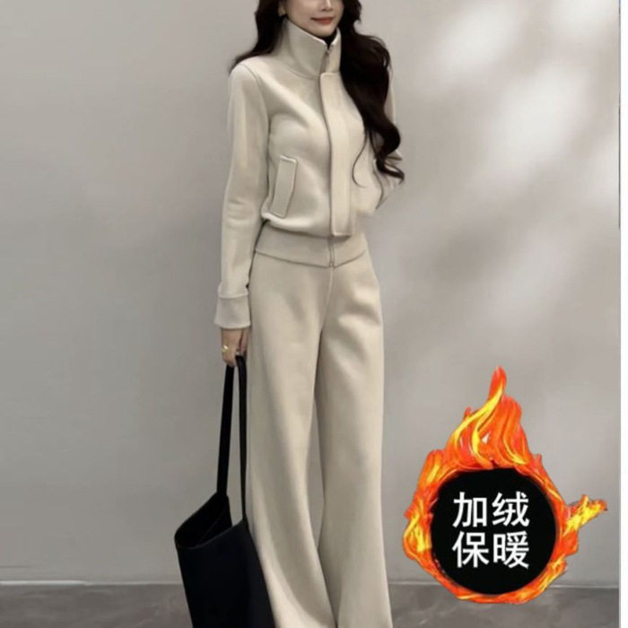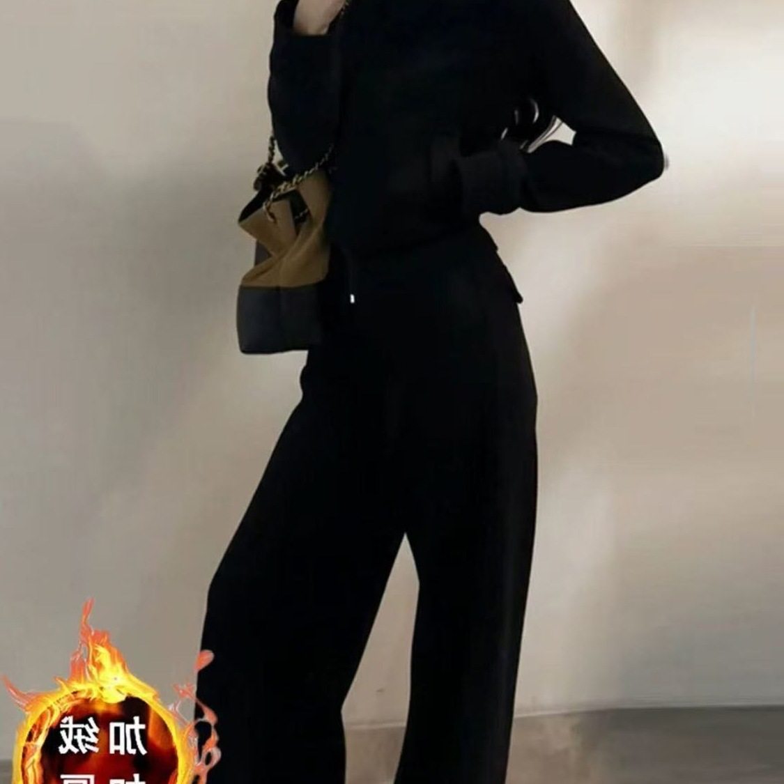 冬季穿搭一整套女高级感新款立领加厚加绒卫衣+阔腿裤两件套
