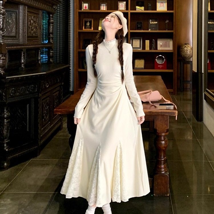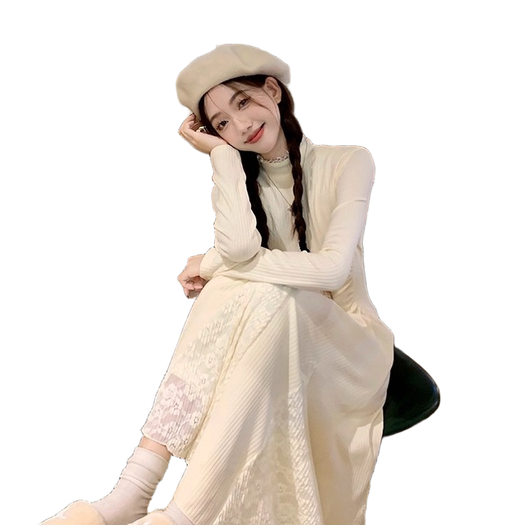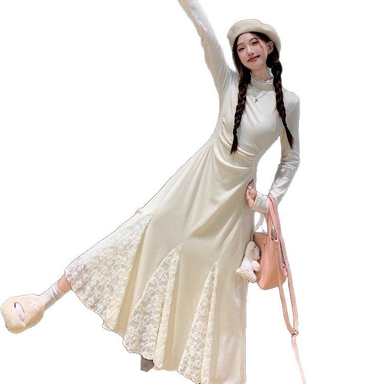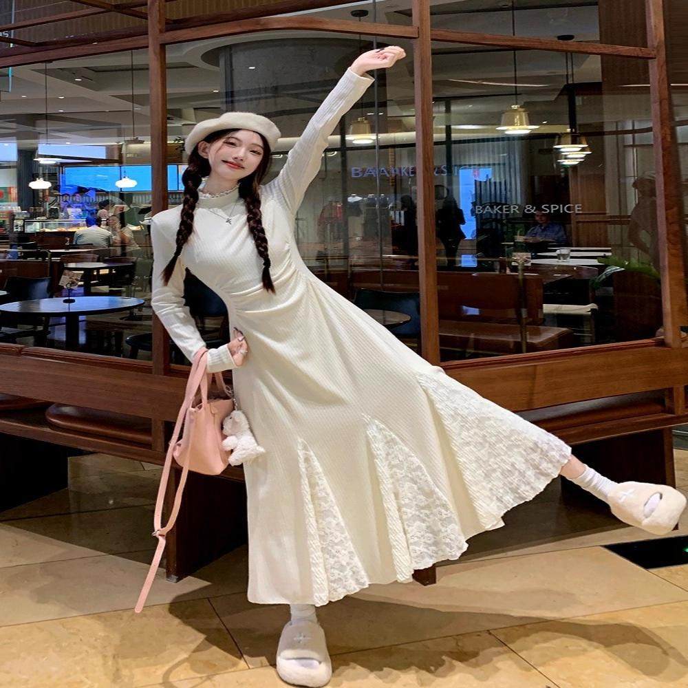 小个子针织连衣裙春秋款长袖蕾丝拼接鱼尾裙收腰半高领内搭毛衣裙