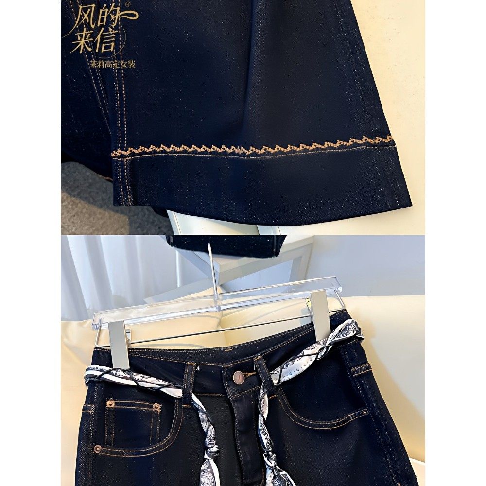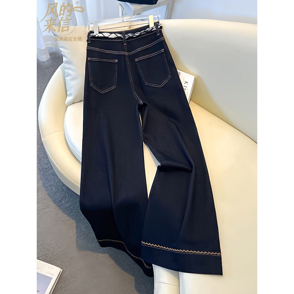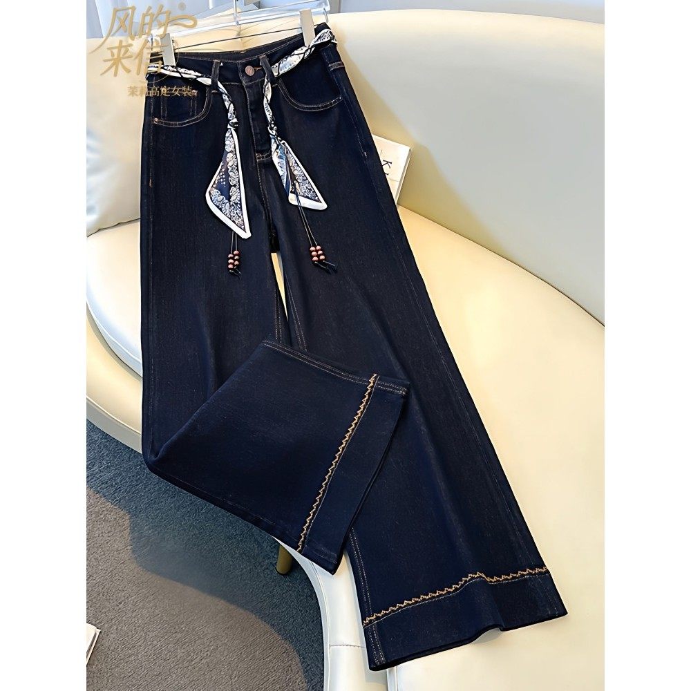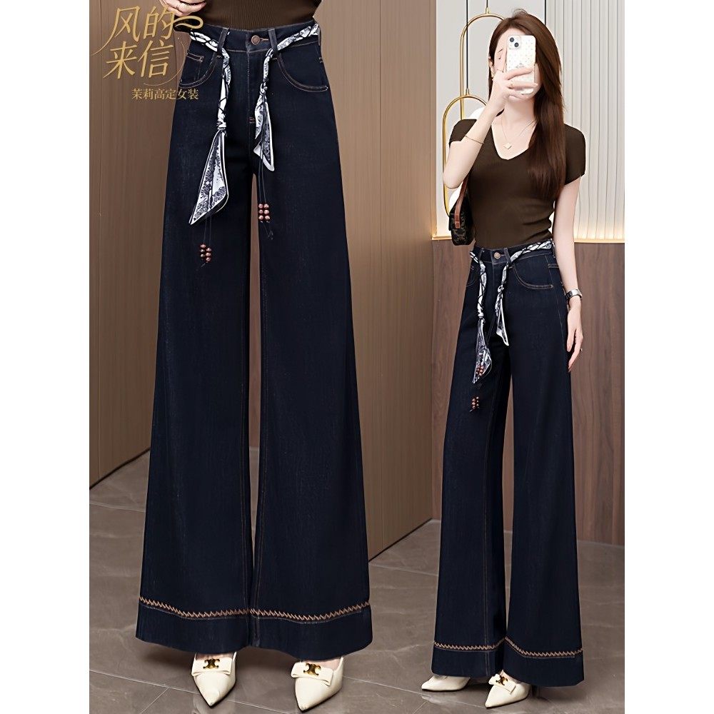 茉莉高定丹宁蓝微喇牛仔裤女2025秋冬新款高腰宽松加绒休闲阔腿裤